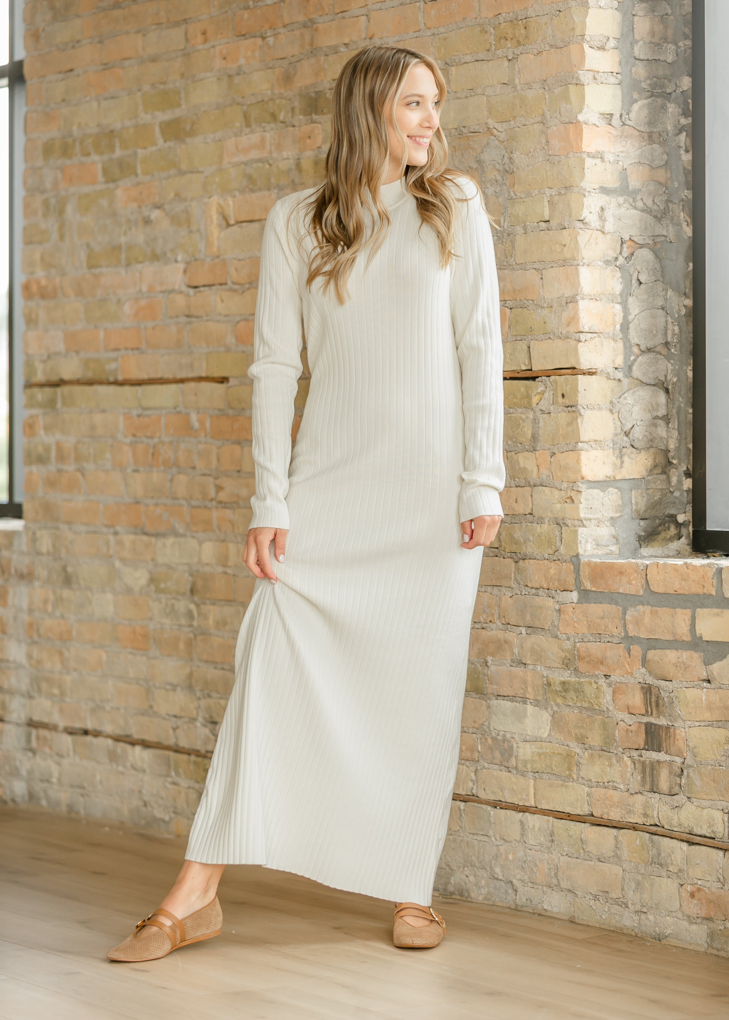 The Ashdon Ribbed Maxi Dress is a refined knit that blends comfort with understated elegance. Designed with a modest high neckline, long sleeves, and full-length silhouette, this dress features a soft ribbed texture that adds structure without bulk. Its easy fit and timeless cream hue make it a cozy, elevated go-to for cooler seasons and simple styling!