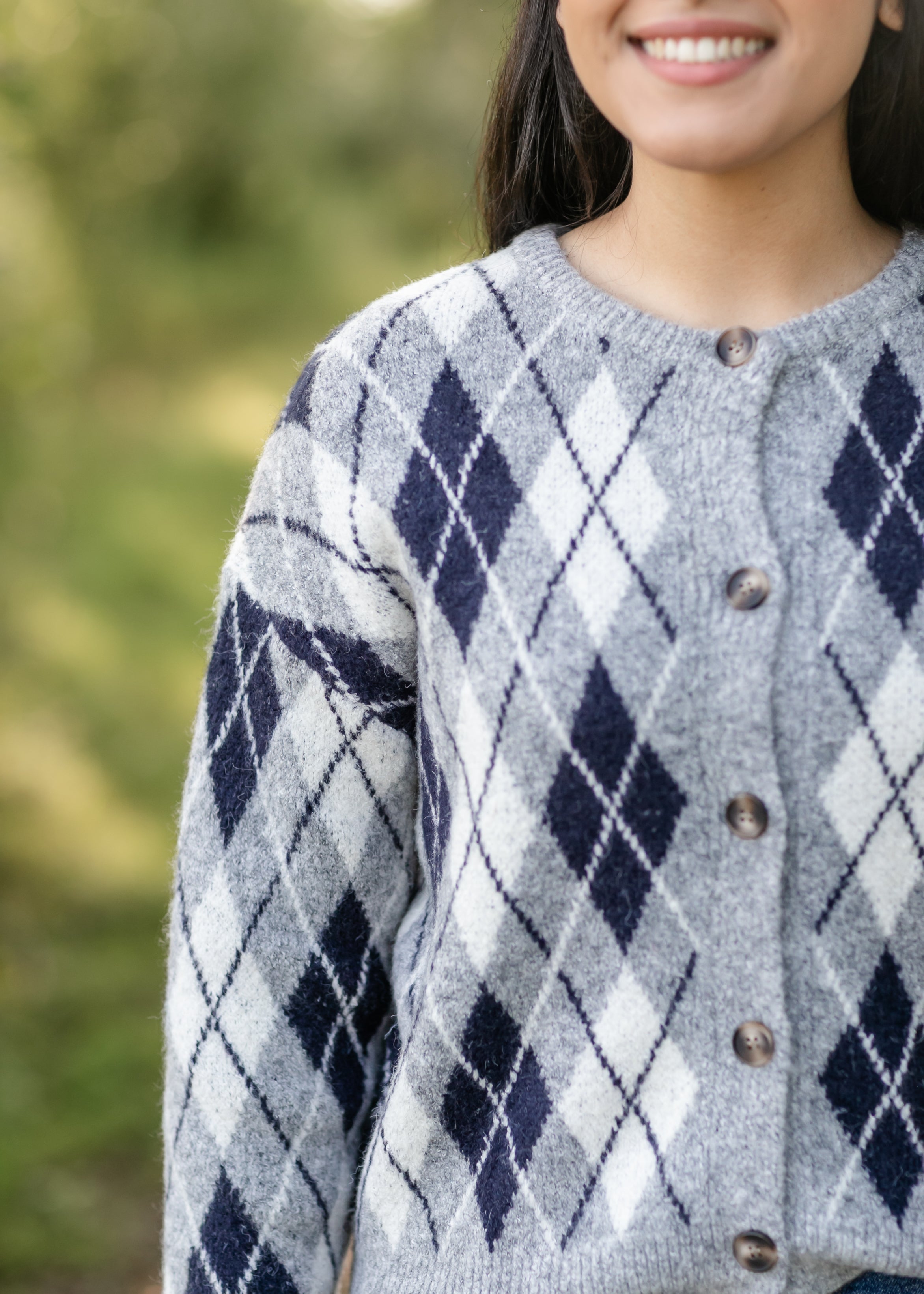 The Bec Argyle Button Up Cardigan brings a cozy update to a timeless pattern with its soft knit and classic diamond design in shades of gray and navy. Detailed with front buttons and a relaxed fit, it layers beautifully over tees or blouses. Style it with denim for an everyday look or dress it up with a skirt for a polished touch.