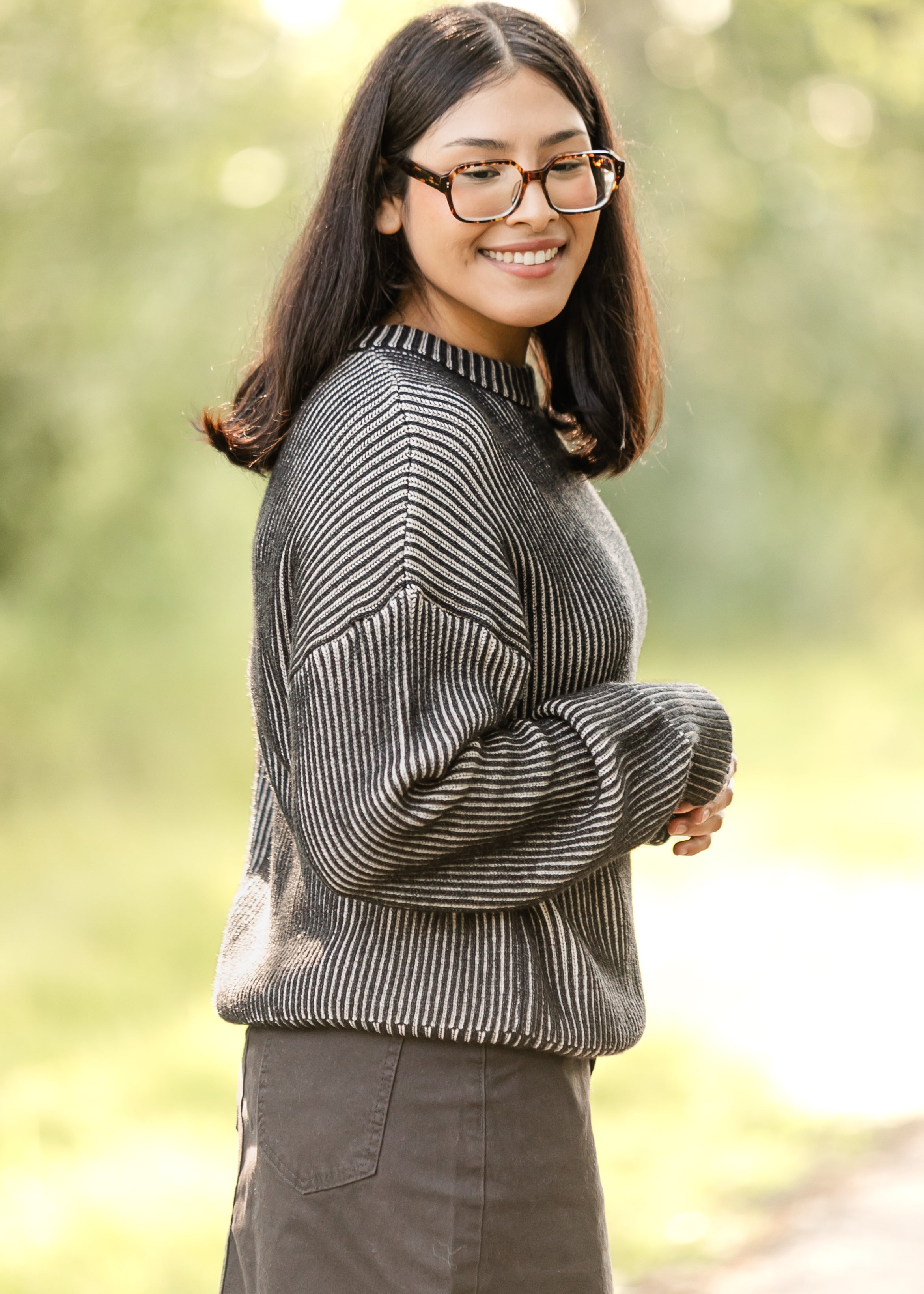 The Black White Knit Sweater blends timeless style with cozy comfort, featuring a modern stripe pattern in soft knit fabric. Its relaxed fit and drop shoulders create an effortless silhouette, perfect for pairing with a dark denim skirt or wide-leg jeans. A versatile piece that transitions seamlessly from casual outings to evenings in, offering warmth with understated elegance.