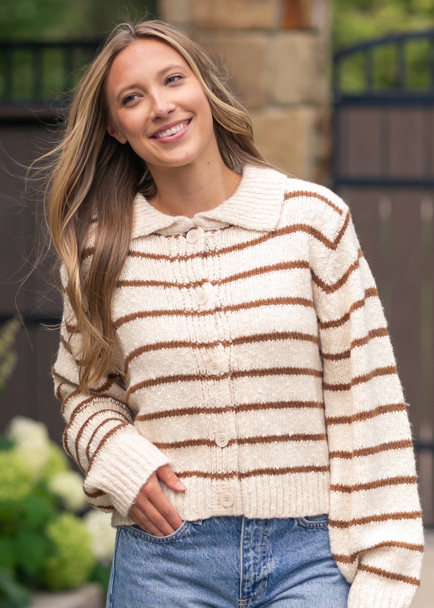 This cozy striped cardigan was made for crisp days and quiet moments. Featuring a relaxed fit, button front, and oversized collar, it layers effortlessly while adding a touch of nostalgic warmth. The soft knit and neutral tones blend comfort with timeless ease, giving you a piece that feels like it’s been part of your story all along.