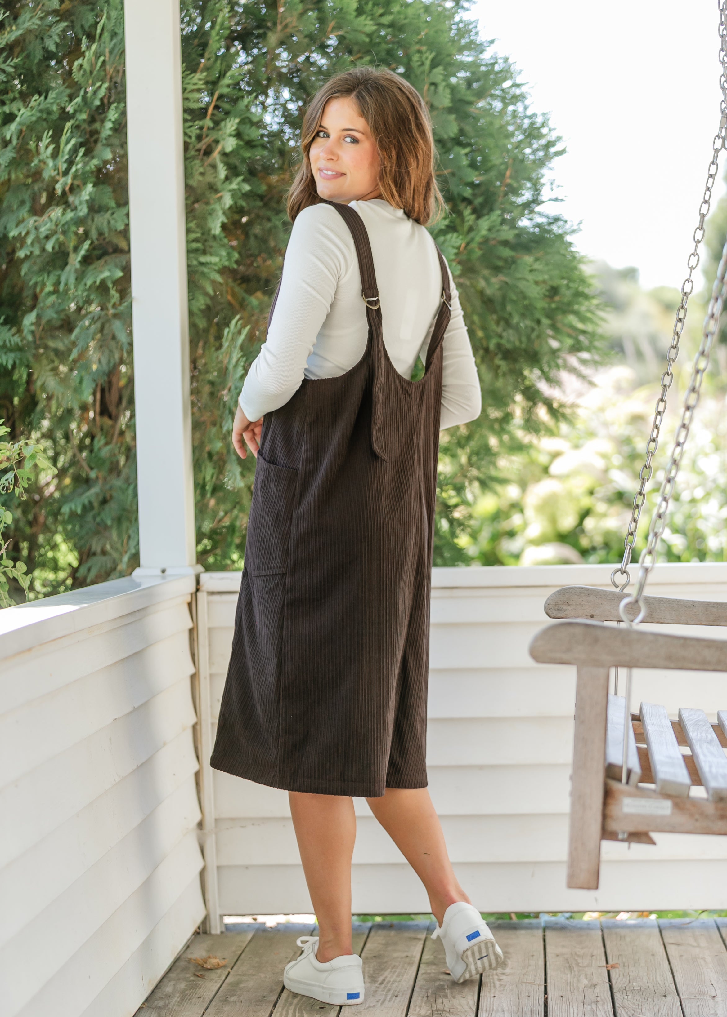 The Chocolate Corduroy Overall Dress is designed in a rich, textured corduroy with a relaxed silhouette that layers beautifully over fitted tops. Featuring a flattering V-neckline, wide adjustable straps with metal rings, and roomy front patch pockets, it blends practicality with style. The midi length makes it easy to wear with boots, flats, or sneakers, creating a versatile piece for every season.