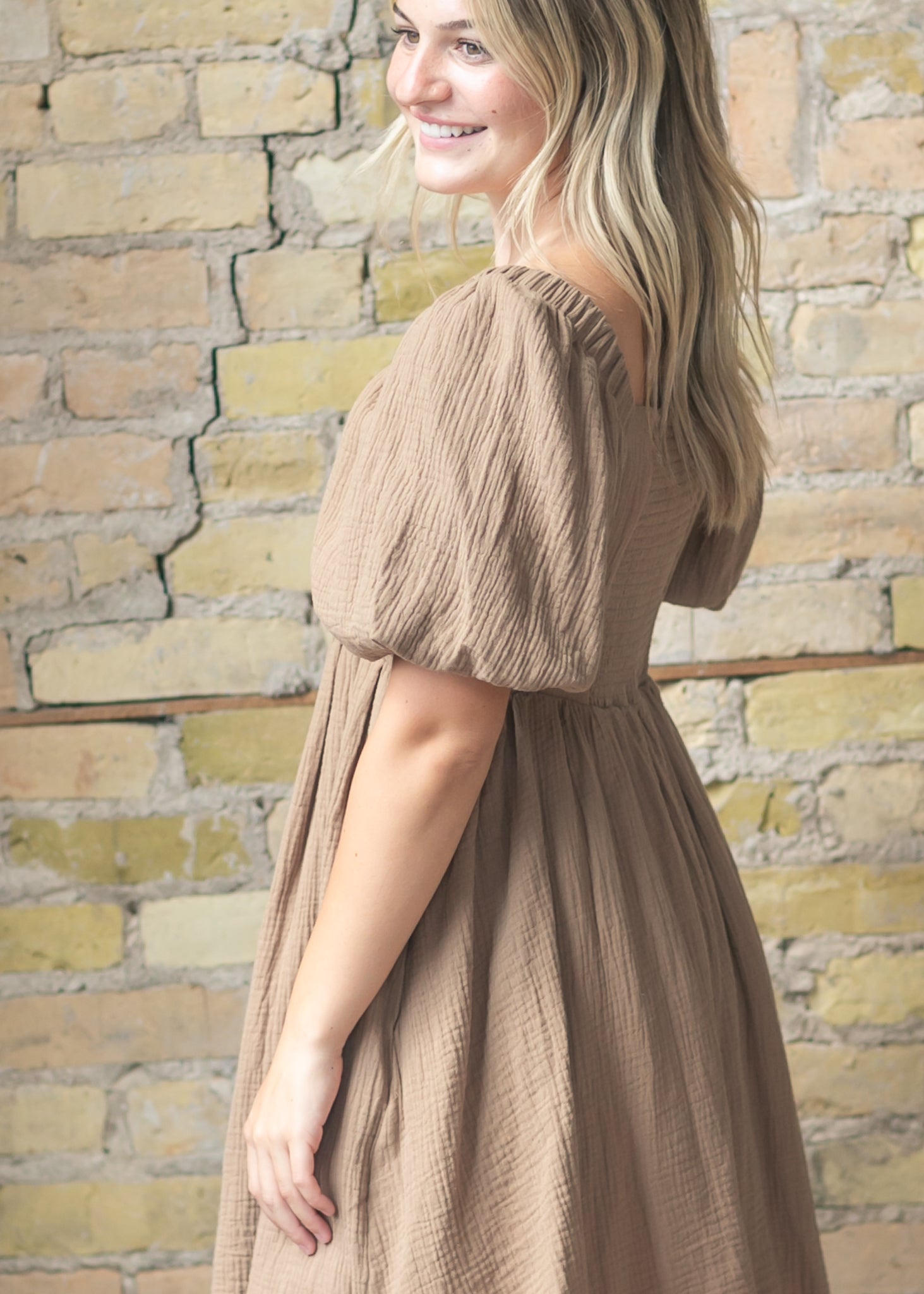 The Cotton Box Pleated Midi Dress brings an airy ease with its lightweight texture and feminine details. A square neckline, puff sleeves, and soft pleats create a graceful silhouette, while the smocked back offers comfort and fit. Perfect for afternoons in the sun, this dress pairs beautifully with sandals or can be styled with a light cardigan for cooler evenings.