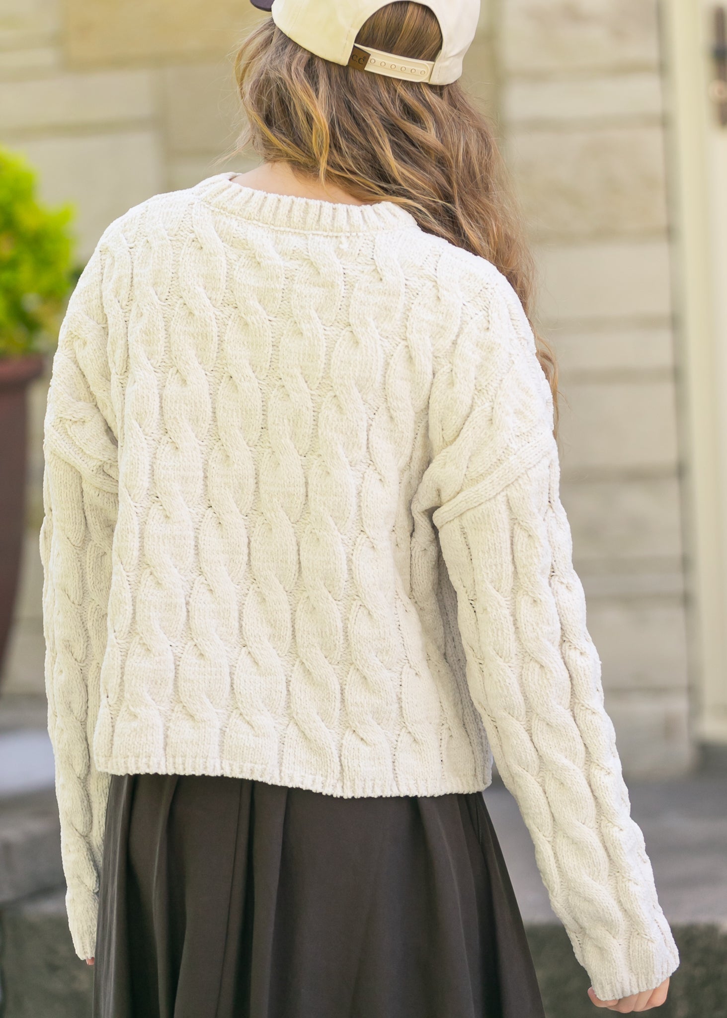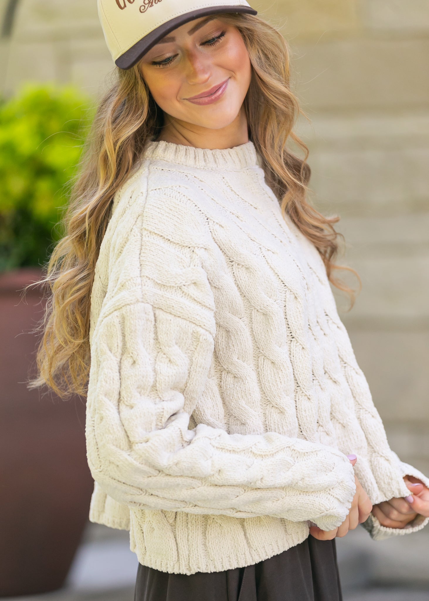 The cream cable knit sweater brings cozy texture and timeless design to your wardrobe. Featuring a relaxed fit with a classic cable pattern, it’s the perfect layer for crisp days. Pair it with a flowy skirt for effortless softness or denim for everyday wear. A sweater made to keep you warm and modest while looking beautifully put-together