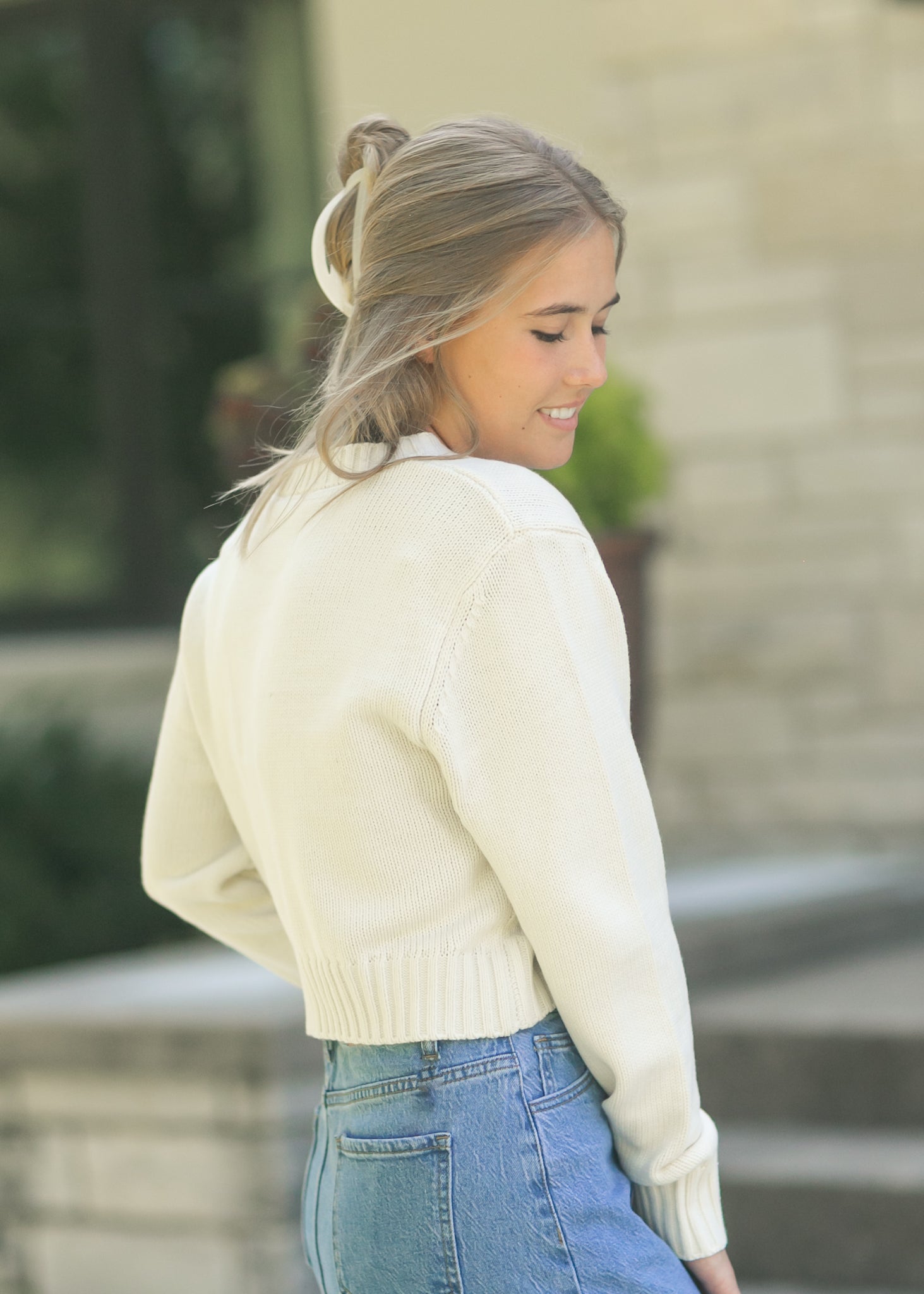 The Crewneck Long Sleeve Sweater is a classic knit with a modern cropped fit, perfect for layering or wearing on its own. Its ribbed trim and soft texture make it cozy yet polished, ideal for pairing with a denim skirt or casual jeans. A timeless neutral, this sweater easily carries you from crisp mornings to relaxed evenings with effortless grace.