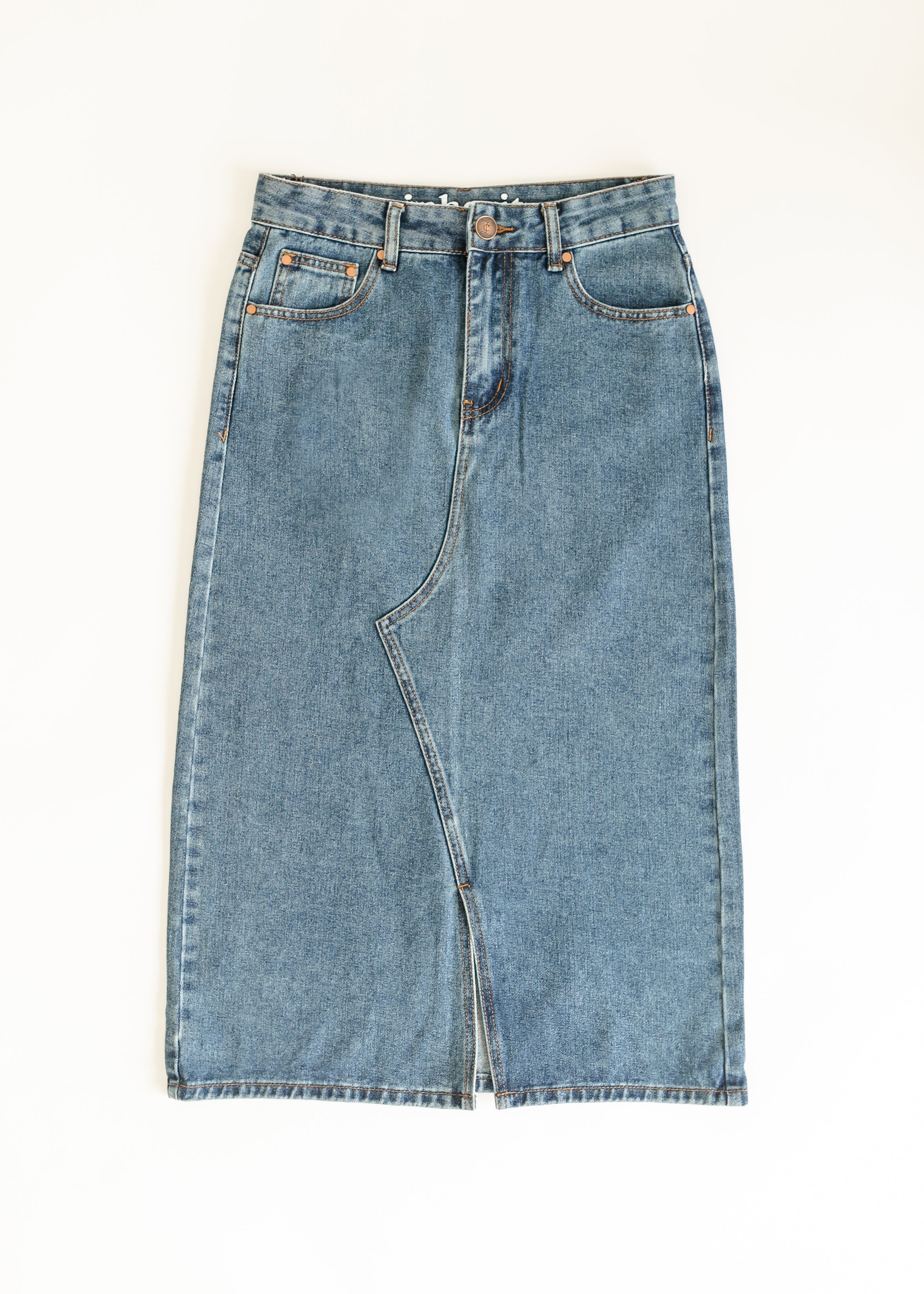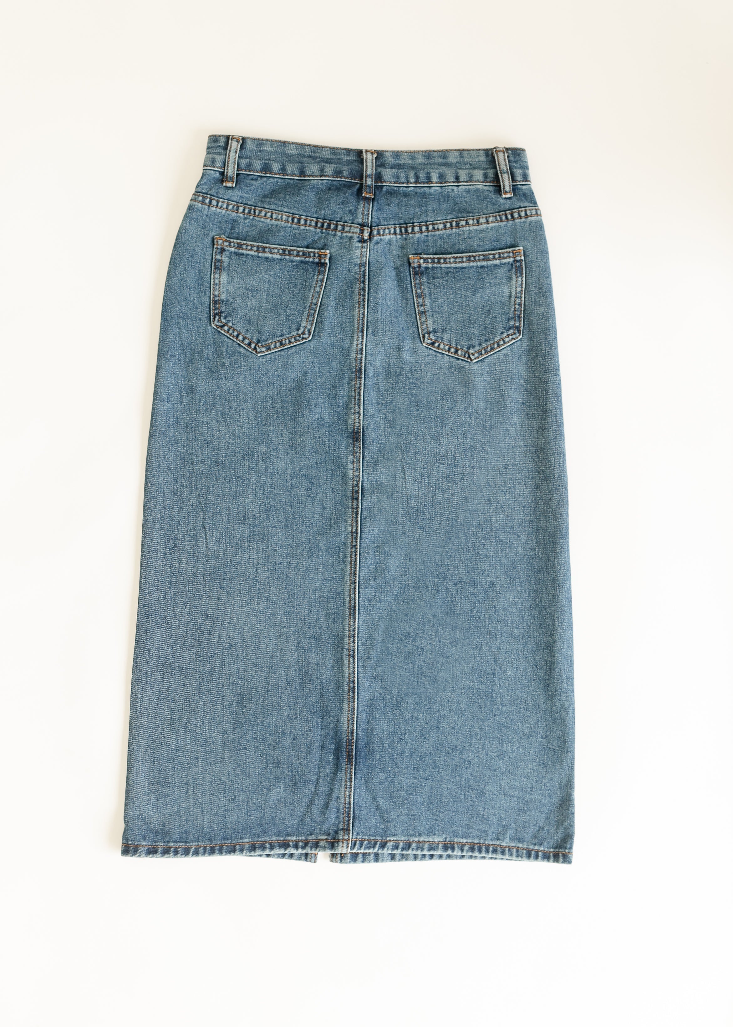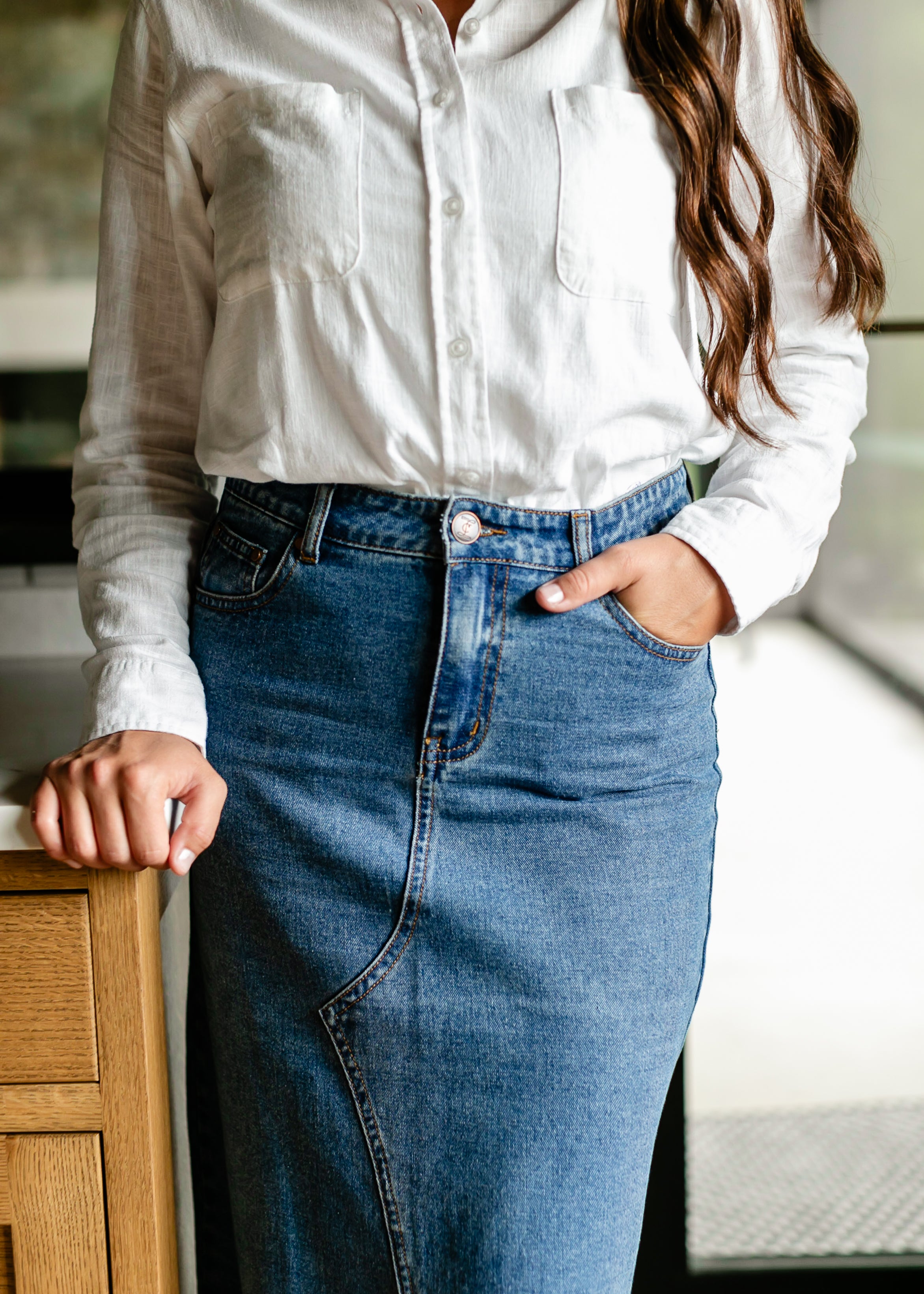 The Delaney Medium Wash Denim Midi Skirt is an Inherit Designed that is forever cool and classic! This wear-with-everything modest midi skirt features a medium wash, 5 pockets, a finished hem, a small front slit for walkability, and a front seam. It will be a staple in your denim rotation from this season to the next!