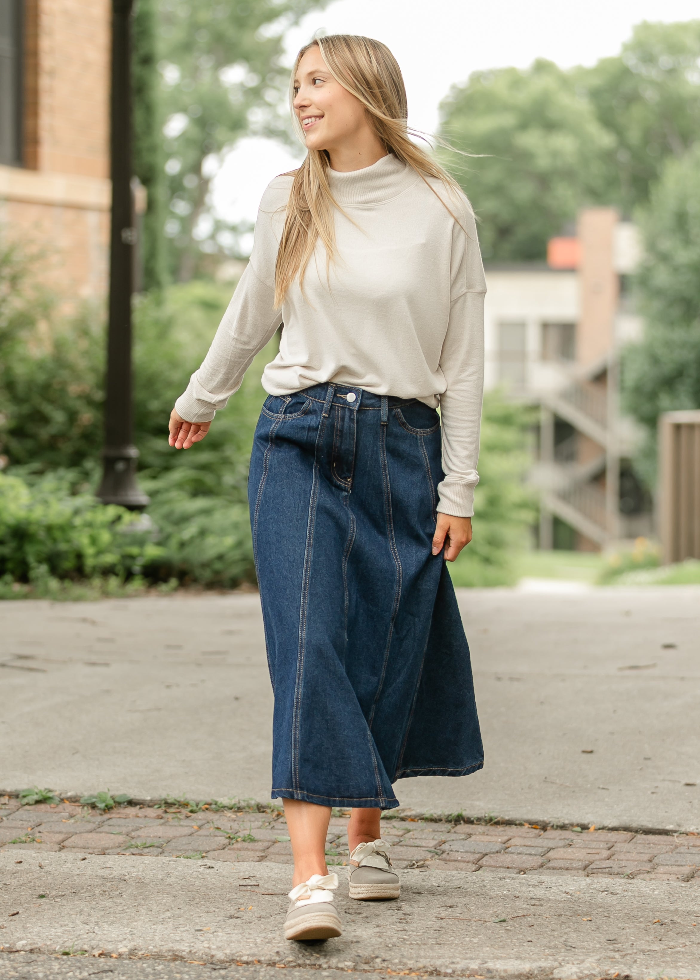 A fresh take on a timeless classic, the Denim A-line Maxi Skirt brings ease and structure to your wardrobe. Thoughtfully designed with contrast stitching, functional pockets, and a flattering paneled silhouette, this skirt offers movement without compromising modesty. Whether you’re dressing for everyday or church, it’s a go-to piece that feels confident and put-together.