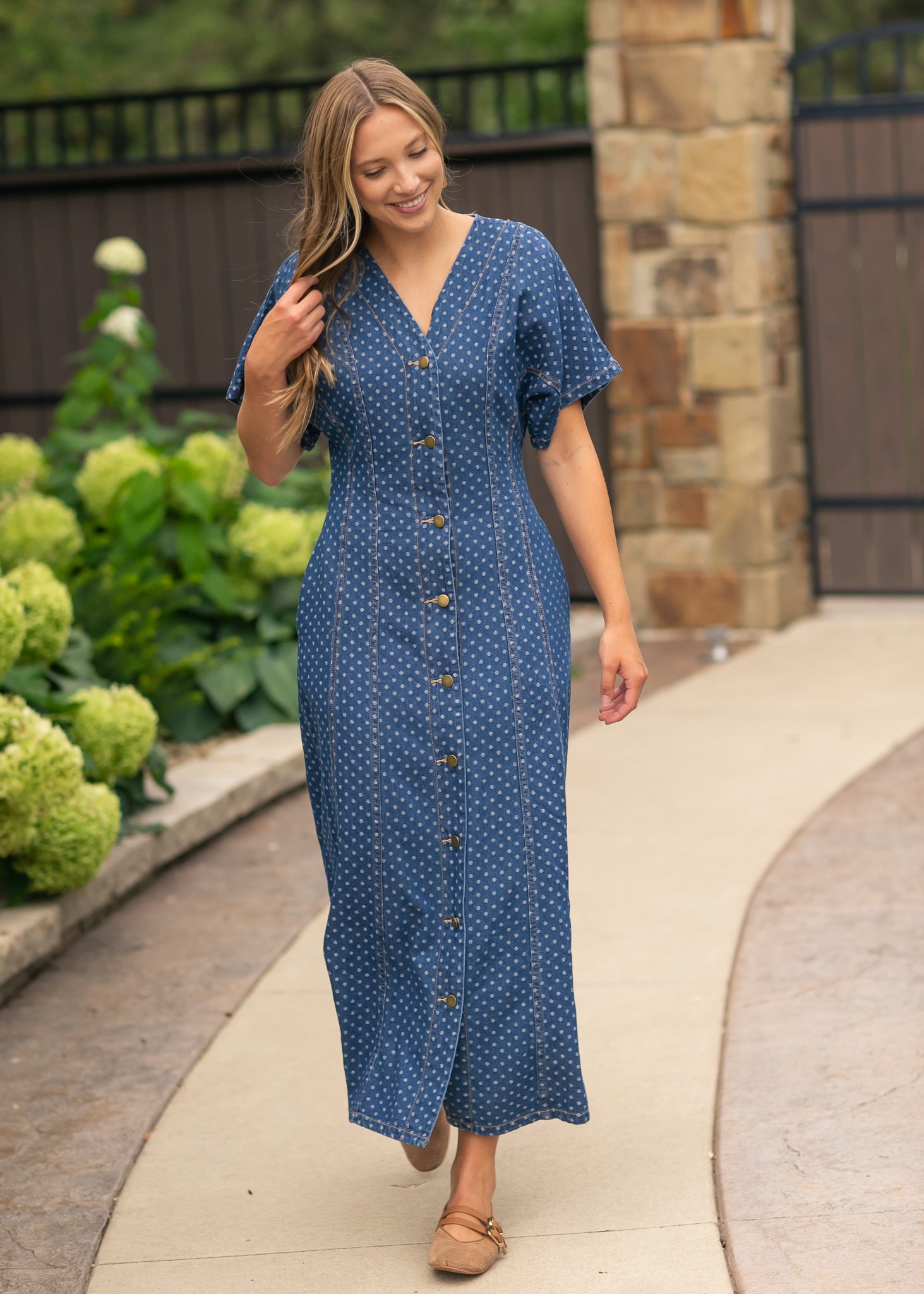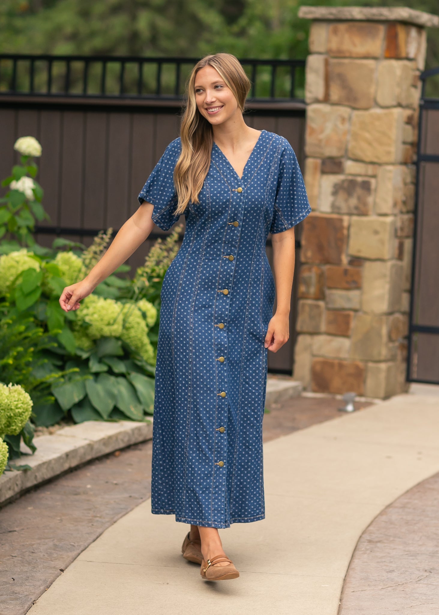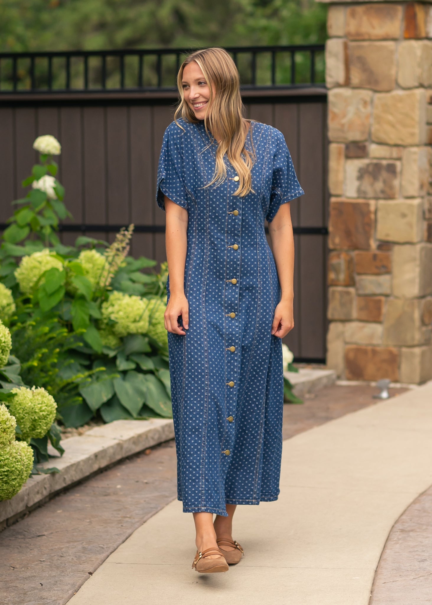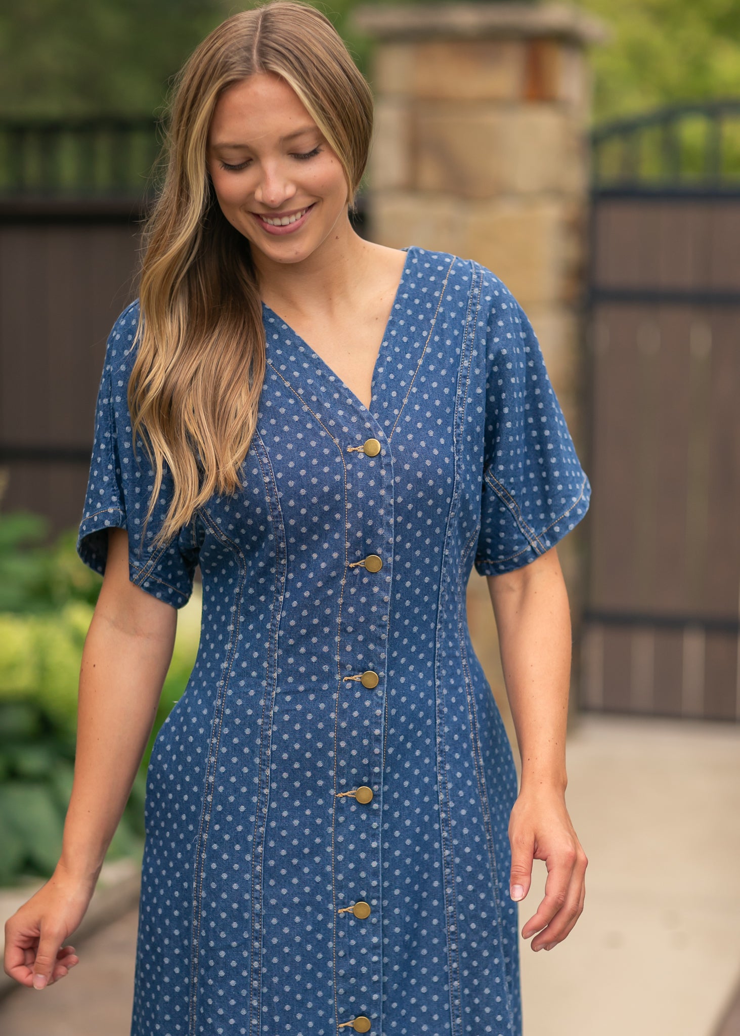 With a soft vintage wash and dainty polka dot print, this denim dress brings timeless femininity to your every day. The full button-down front and v-neckline offer sweet structure while short sleeves and a flowy silhouette keep it easy and breathable. Complete with side pockets and thoughtful seaming, it’s the dress that makes you feel at home wherever you wander.