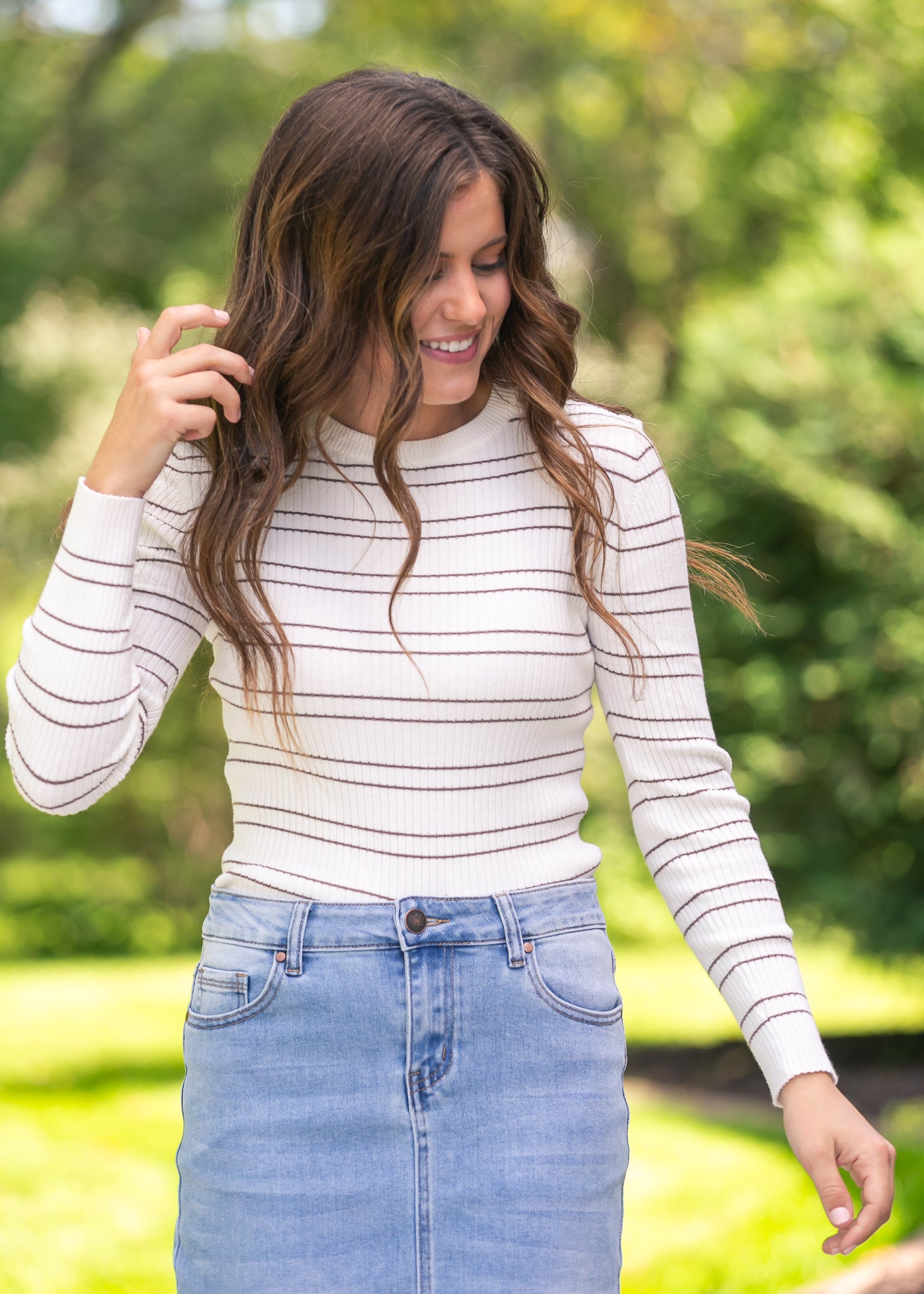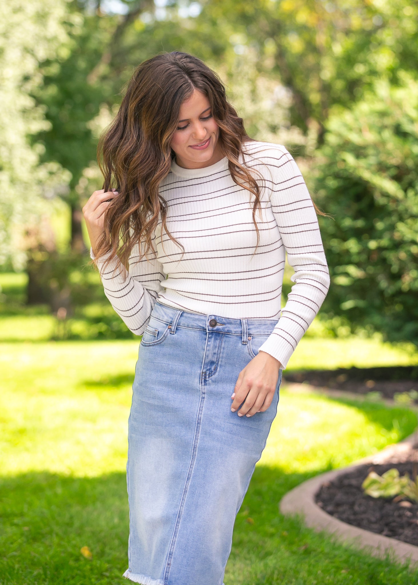 The Double Stripe Crewneck Rib Sweater brings timeless ease with its soft ribbed knit and clean stripe pattern. Its flattering fit and crew neckline make it a versatile piece you’ll wear on repeat. Perfectly modest, it pairs well with flowy skirts for a polished look or denim for casual days, giving you effortless style that feels both classic and fresh.