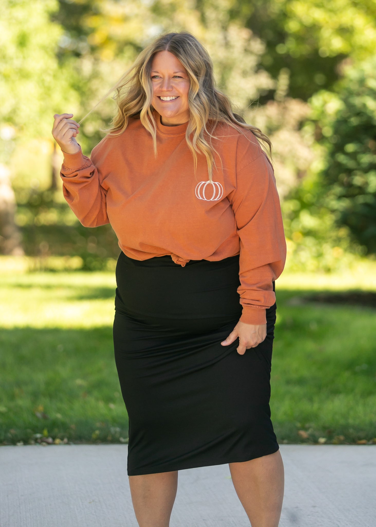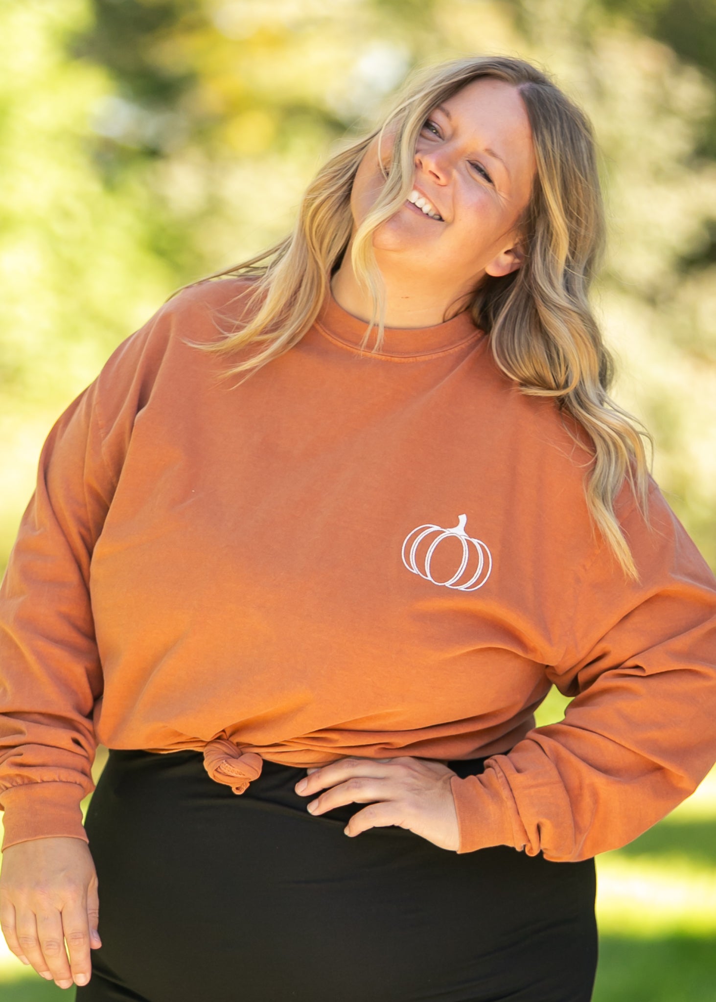 The Embroidered Pumpkin Long Sleeve Graphic Tee is a sweet nod to the cozy beauty of fall. Crafted in a soft burnt orange hue, this tee features a simple embroidered pumpkin that adds a touch of harvest warmth. Designed with a modest, relaxed fit, it pairs effortlessly with denim or a midi skirt for laid-back, faith-filled autumn days.