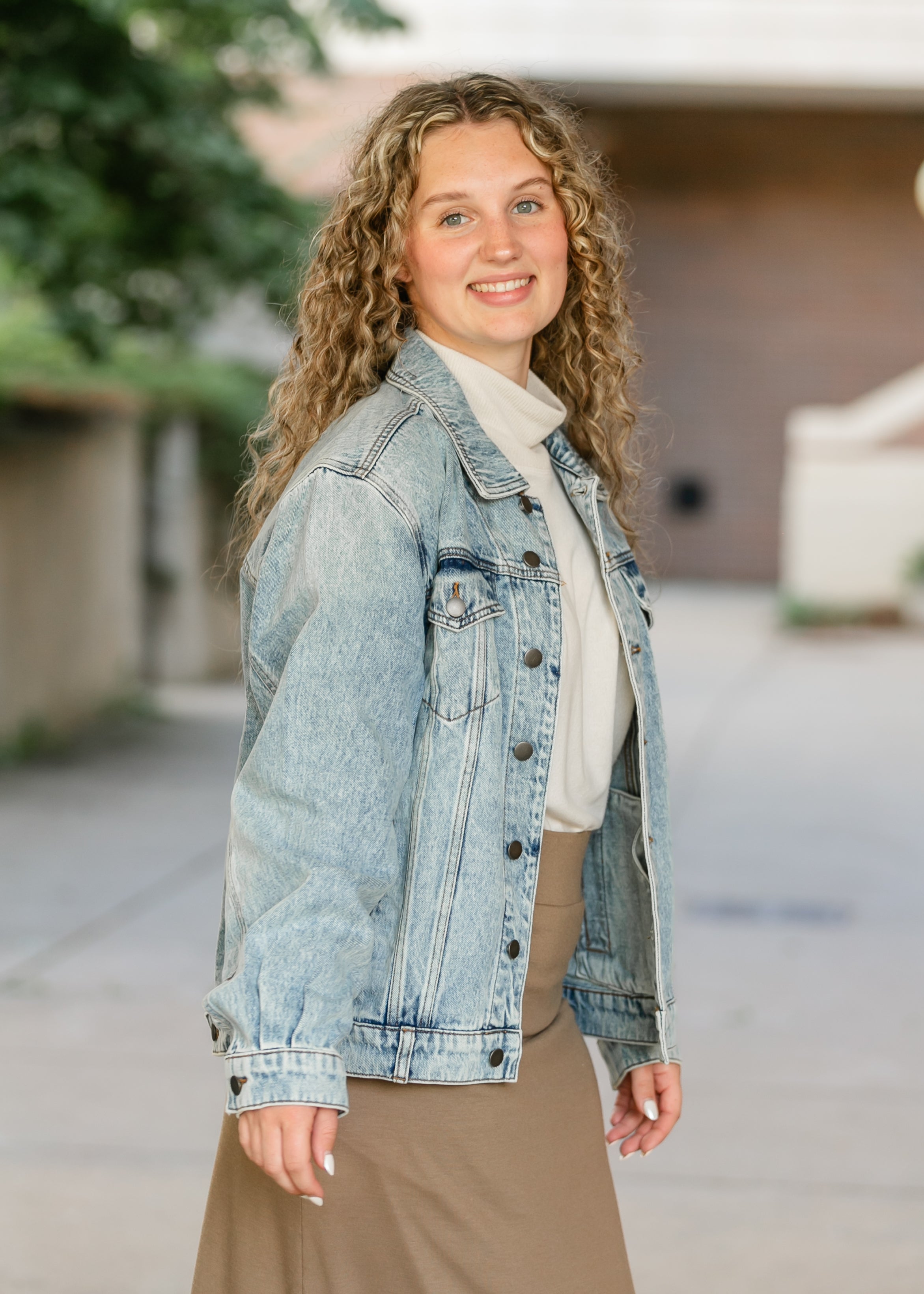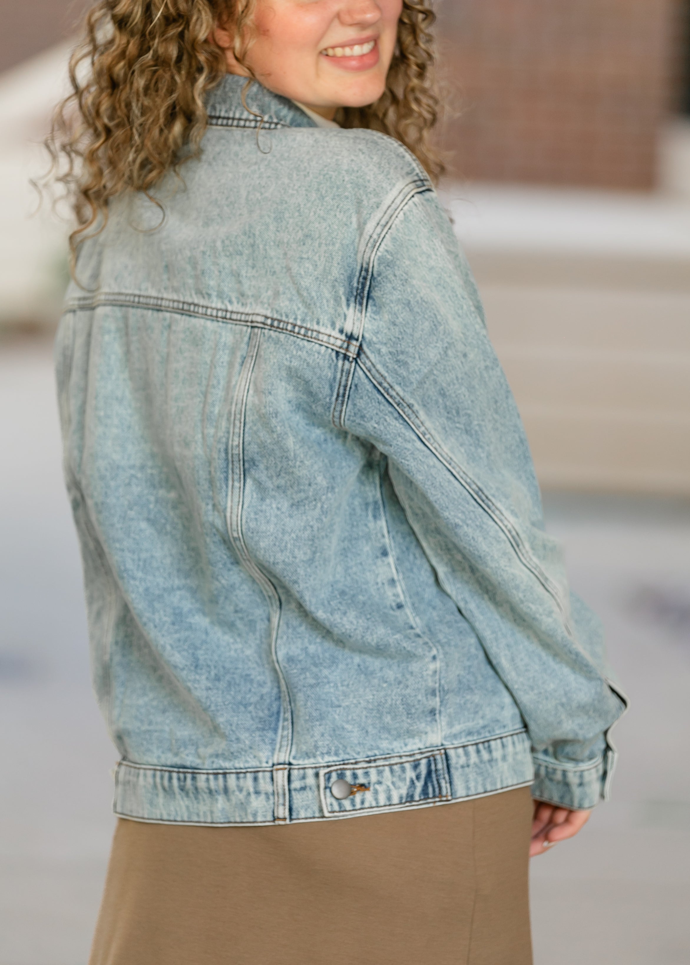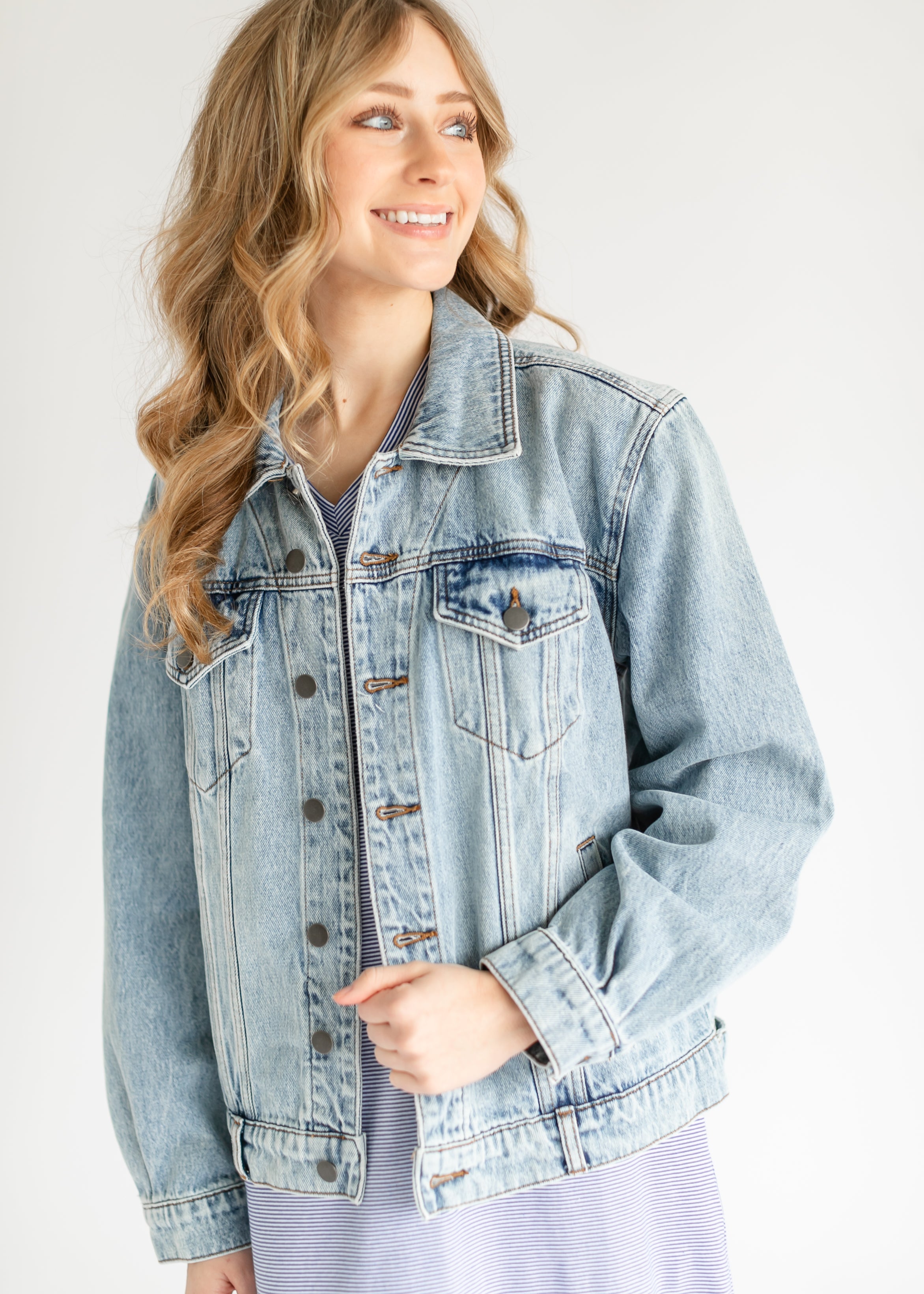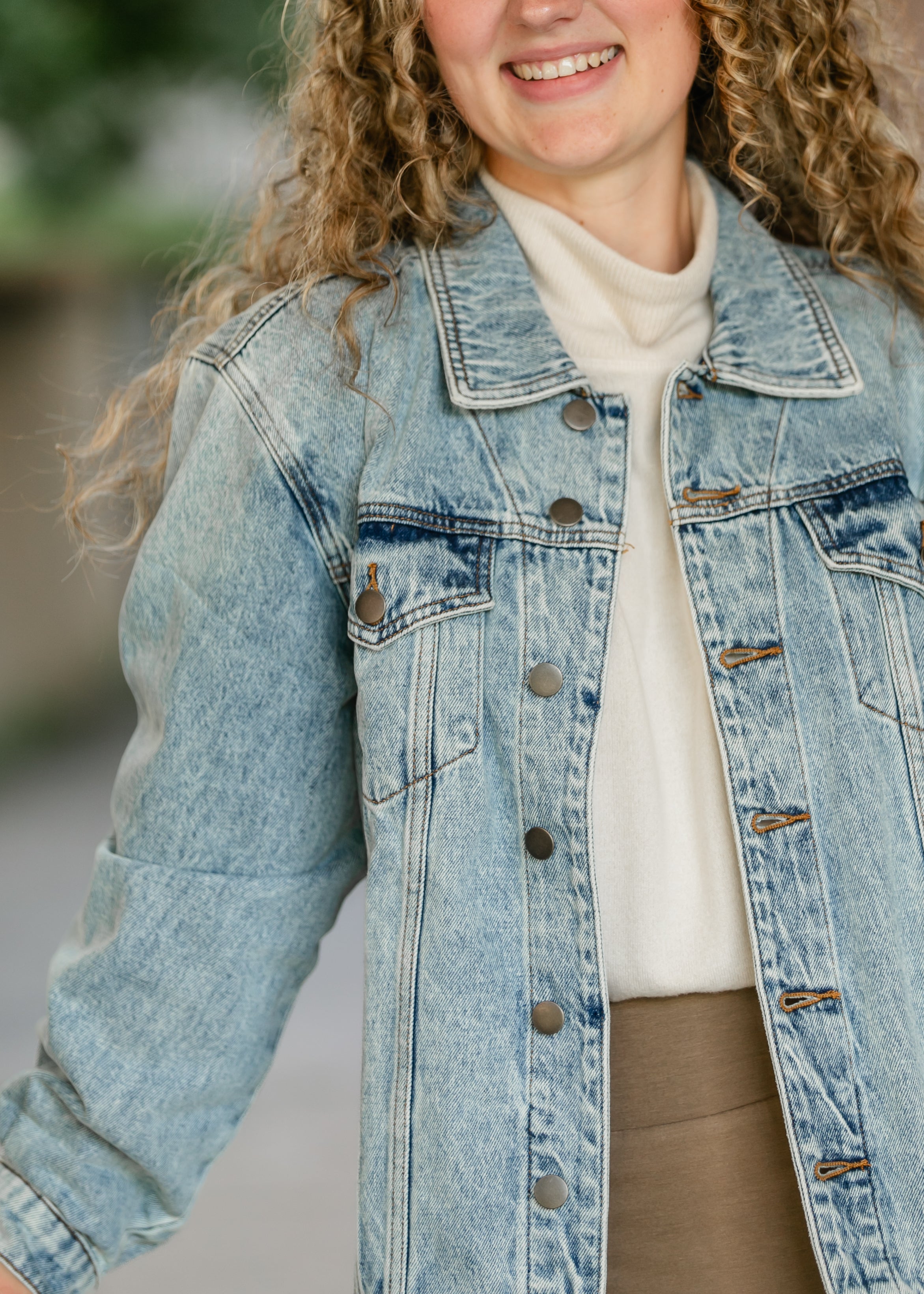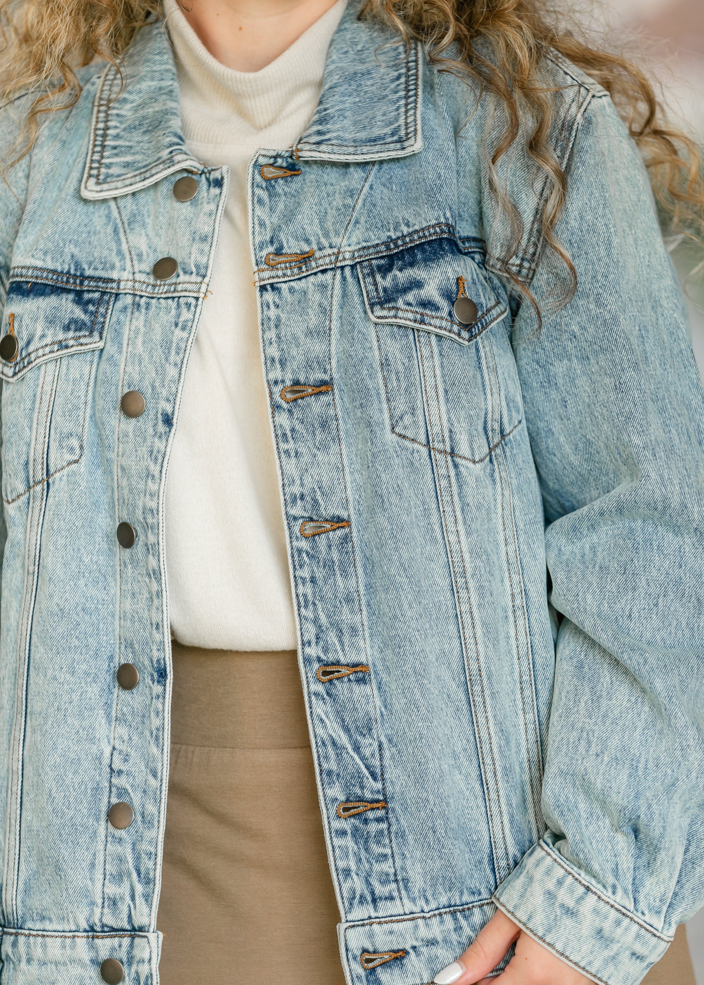 The Emmy Light Wash Oversized Denim Jacket by KUT is the ultimate layering piece for effortless style. Designed with a non-stretch denim fabric, this jacket embraces a relaxed silhouette that blends comfort with classic appeal. The drop shoulder design enhances its laid-back aesthetic, while the light wash and subtle distressing create a perfectly worn-in, vintage vibe. Crafted with timeless detailing, including front button closures, chest flap pockets, and adjustable cuffs, this jacket is a versatile wardrobe staple. Whether paired with a casual dress, layered over a cozy sweater, or styled with your favorite denim, the Emmy Denim Jacket adds just the right touch of retro charm to any outfit