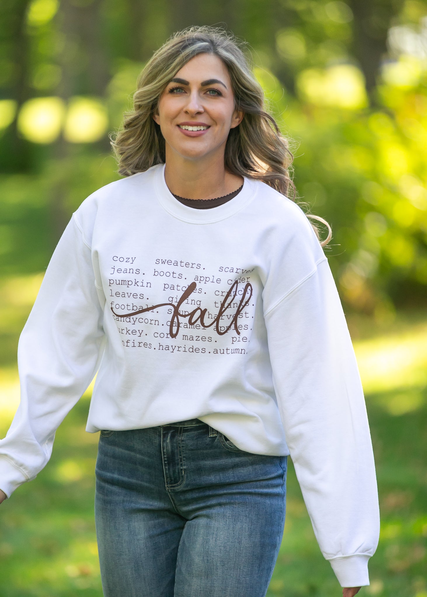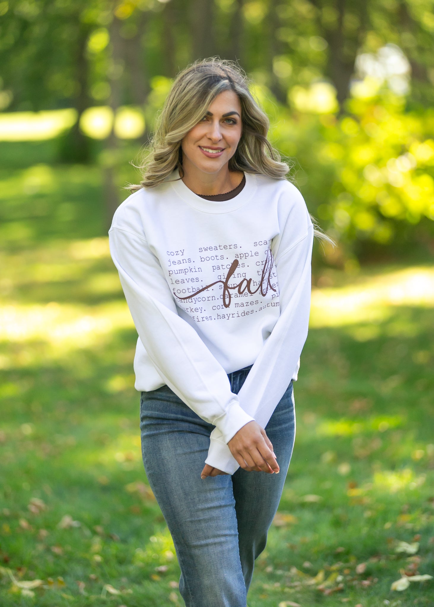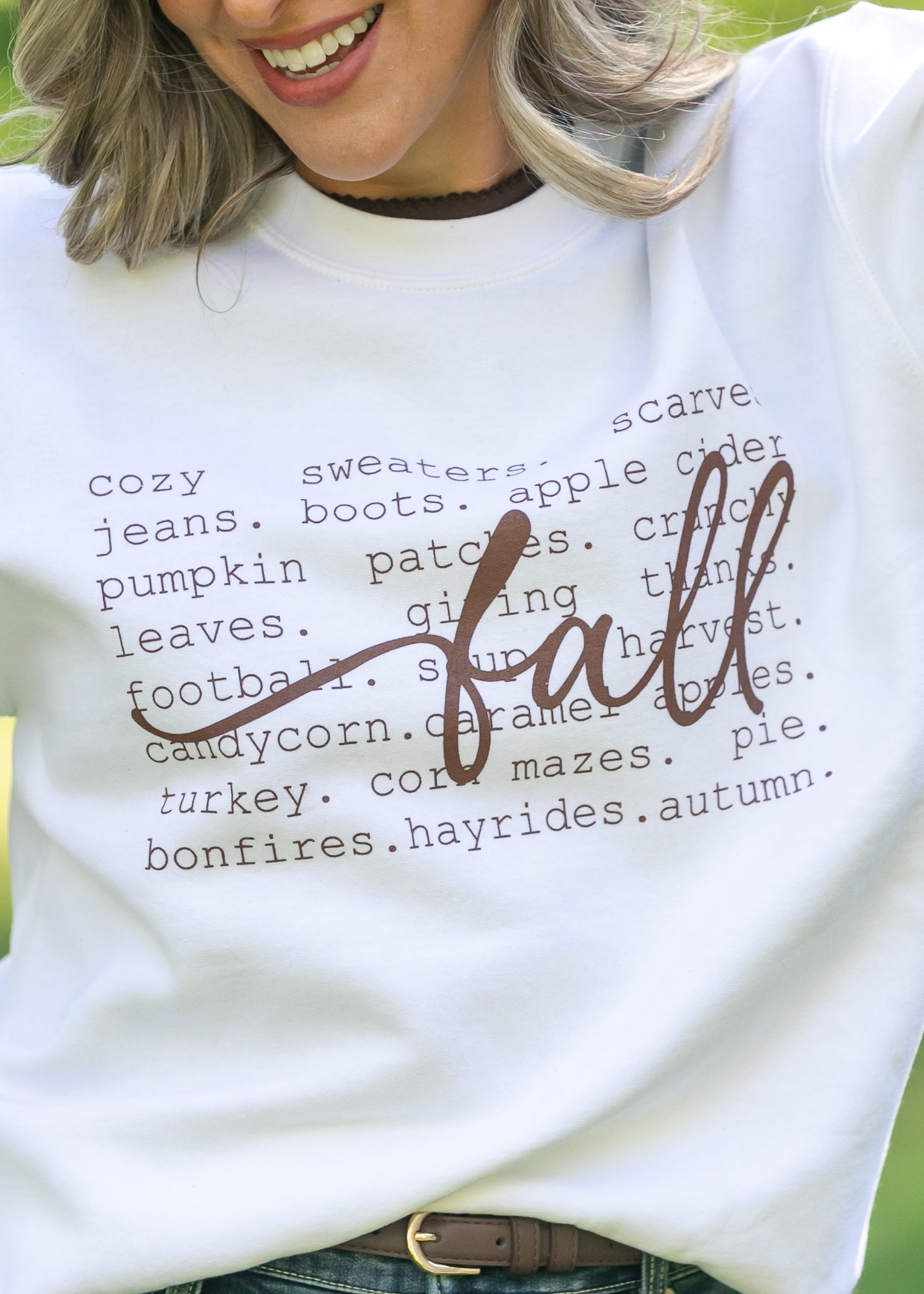 The Falling For Fall Graphic Sweatshirt is the coziest way to celebrate your favorite season! This soft white sweatshirt features fall-inspired words printed across the front with “fall” written in a bold, script font for a charming touch. Designed with a relaxed fit, crew neckline, and comfy fleece interior, it’s perfect for pairing with denim or skirts for apple-picking days or cozy nights in. A must-have staple for anyone who loves all things autumn!