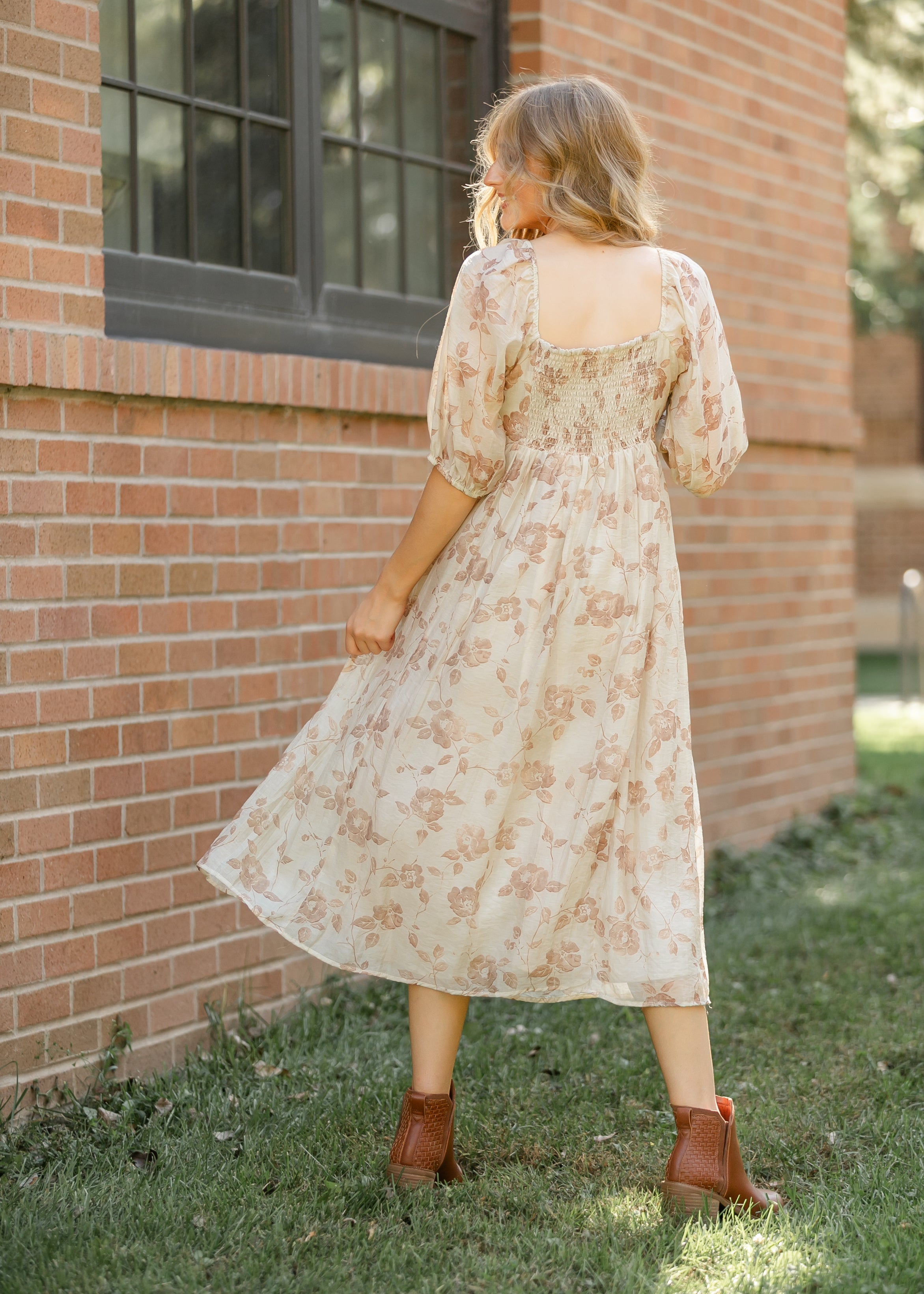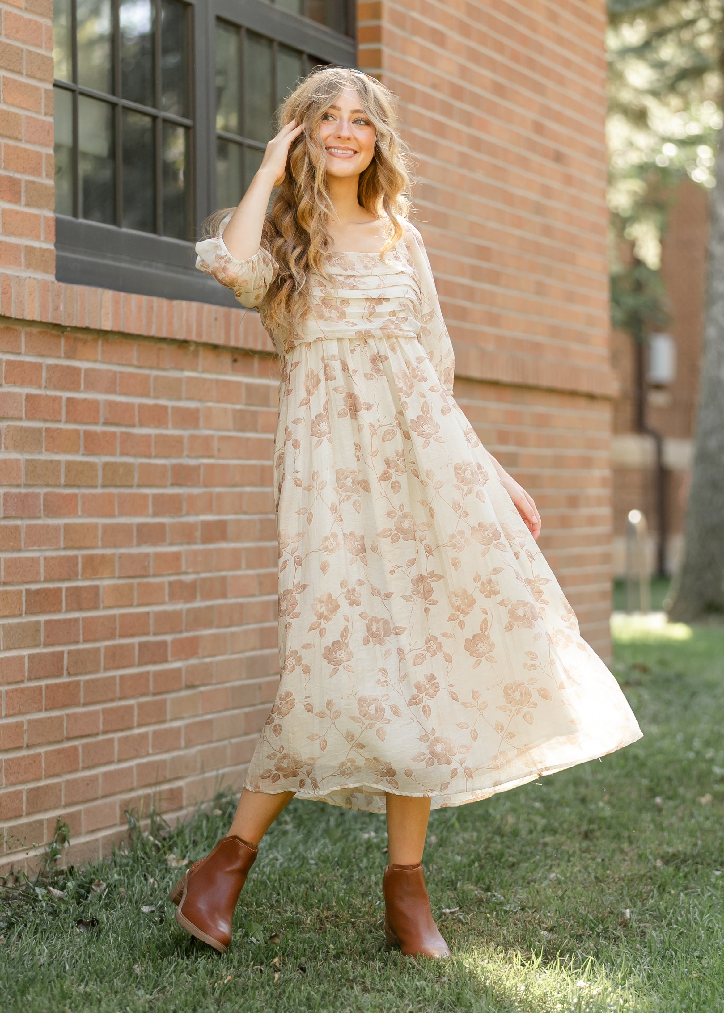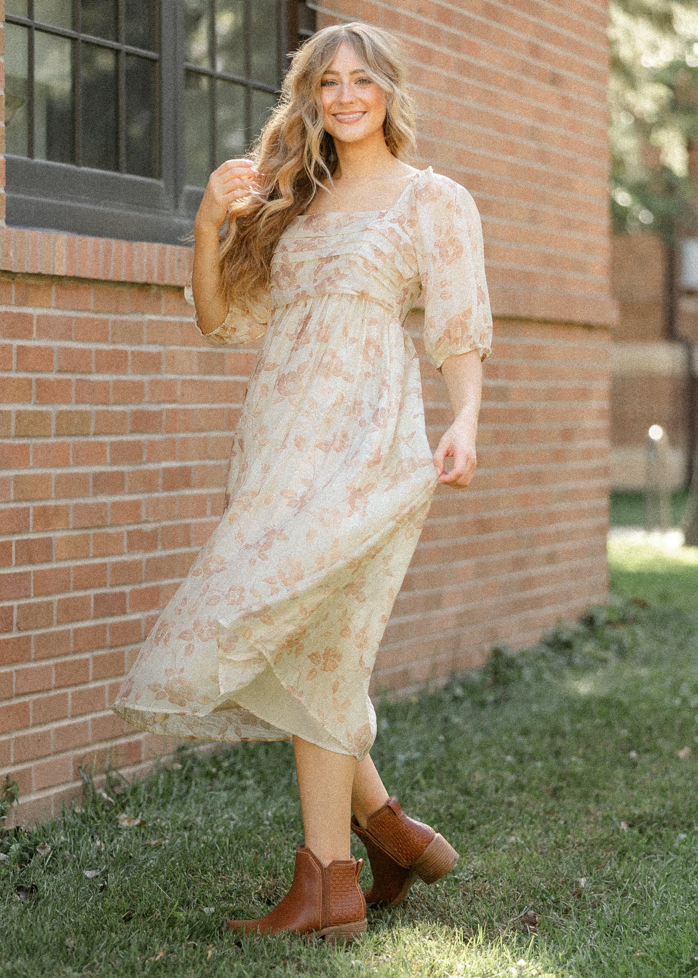 The Floral Pleated Bodice Midi Dress is a romantic silhouette designed with soft neutral florals and graceful movement. Featuring a pleated square neckline, smocked back, and puffed half sleeves, it offers a feminine yet modest fit. The lightweight fabric flows beautifully with each step, perfect for pairing with ankle boots or flats for timeless, effortless elegance.