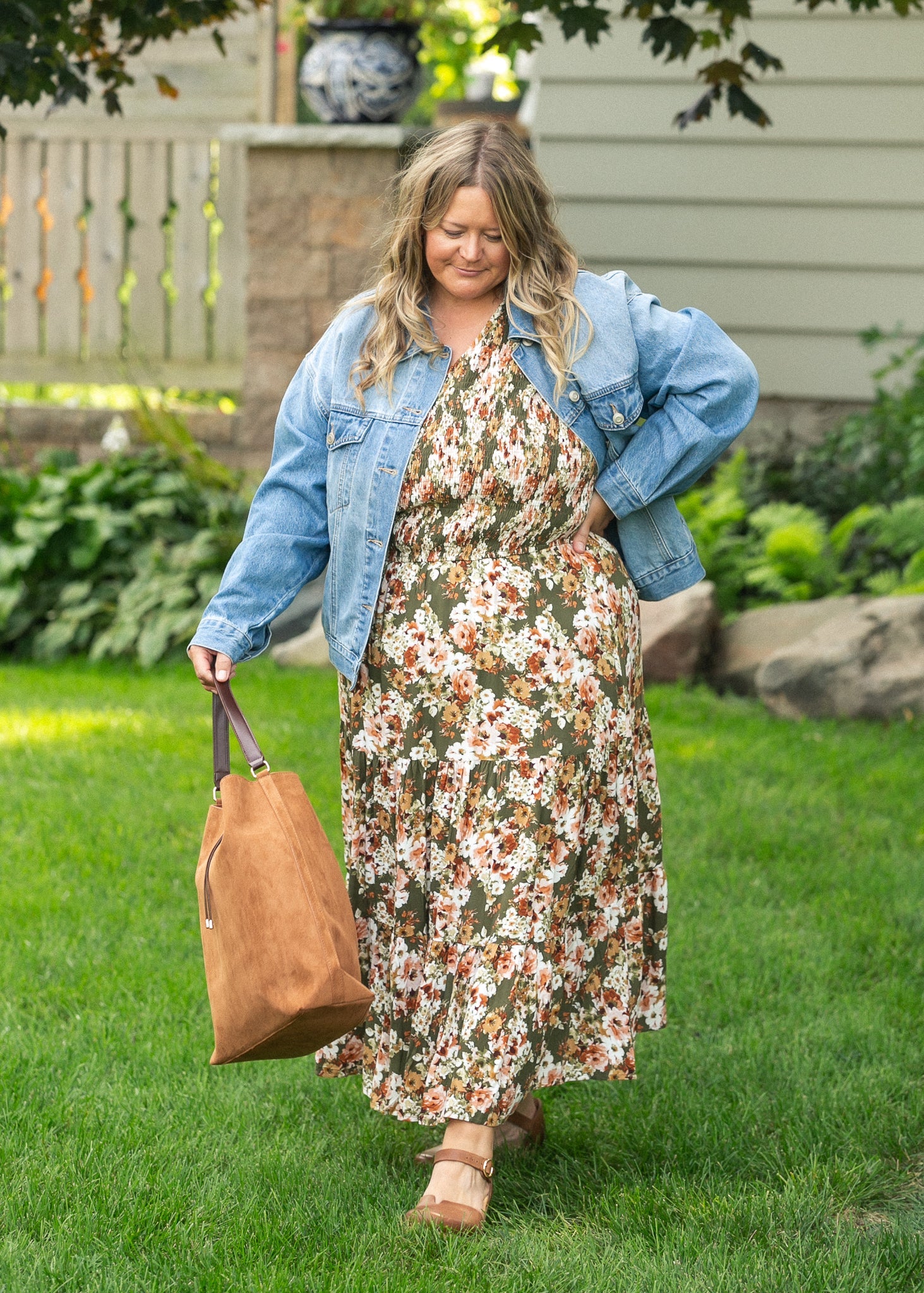 The Floral Smocked V-Neck Dress brings effortless femininity with its soft smocked bodice, tiered skirt, and flutter sleeves. Designed in earthy olive tones with warm floral blooms, this dress flows beautifully for Sunday gatherings, outdoor strolls, or afternoon brunch. Pair with simple flats for an easy day look or layer with a denim jacket for timeless modest styling.