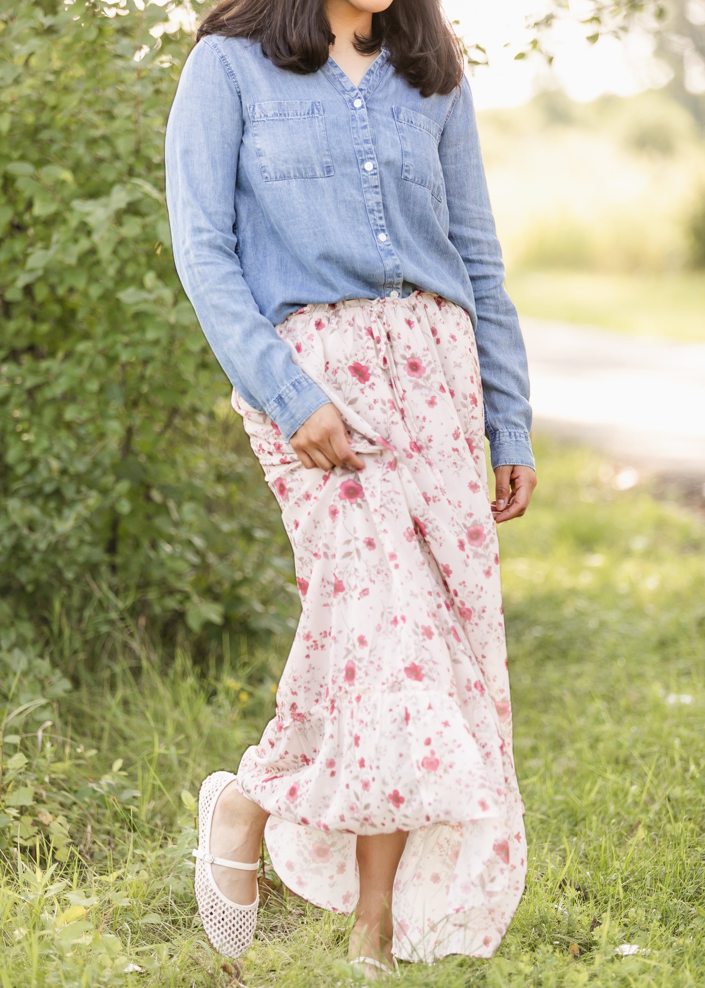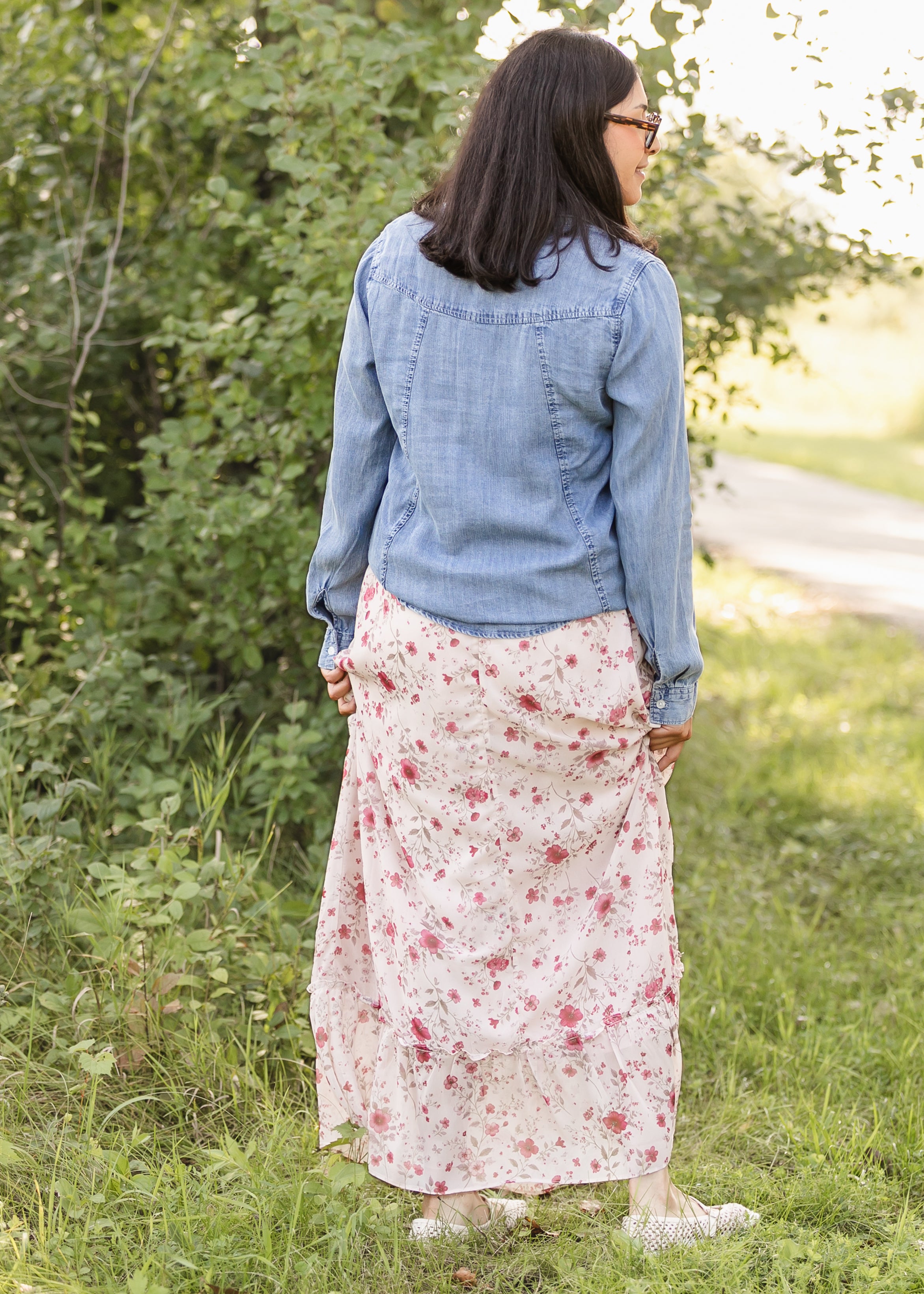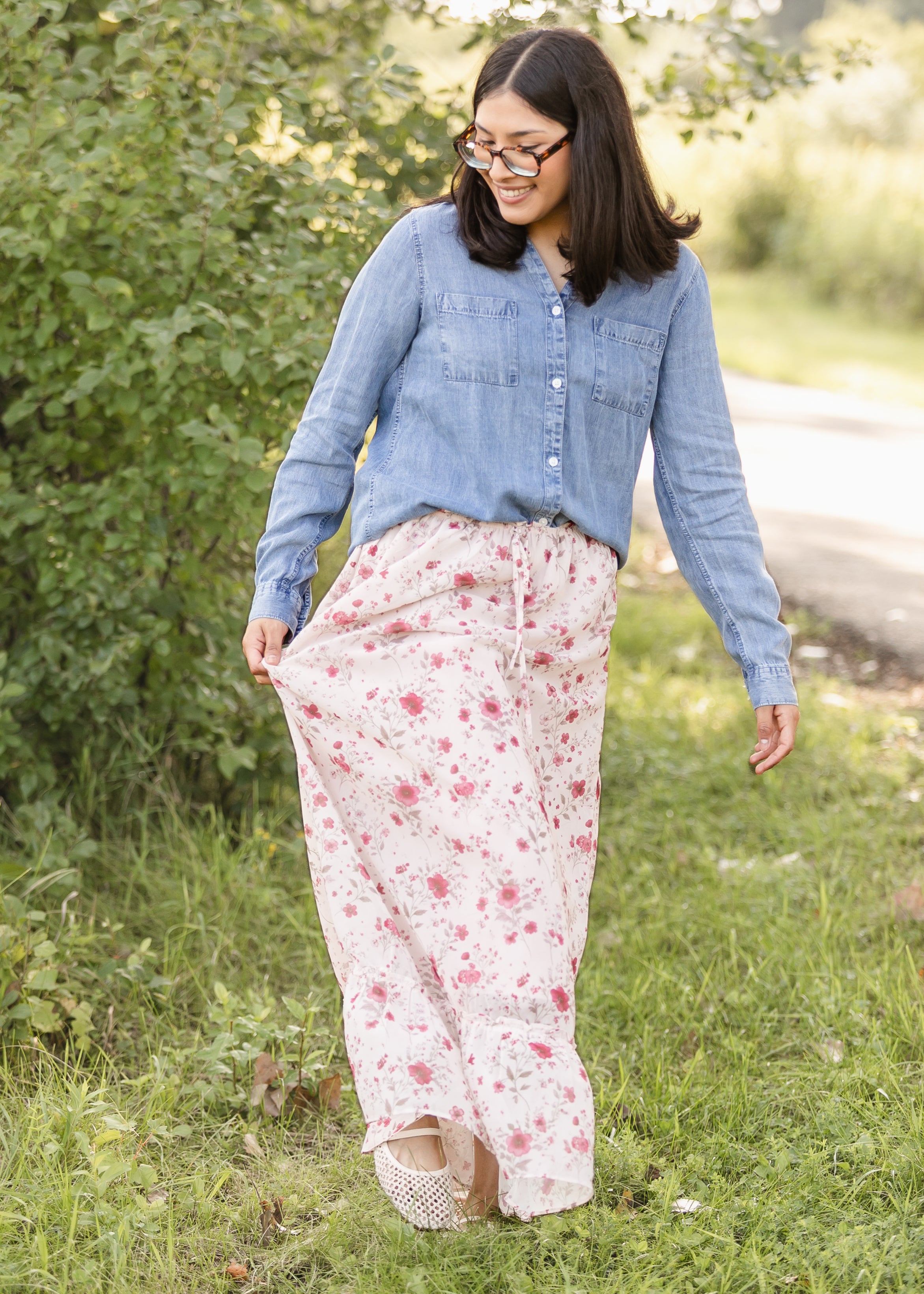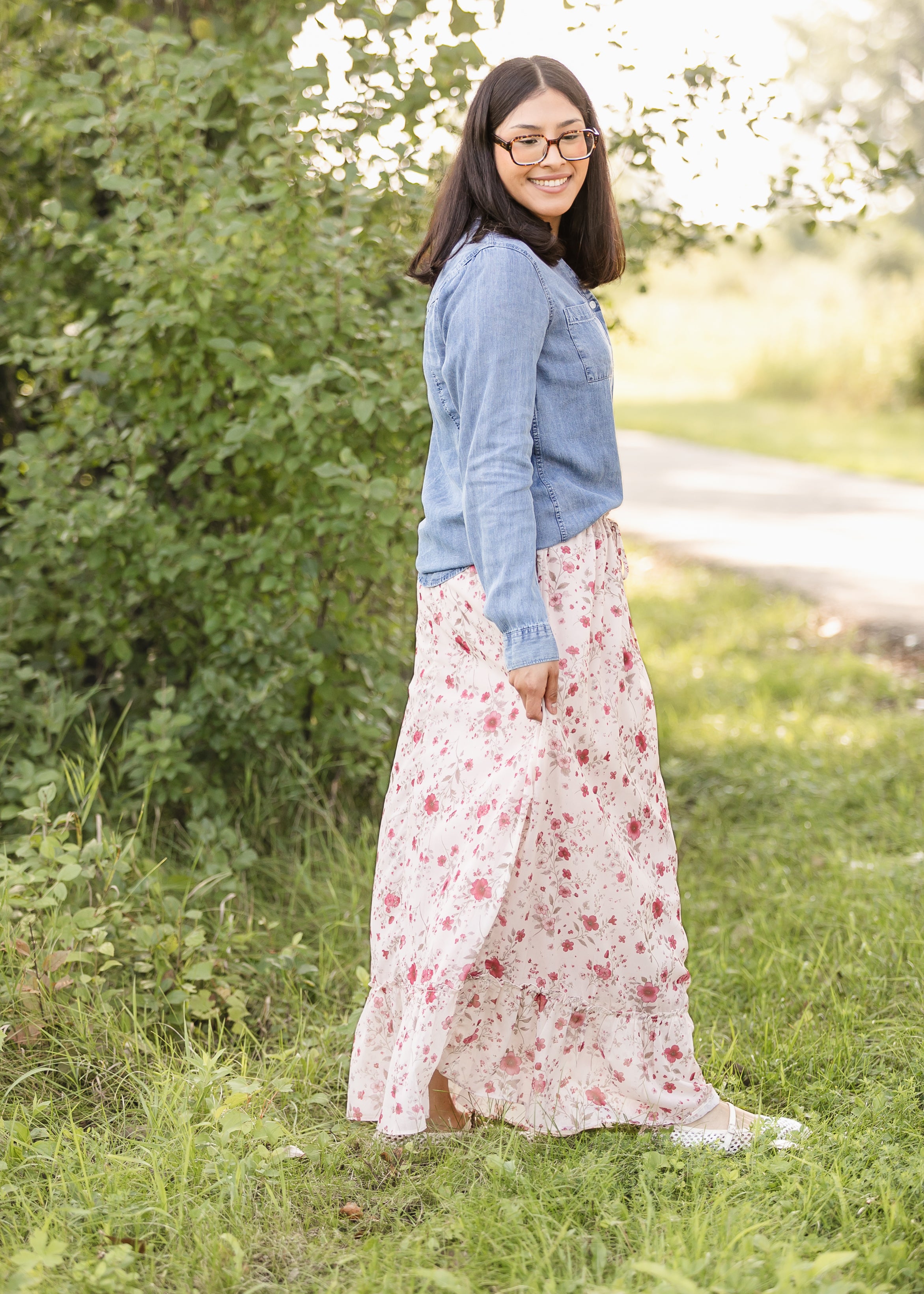 Softly feminine and beautifully detailed, the Floral Waist Tie Maxi Skirt features a delicate blush-pink base with hand-drawn florals in rich berry hues. Its lightweight, fully lined silhouette flows with ease, while a drawstring waistband offers a custom fit. A subtle ruffle hemline adds an extra touch of grace to this timeless, modest favorite.