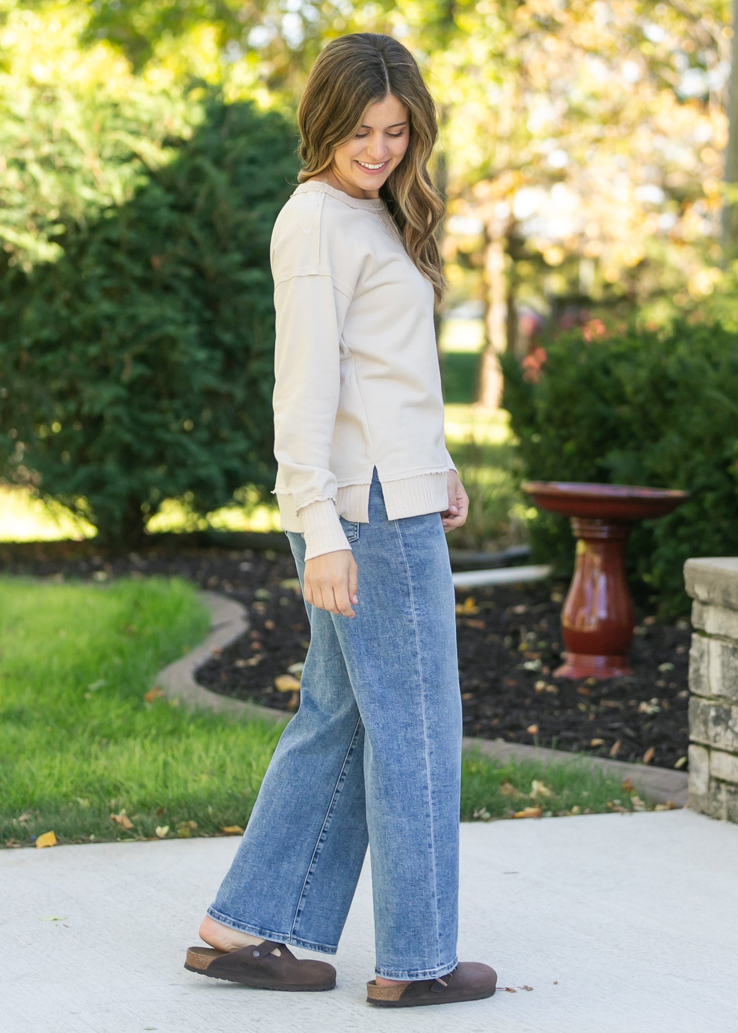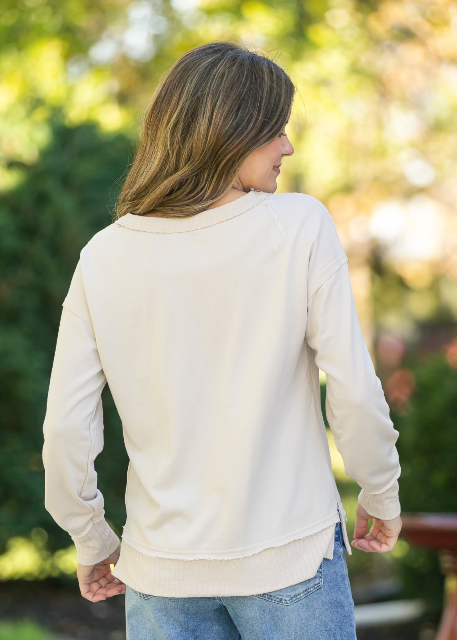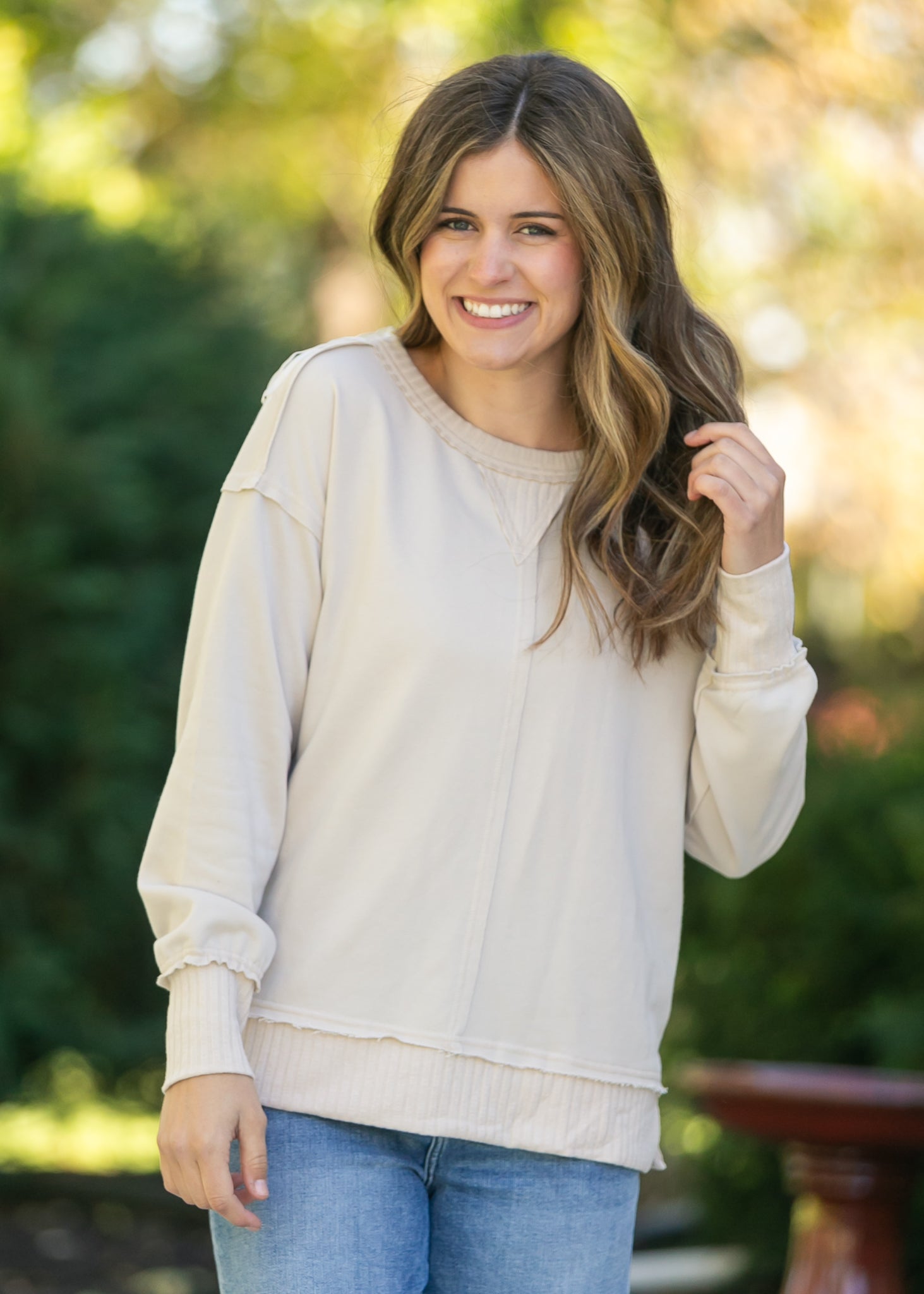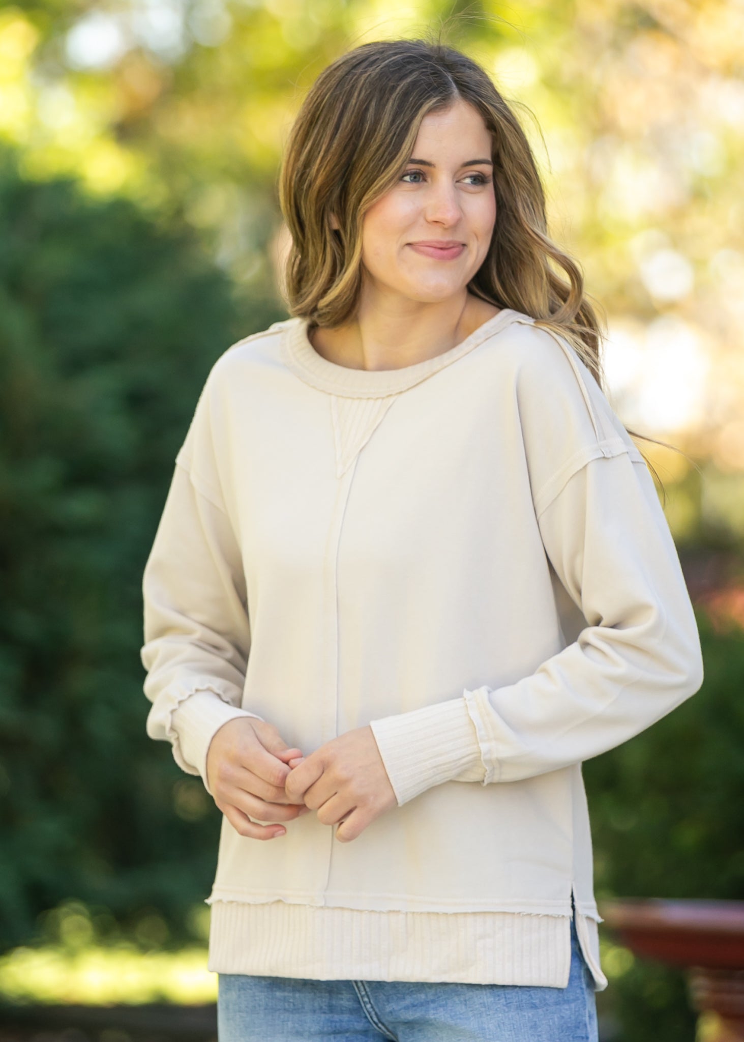 The French Terry Exposed Seam Sweatshirt offers a blend of cozy comfort and effortless modest style. Crafted from soft, breathable fabric, it features ribbed trim and raw-edge details for a relaxed, lived-in look. Its neutral hue makes it easy to pair with denim or a flowy skirt, creating a timeless outfit rooted in warmth and grace.
