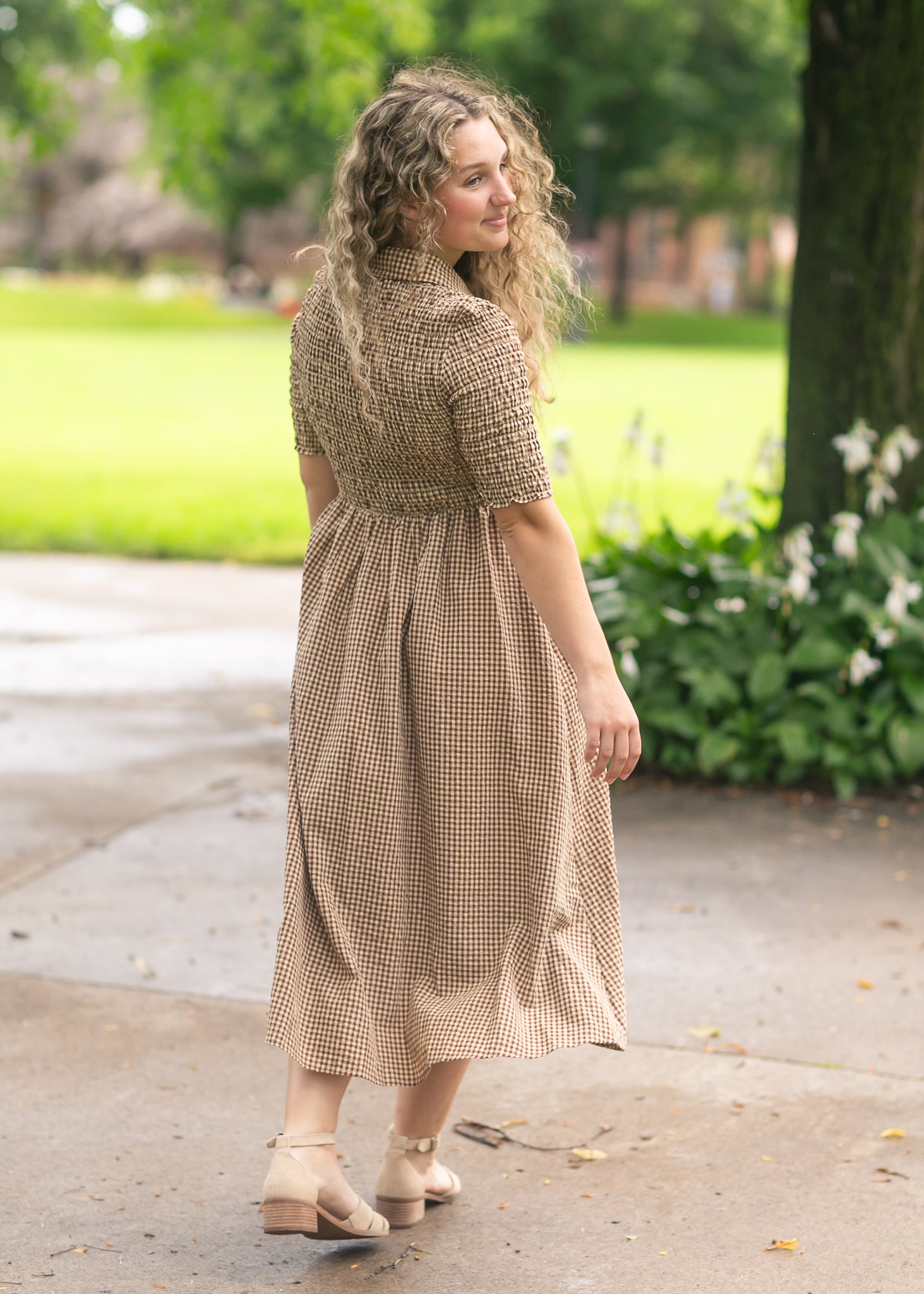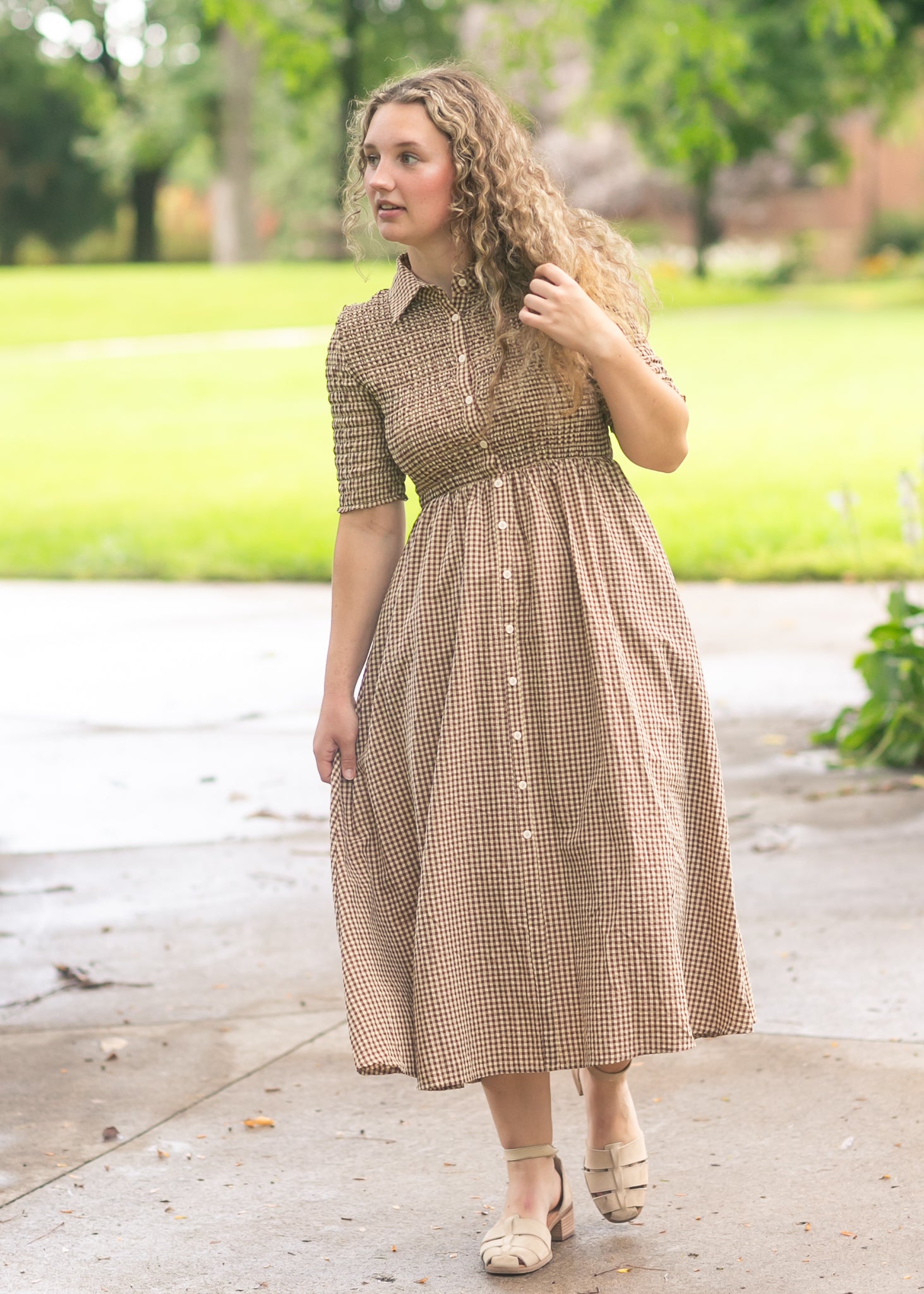 The Gingham Button Up Midi Dress blends nostalgic charm with everyday ease. A smocked bodice and collared neckline give structure, while the flowing skirt offers a graceful silhouette. Short sleeves and a button front add timeless detail, making it an effortless piece to wear with sandals in warm weather or layered under a cardigan for transitional days.