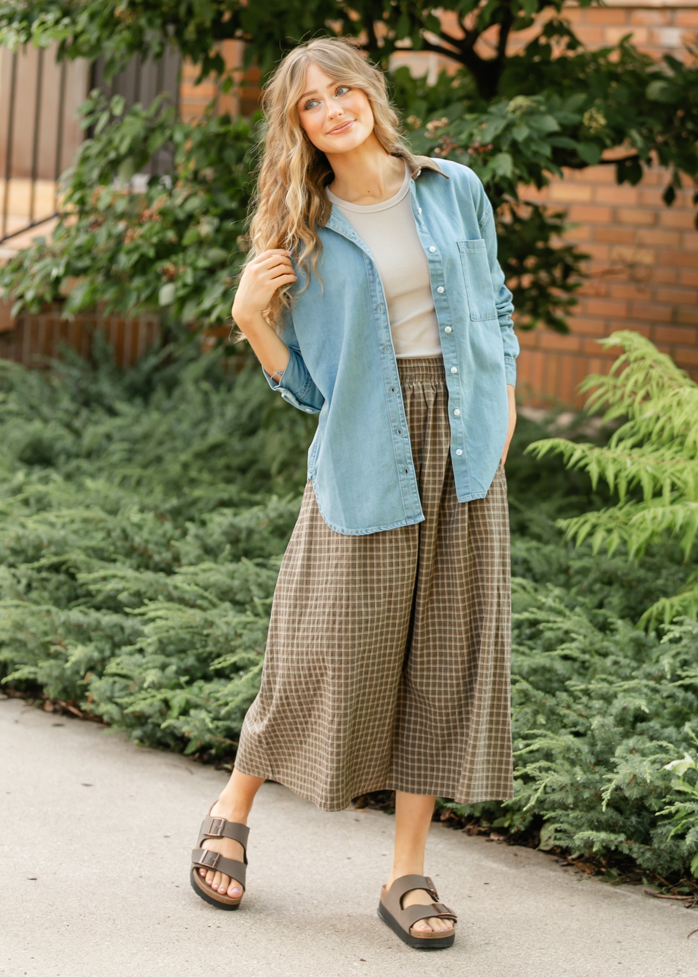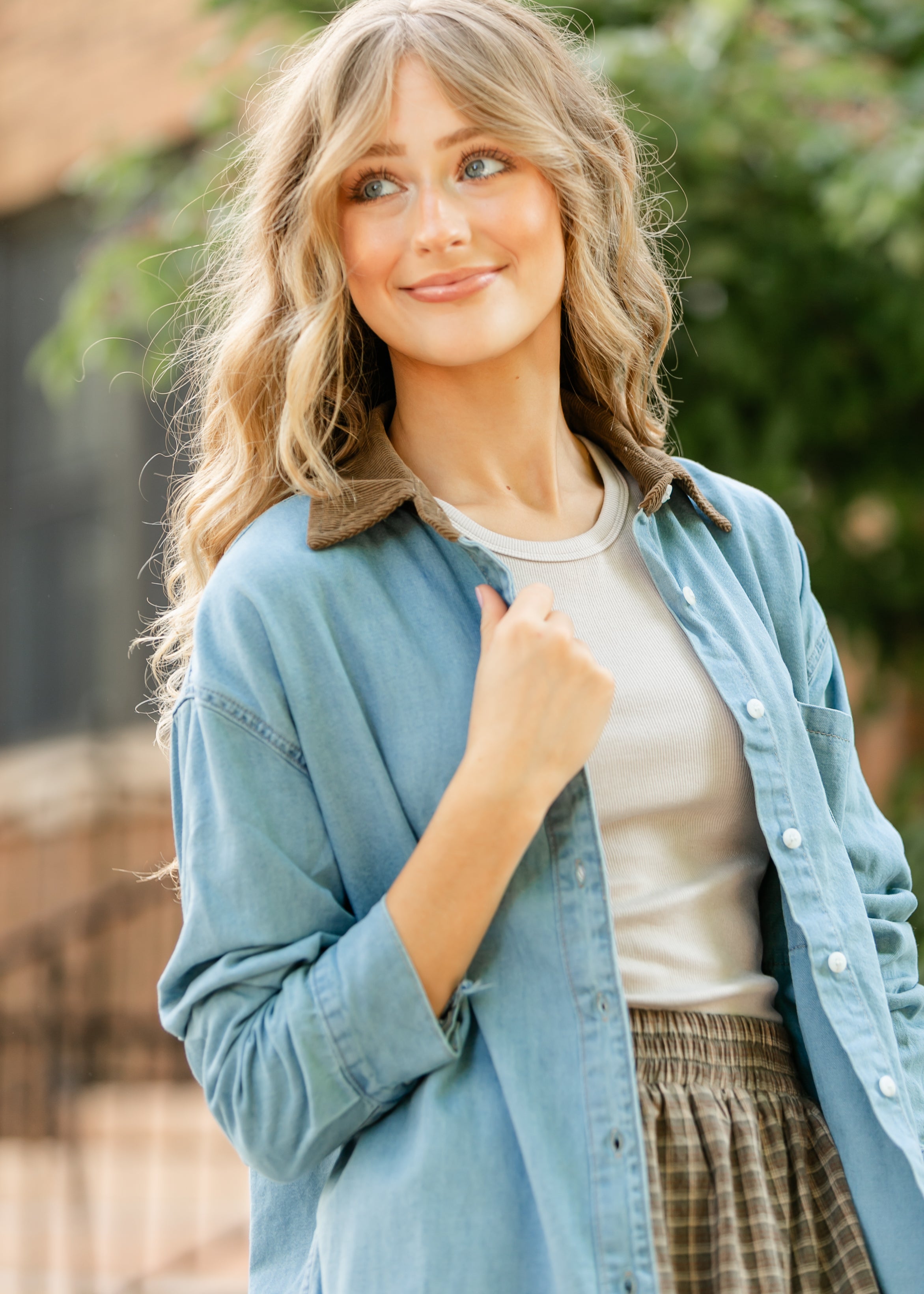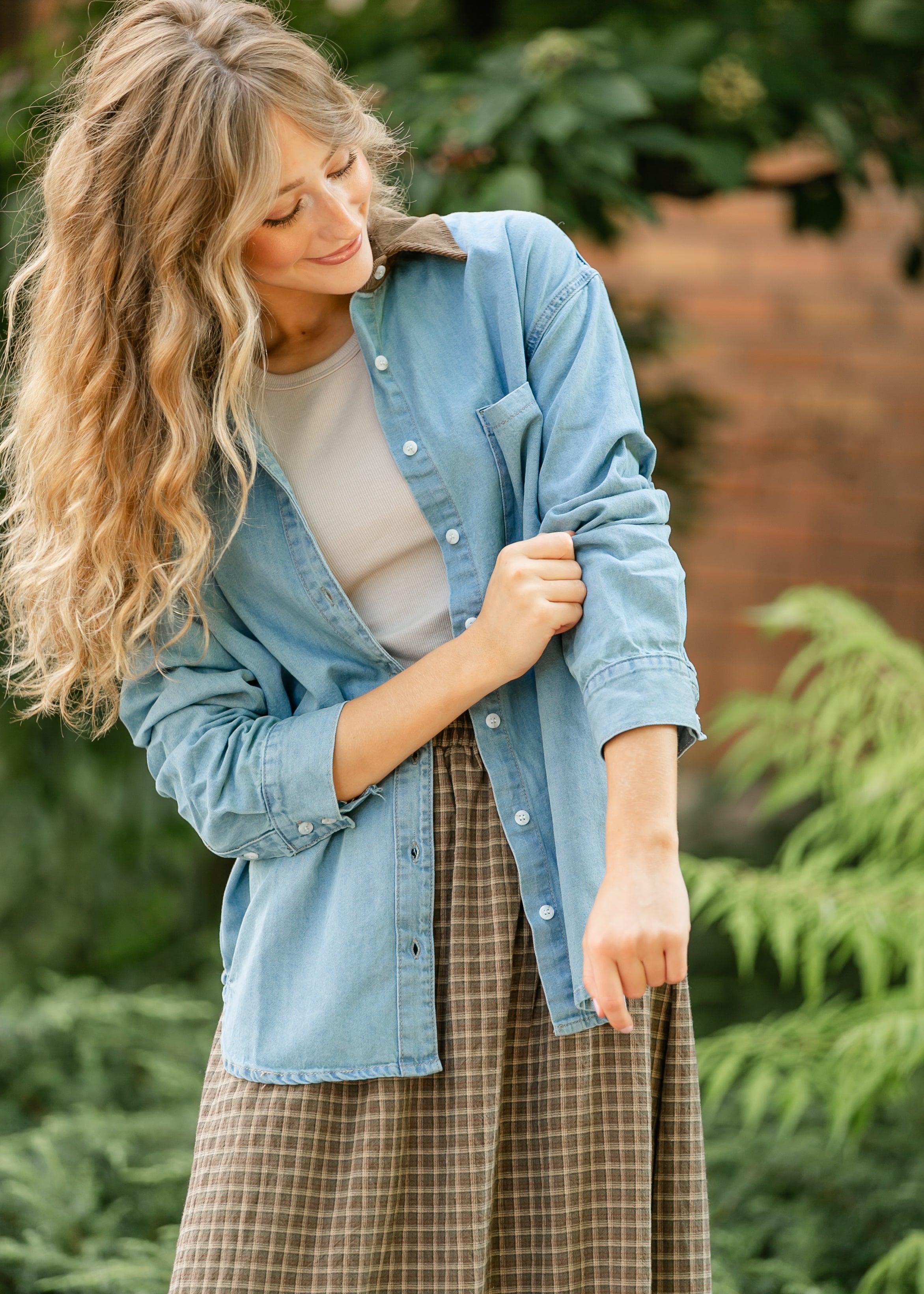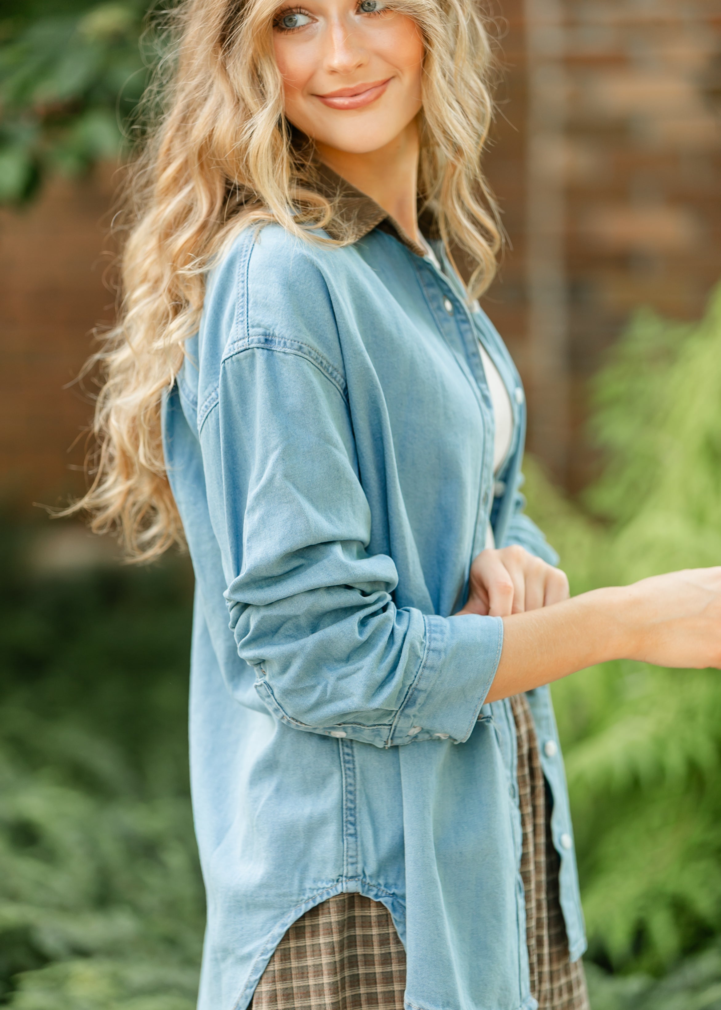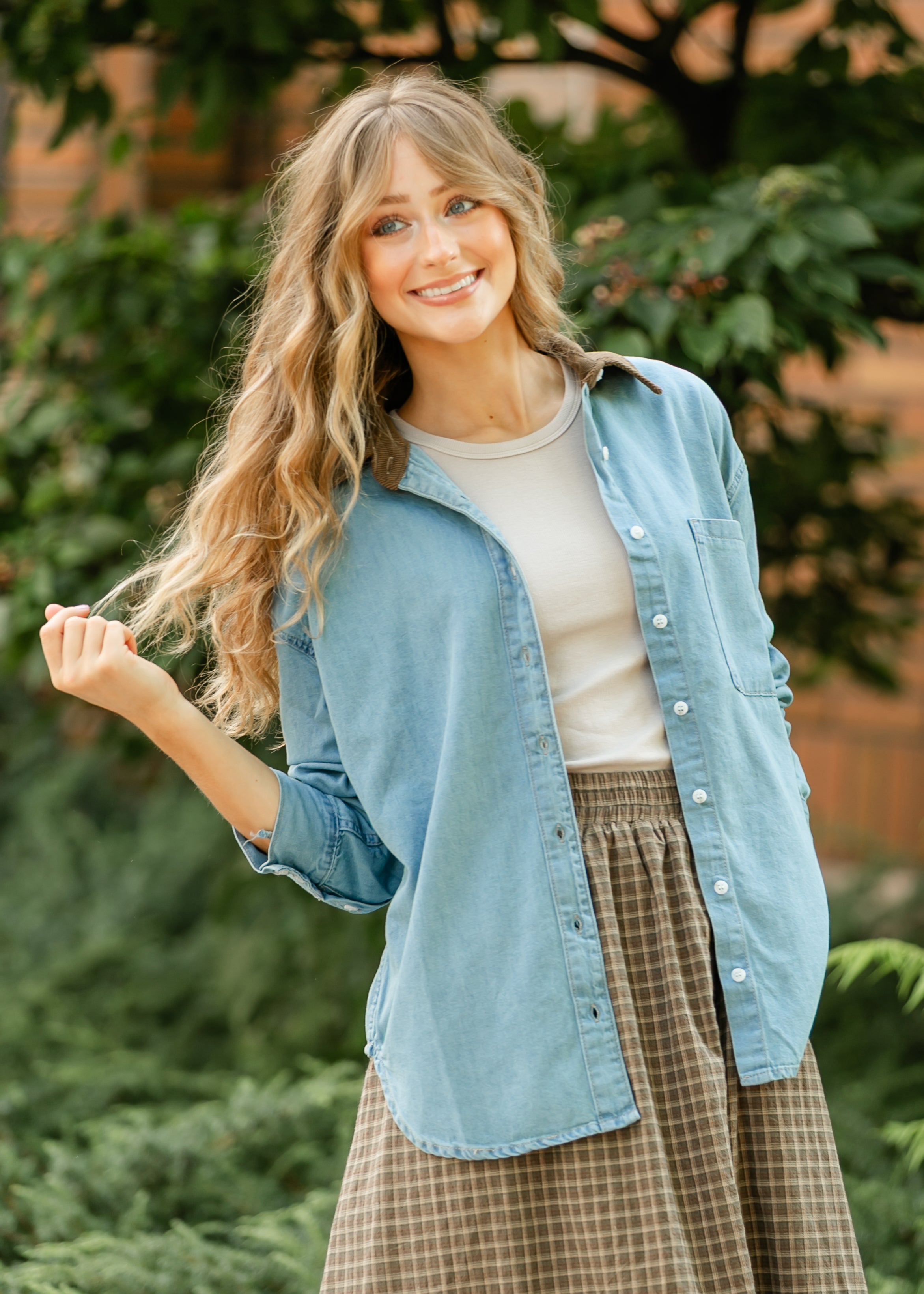 The Heartloom® Bonet Top blends classic utility with soft structure for everyday layering. Designed with a curved hem, stretch cuffed sleeves, and contrast collar detail, this lightweight chambray button-down adds effortless style to your outfit. It’s the kind of throw-on-and-go piece that instantly elevates your look without sacrificing comfort.