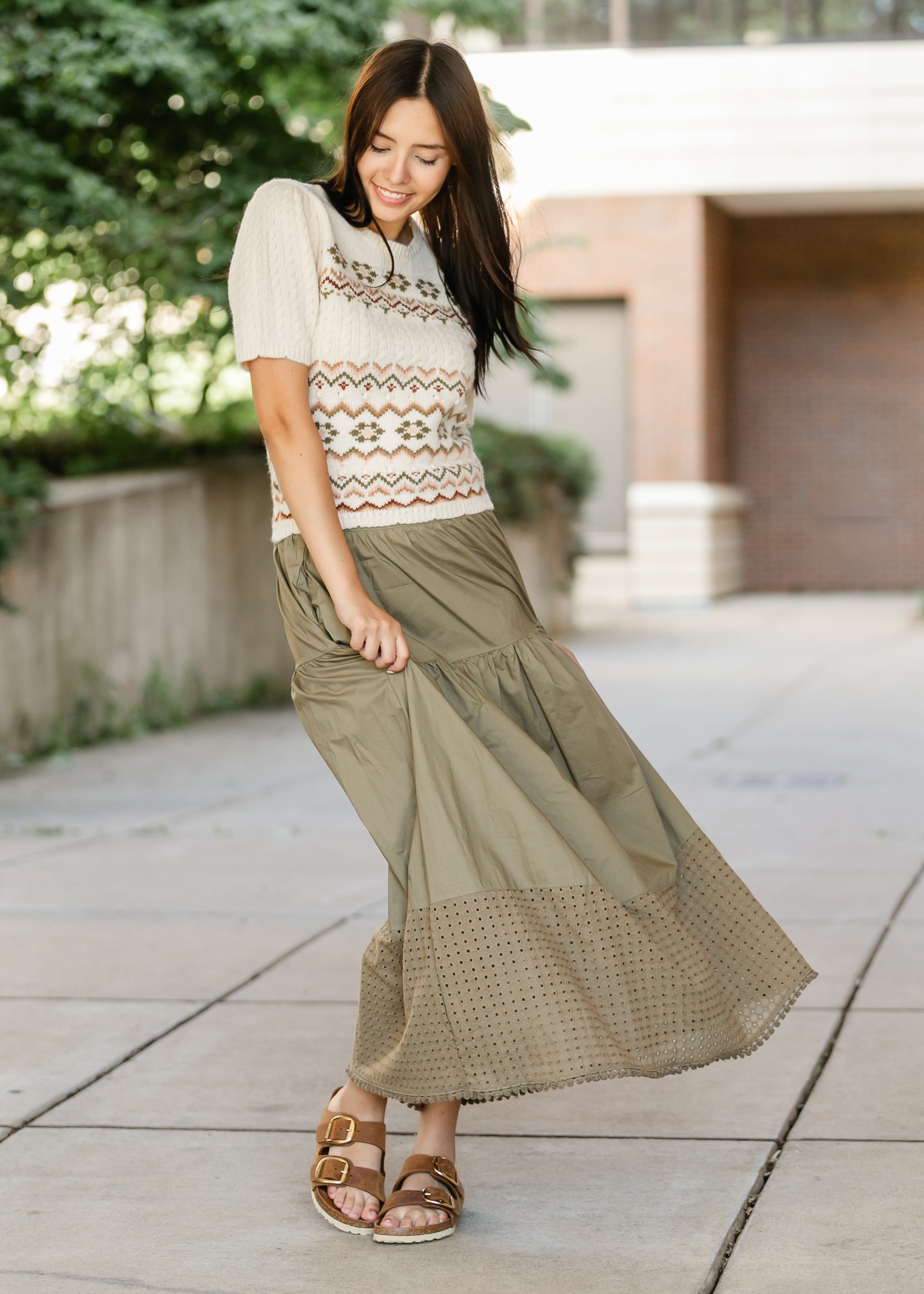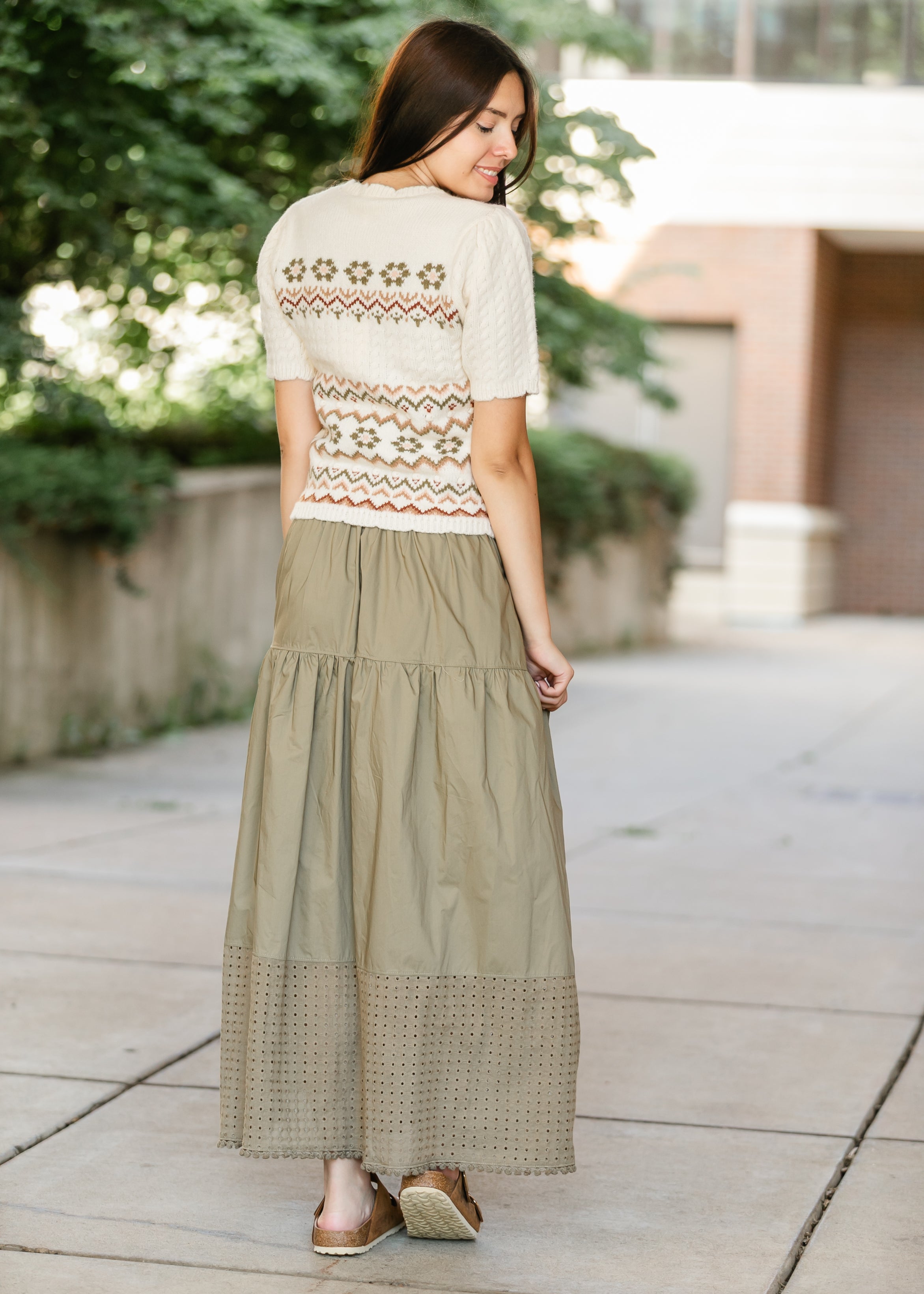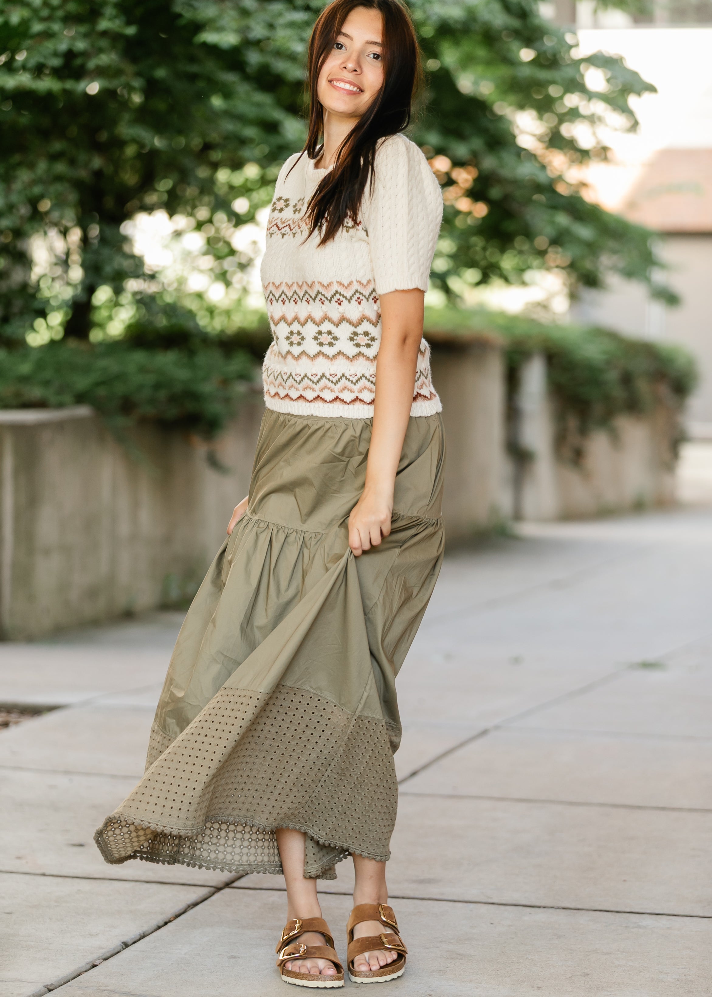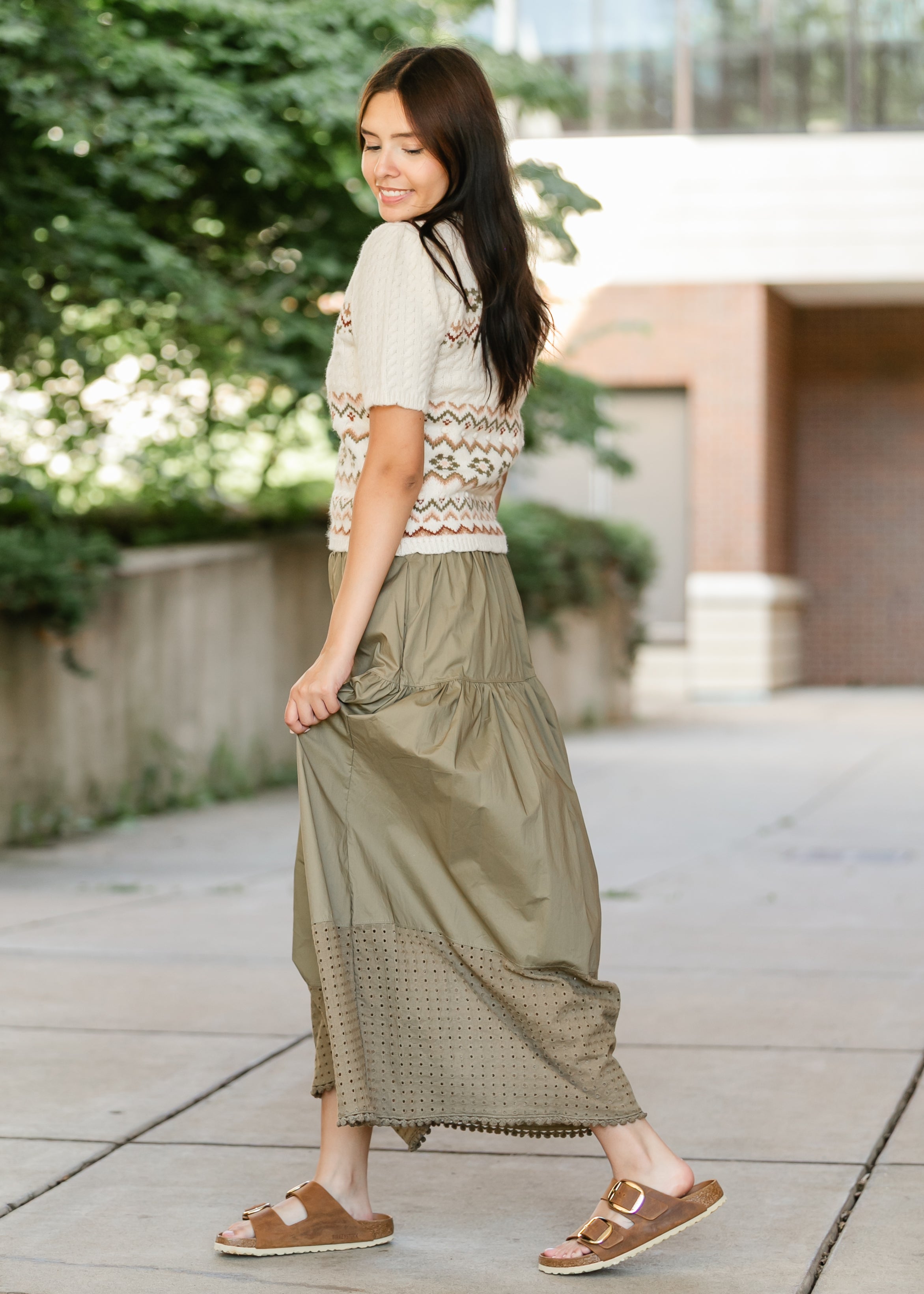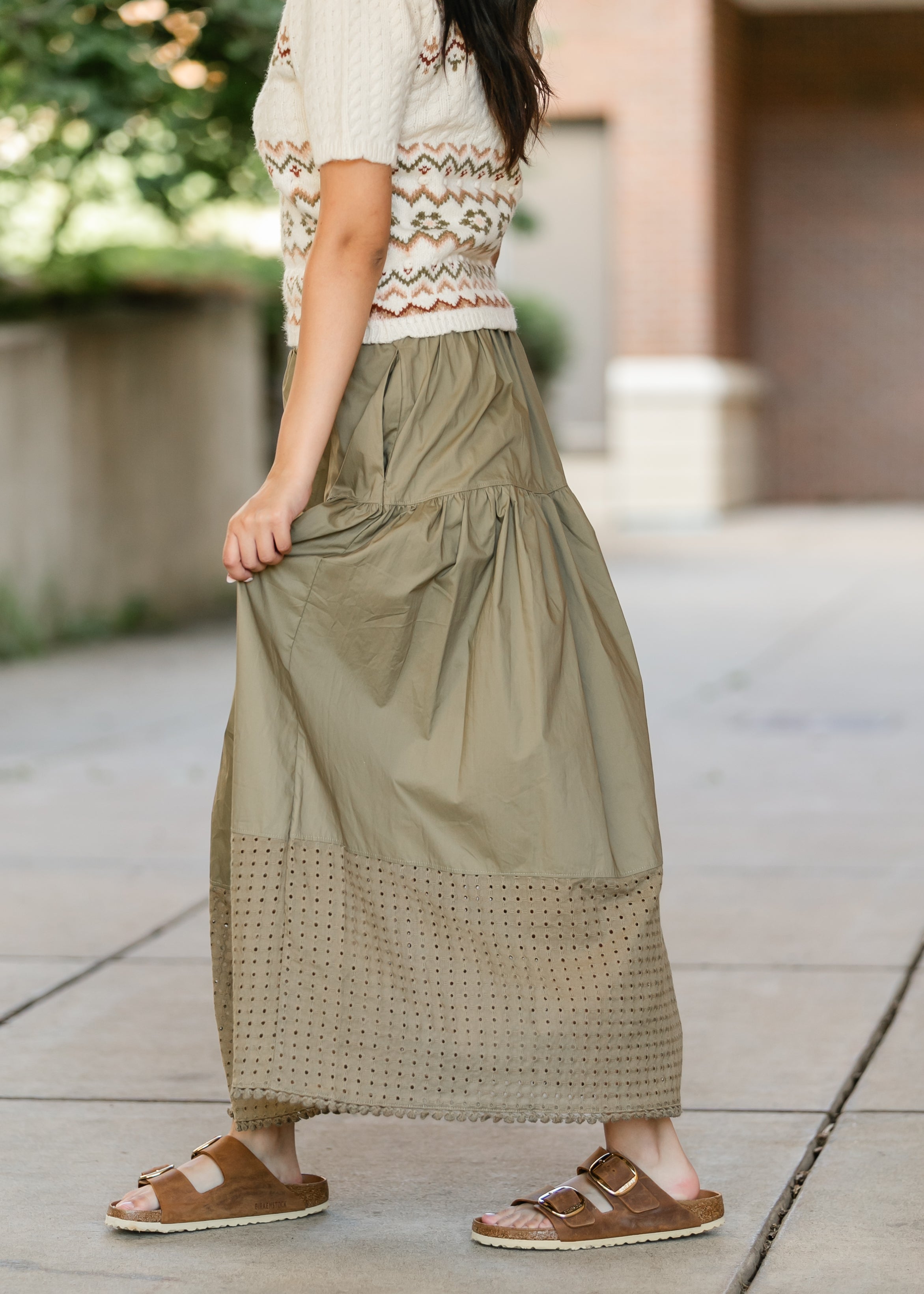 The Heartloom® Coco Eyelet Hem Maxi Skirt blends easy everyday wear with subtle sophistication. Designed with a gathered tier and wide waistband for a flattering fit, it finishes with an eyelet lace hem that adds breathable movement and texture. Side pockets offer convenience, while the olive hue brings versatility for styling with sneakers or sandals all season long.
