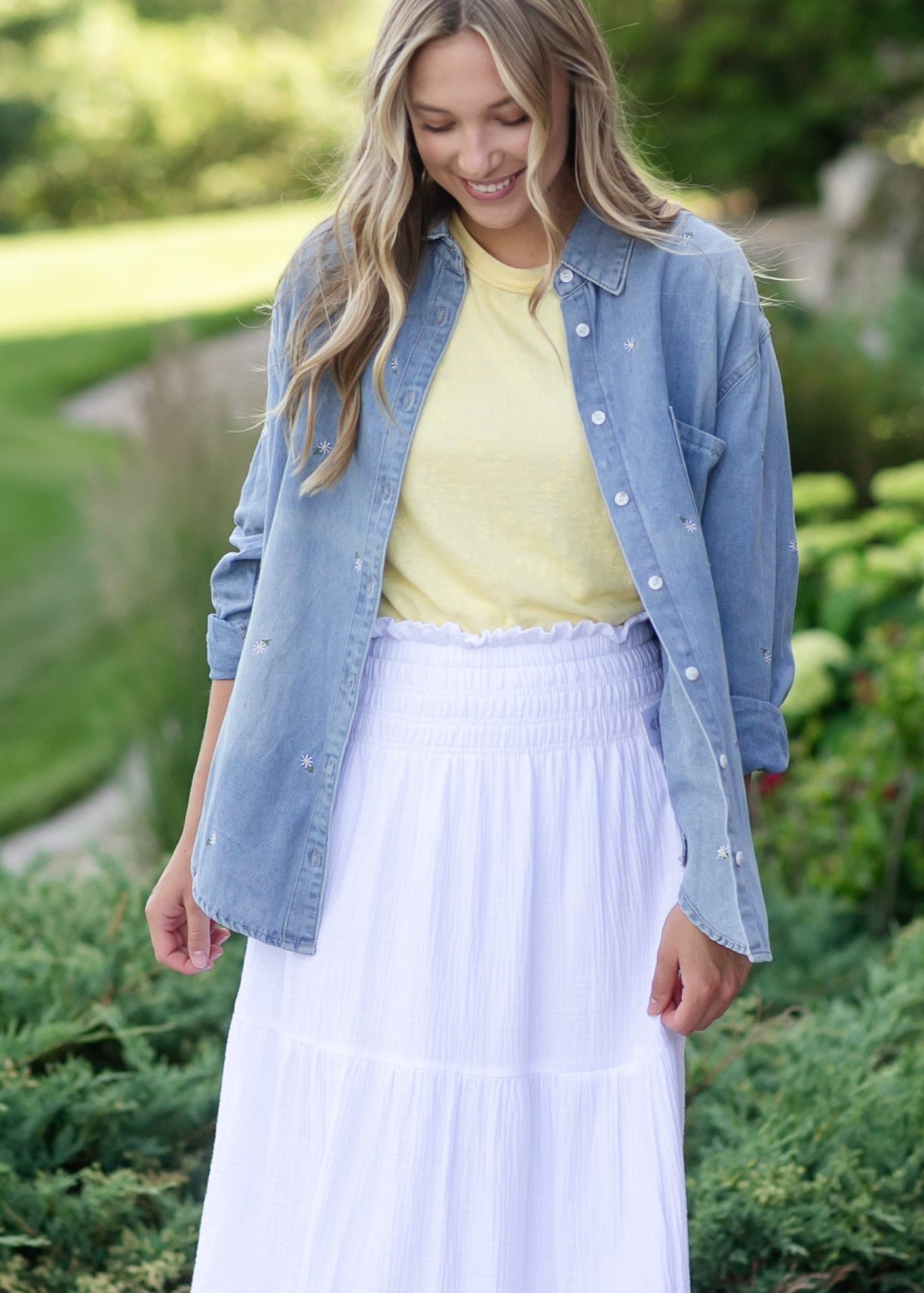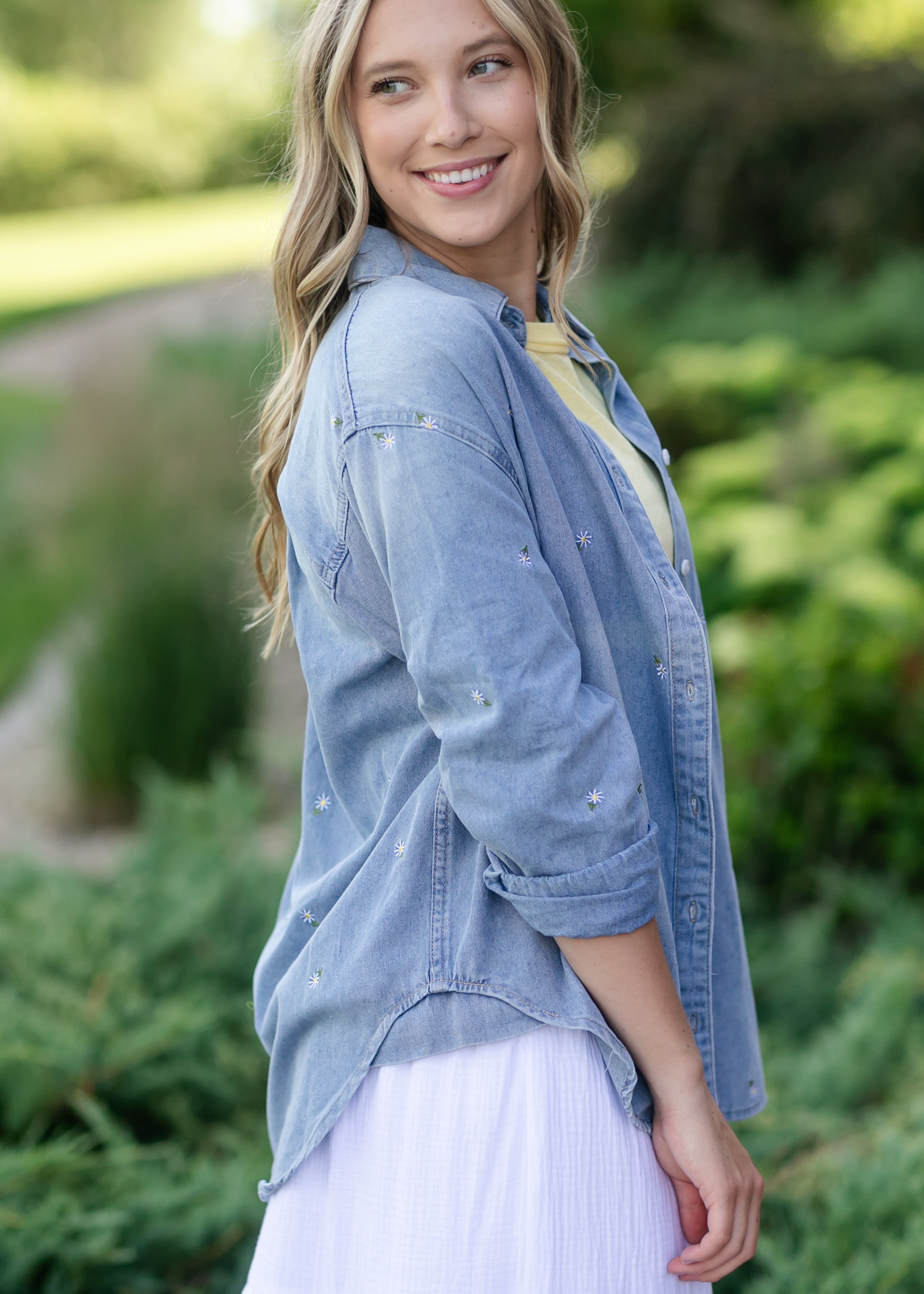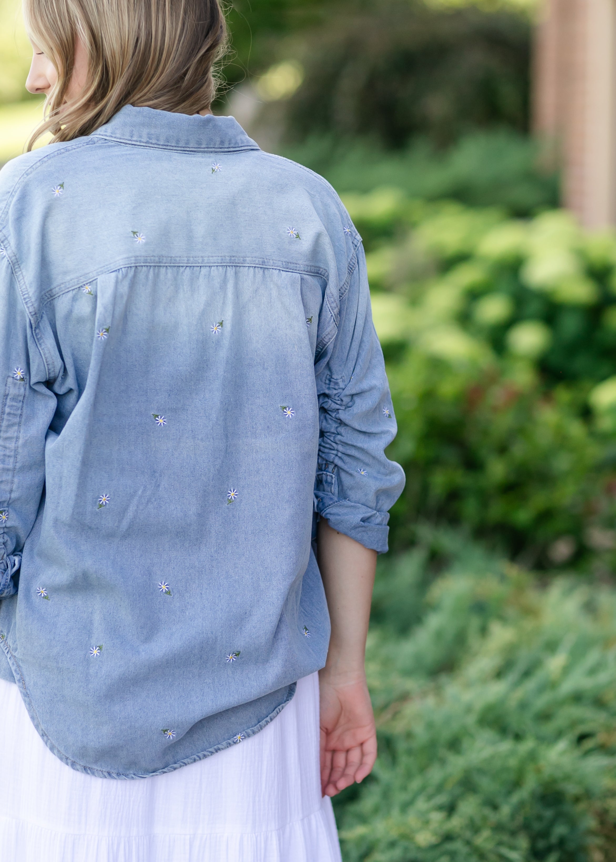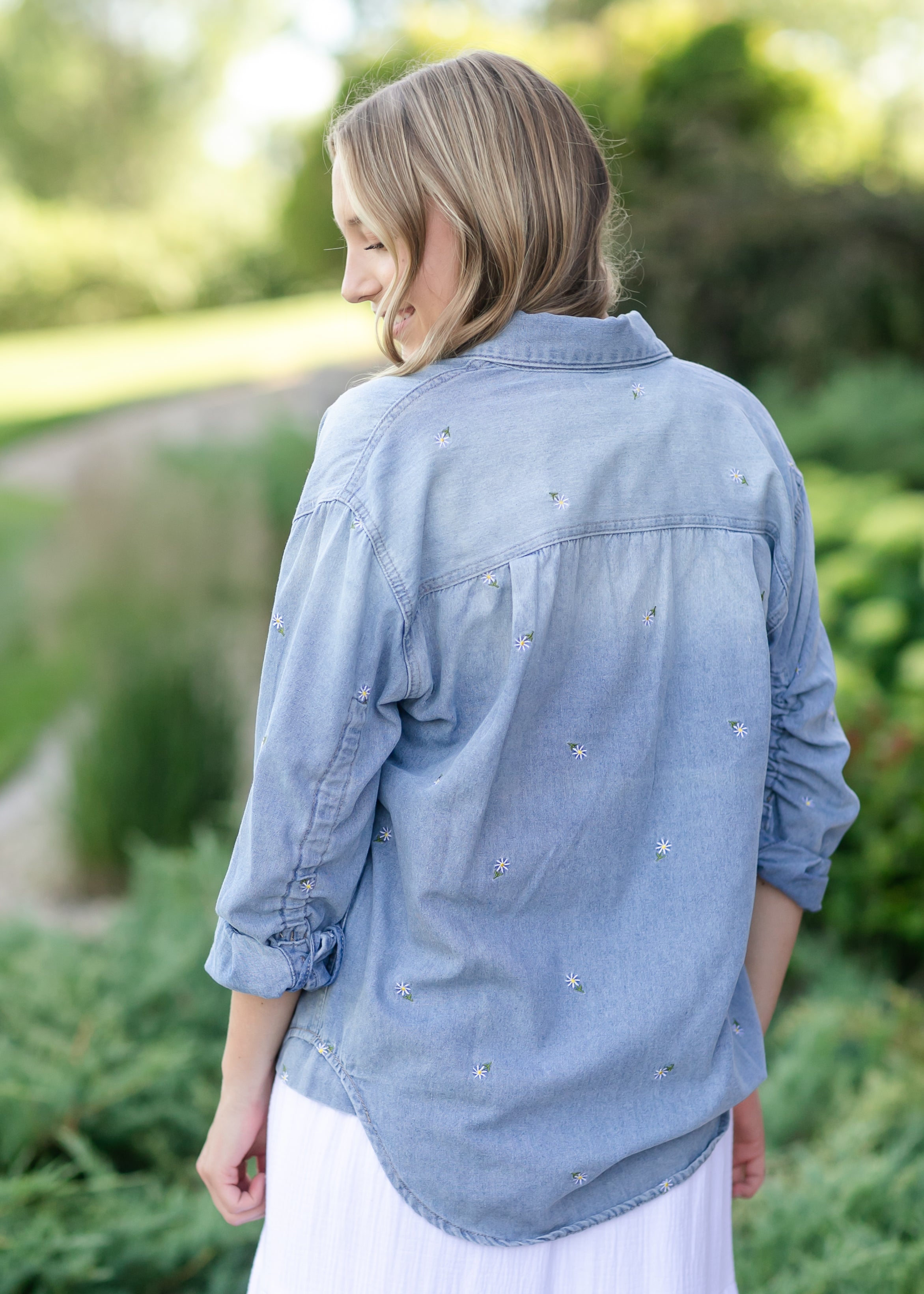The Heartloom® Harper Top is a relaxed-fit button down made from soft, washed denim with gentle ruching at the sleeves. Delicate floral embroidery adds a feminine finish, making it a sweet layering piece through every season. Whether you wear it open or buttoned up, this versatile modest top is perfect for adding a soft, casual touch to your everyday style!