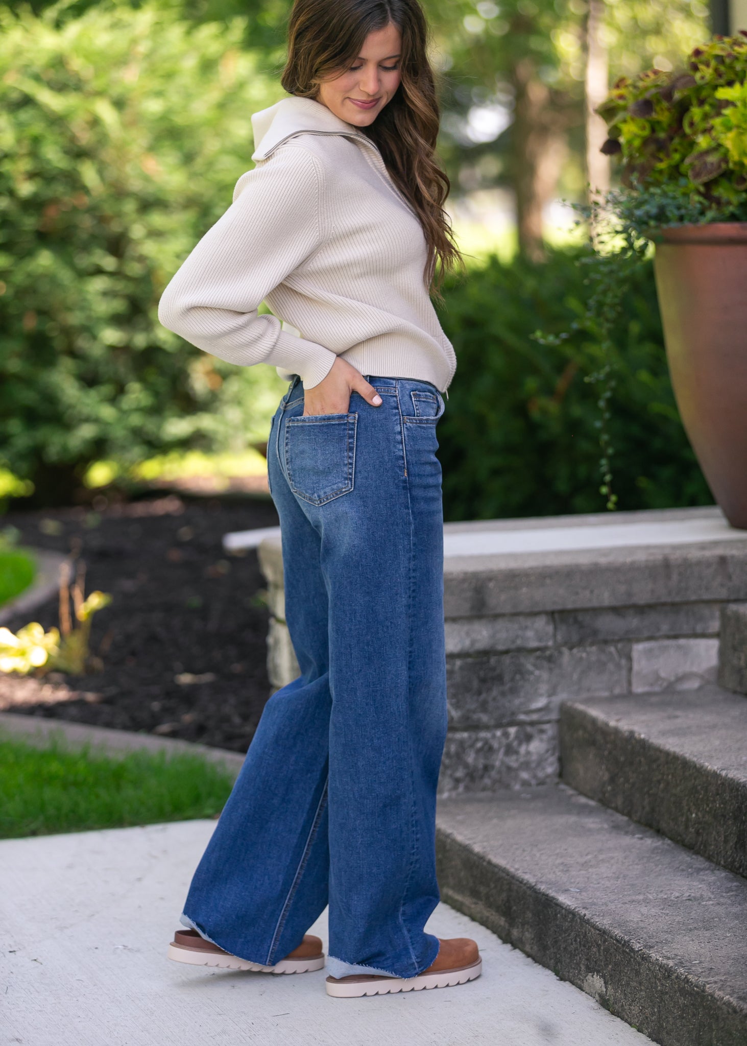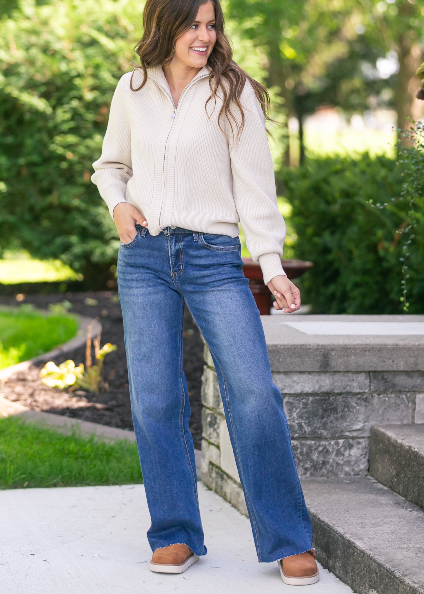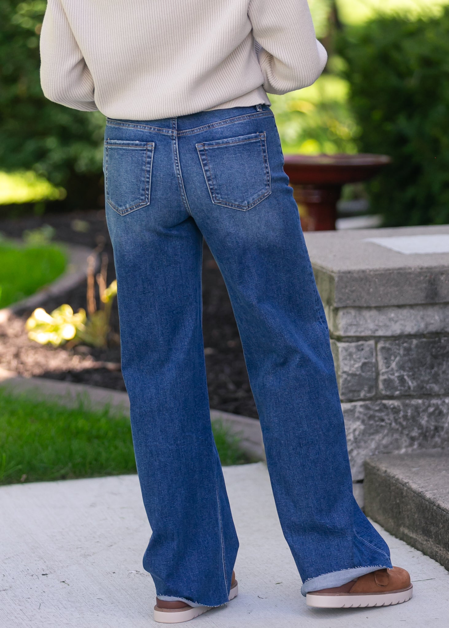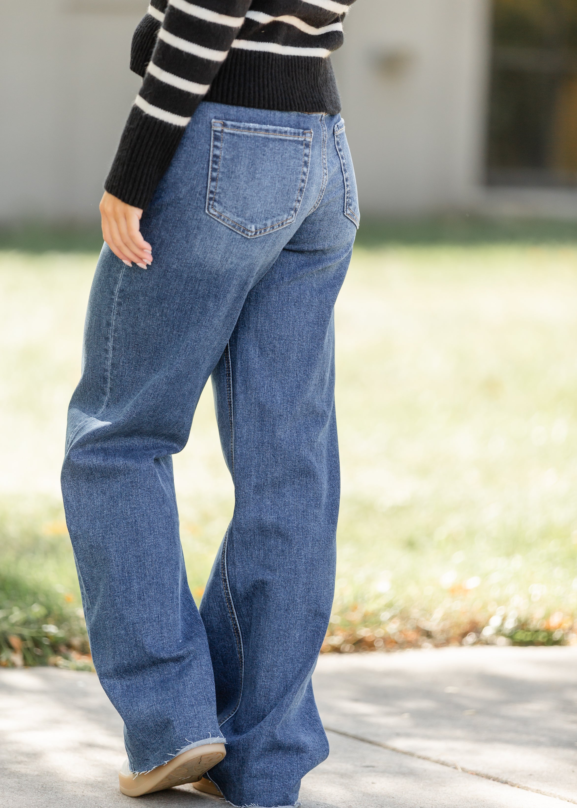 The High Rise Clean Cut Raw Hem Wide Jeans bring a fresh update to classic denim with their flattering high waist and wide leg silhouette. Designed in a medium wash with clean lines and an unfinished raw hem, they offer an easy balance of polish and edge. Pair with a fitted knit or cozy cardigan for effortless, modest everyday style.