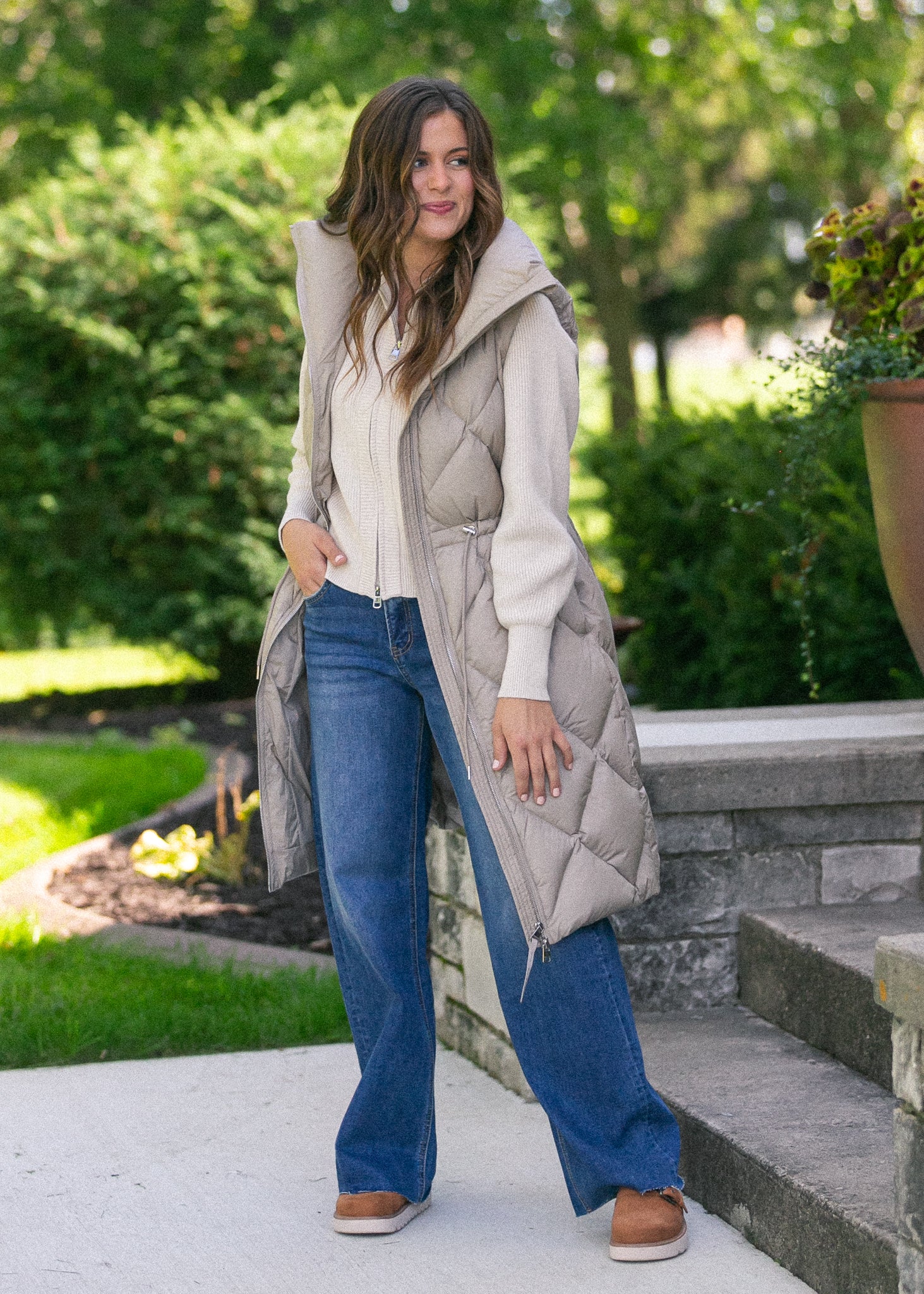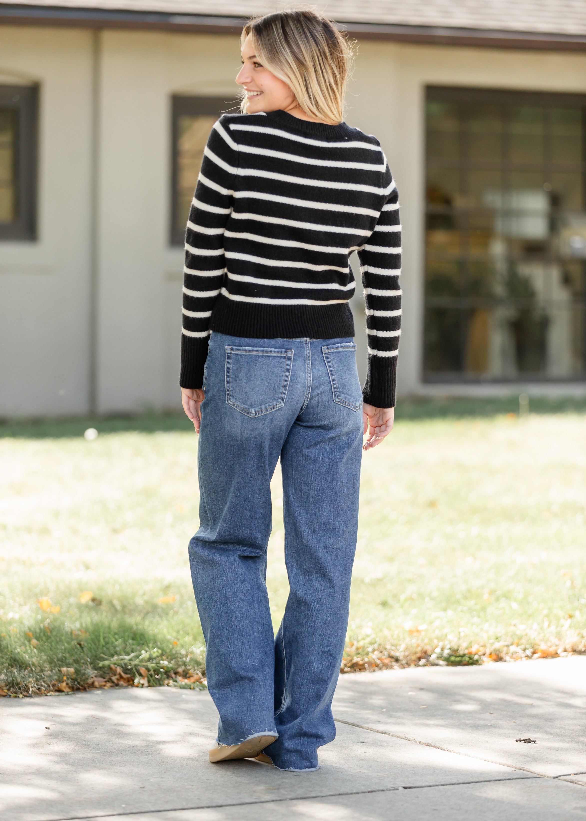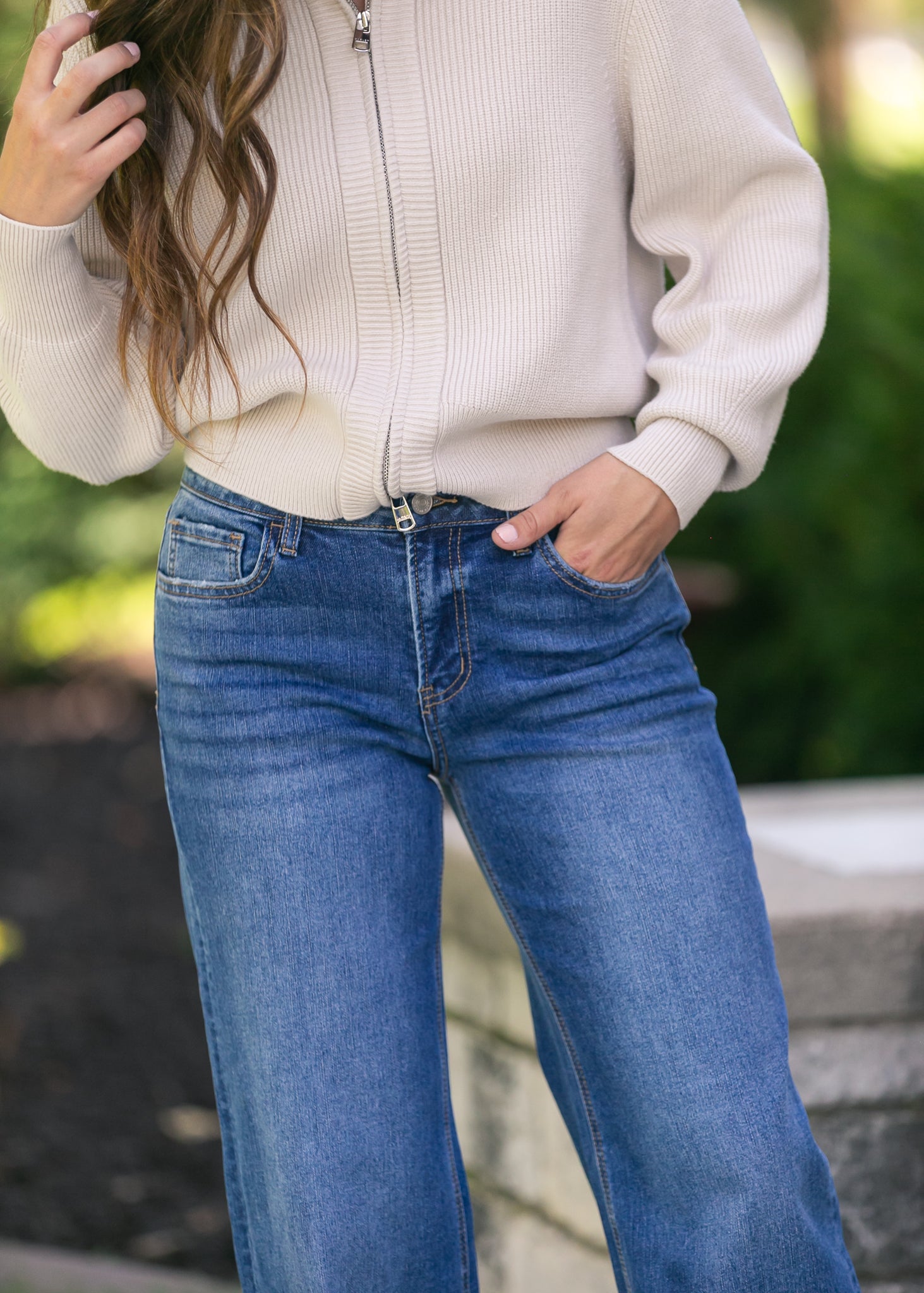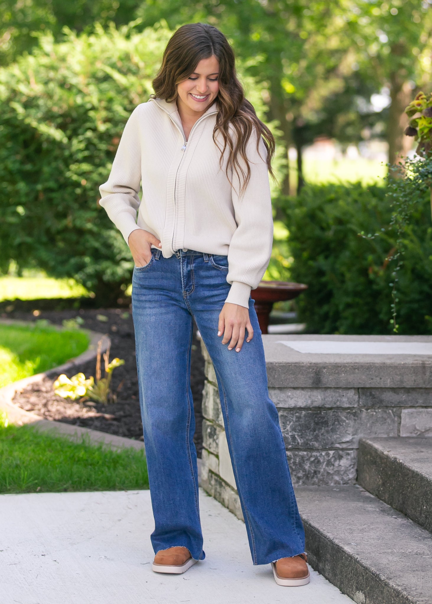 The High Rise Clean Cut Raw Hem Wide Jeans bring a fresh update to classic denim with their flattering high waist and wide leg silhouette. Designed in a medium wash with clean lines and an unfinished raw hem, they offer an easy balance of polish and edge. Pair with a fitted knit or cozy cardigan for effortless, modest everyday style.