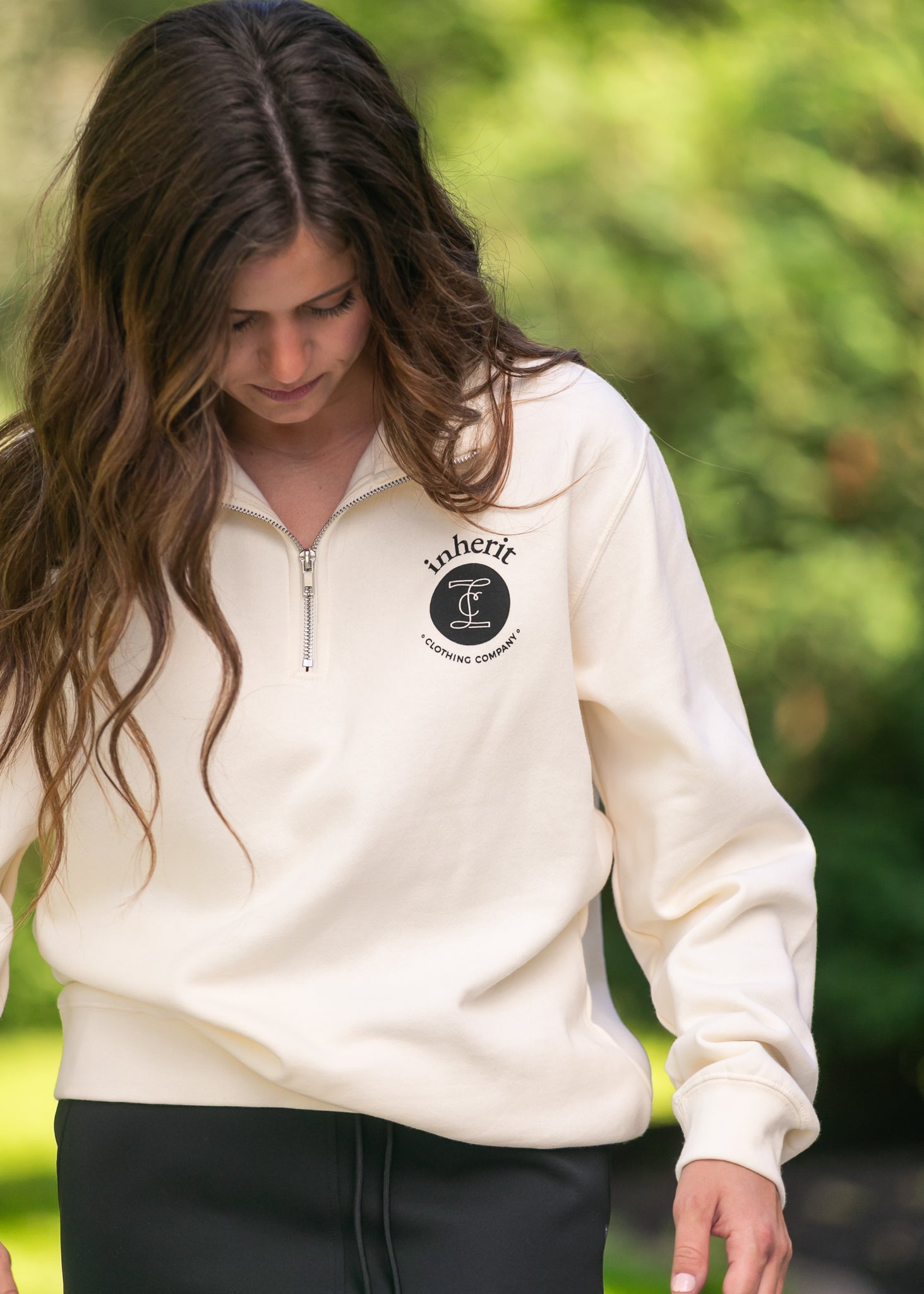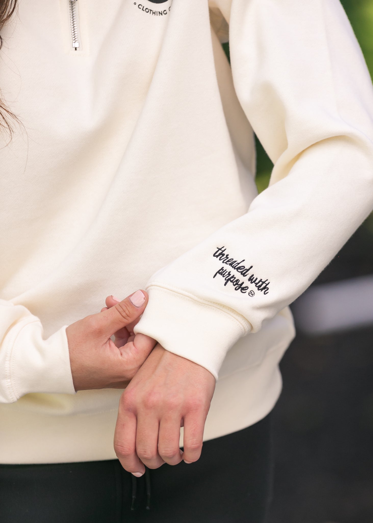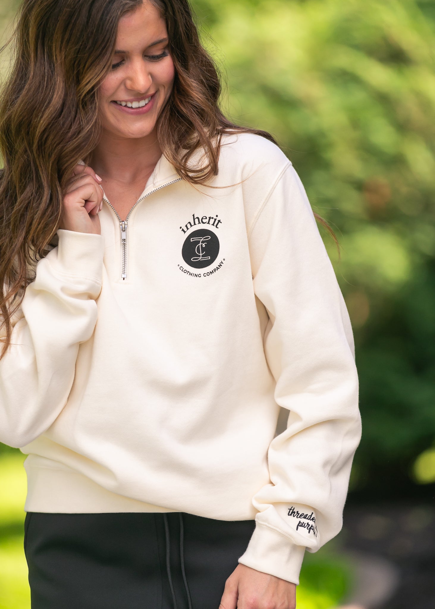 The Inherit Threaded with Purpose Graphic 1/4 Zip is designed for cozy layering with a meaningful touch. Crafted in a soft cream hue, this relaxed quarter-zip features our Inherit Clothing Co. logo at the chest and “threaded with purpose” embroidery at the sleeve. Pair it effortlessly with denim skirts or flowy midi styles for a casual, modest look that’s both uplifting and comfortable.