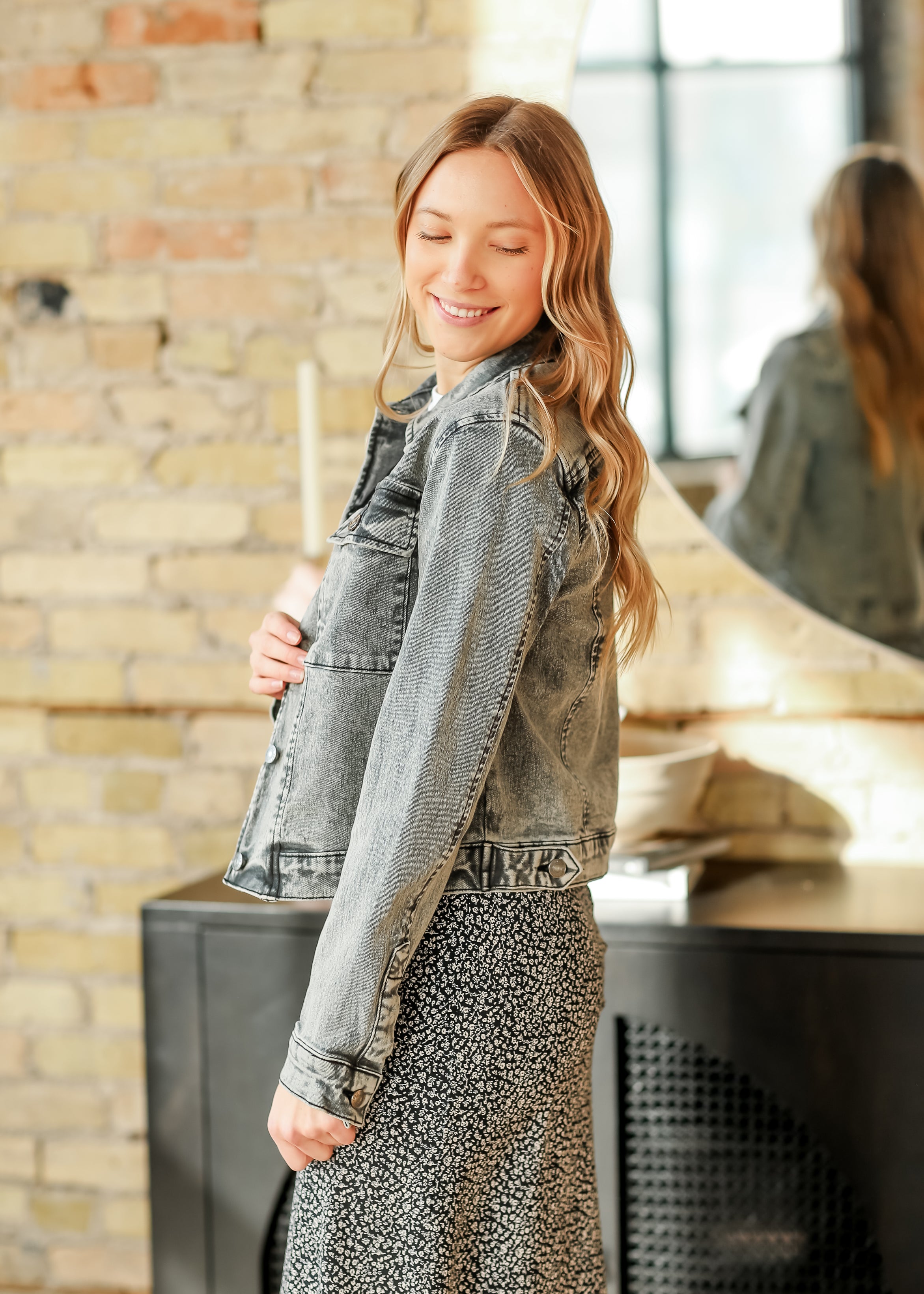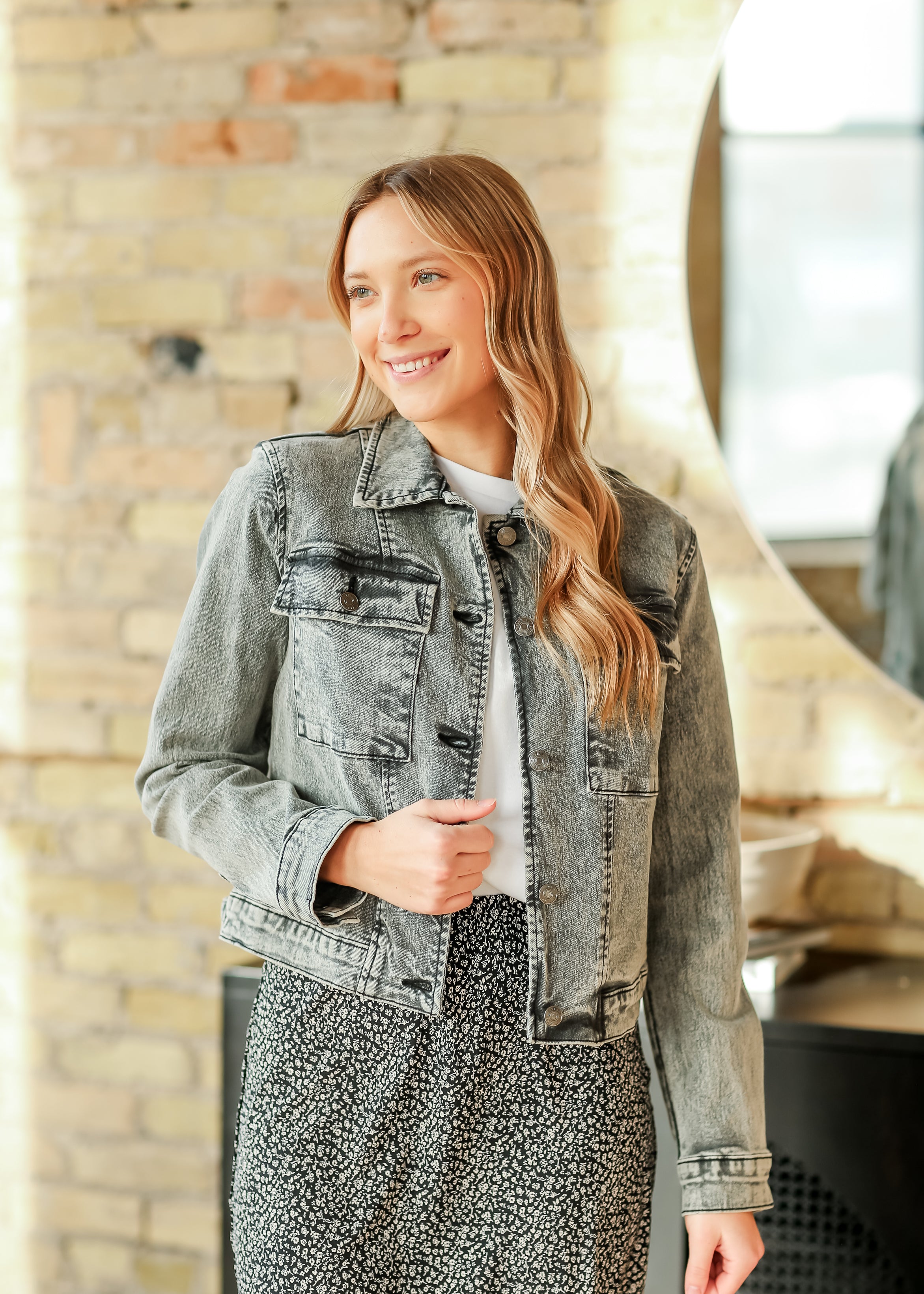 Elevate your casual wardrobe with the Josalyn Gray Denim Trucker Jacket, a versatile layering piece that combines classic style with a modern edge. Crafted from durable gray-washed denim, this jacket features a slightly cropped silhouette, button-front closure, and dual chest pockets for both functionality and style. The structured fit and subtle distressing give it a timeless, effortlessly cool appeal. Pair it with skirts, dresses, or your favorite denim for a chic, layered look perfect for any season. Whether you’re running errands or heading out for an evening with friends, the Josalyn Gray Denim Trucker Jacket is your go-to choice for fashionable comfort.