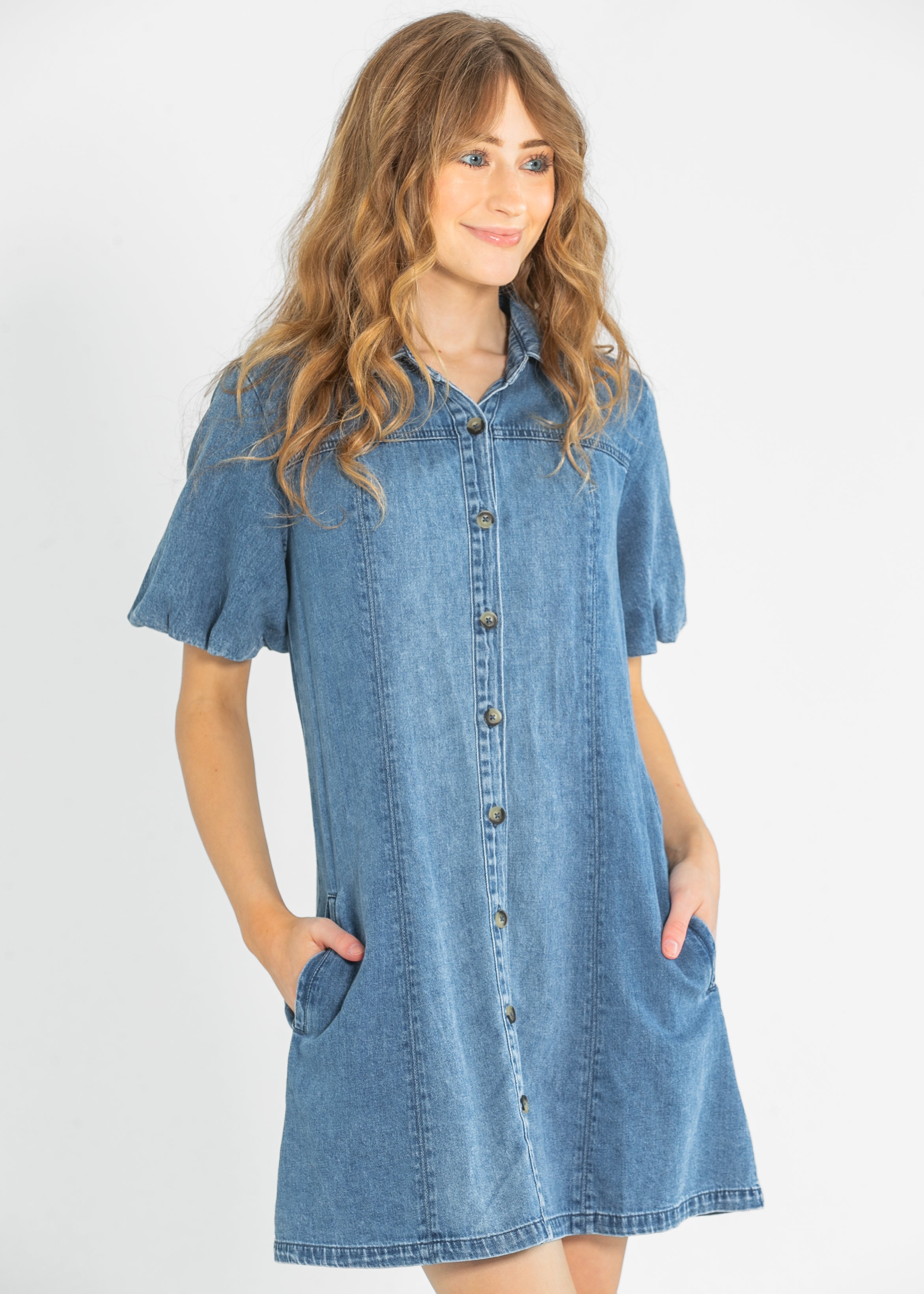 Crafted for classic comfort with modern ease, the Kut from the Kloth® Blanca Denim Shirt Dress is your go-to for effortless styling. Featuring soft puff sleeves, a full button-down front, and handy pockets, this versatile piece is perfect layered or worn solo. The relaxed fit and vintage-inspired wash make it a timeless favorite you'll reach for again and again.