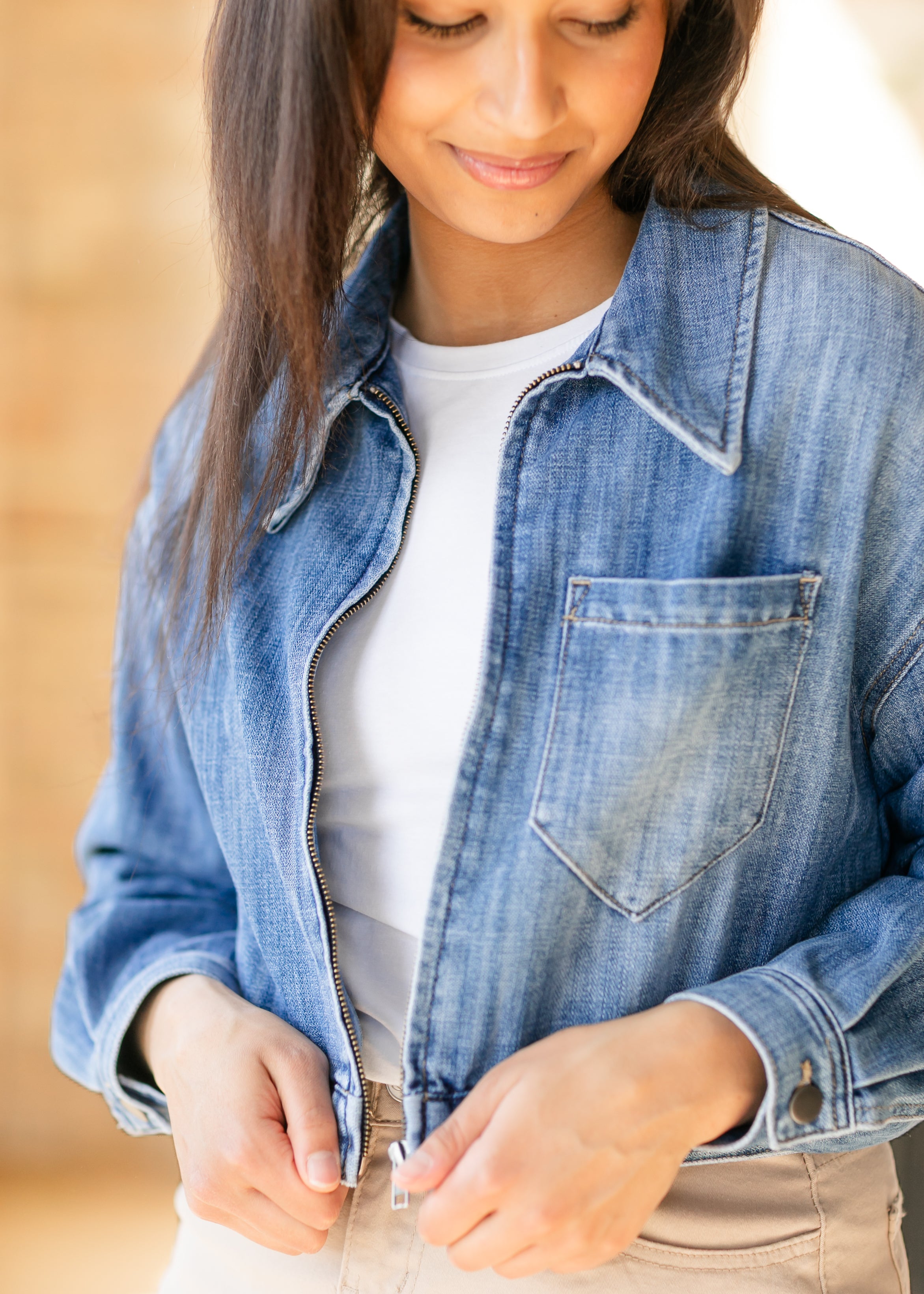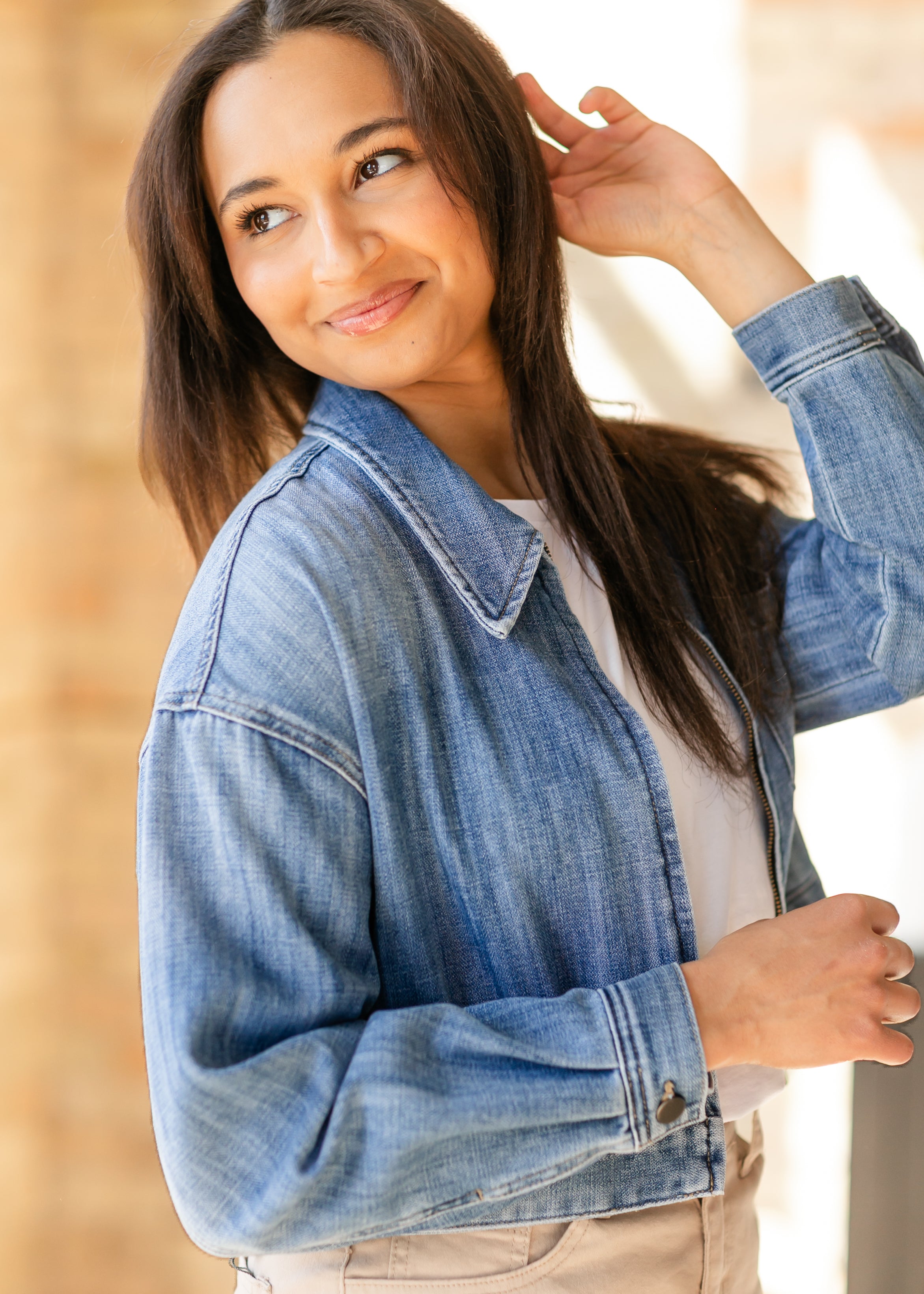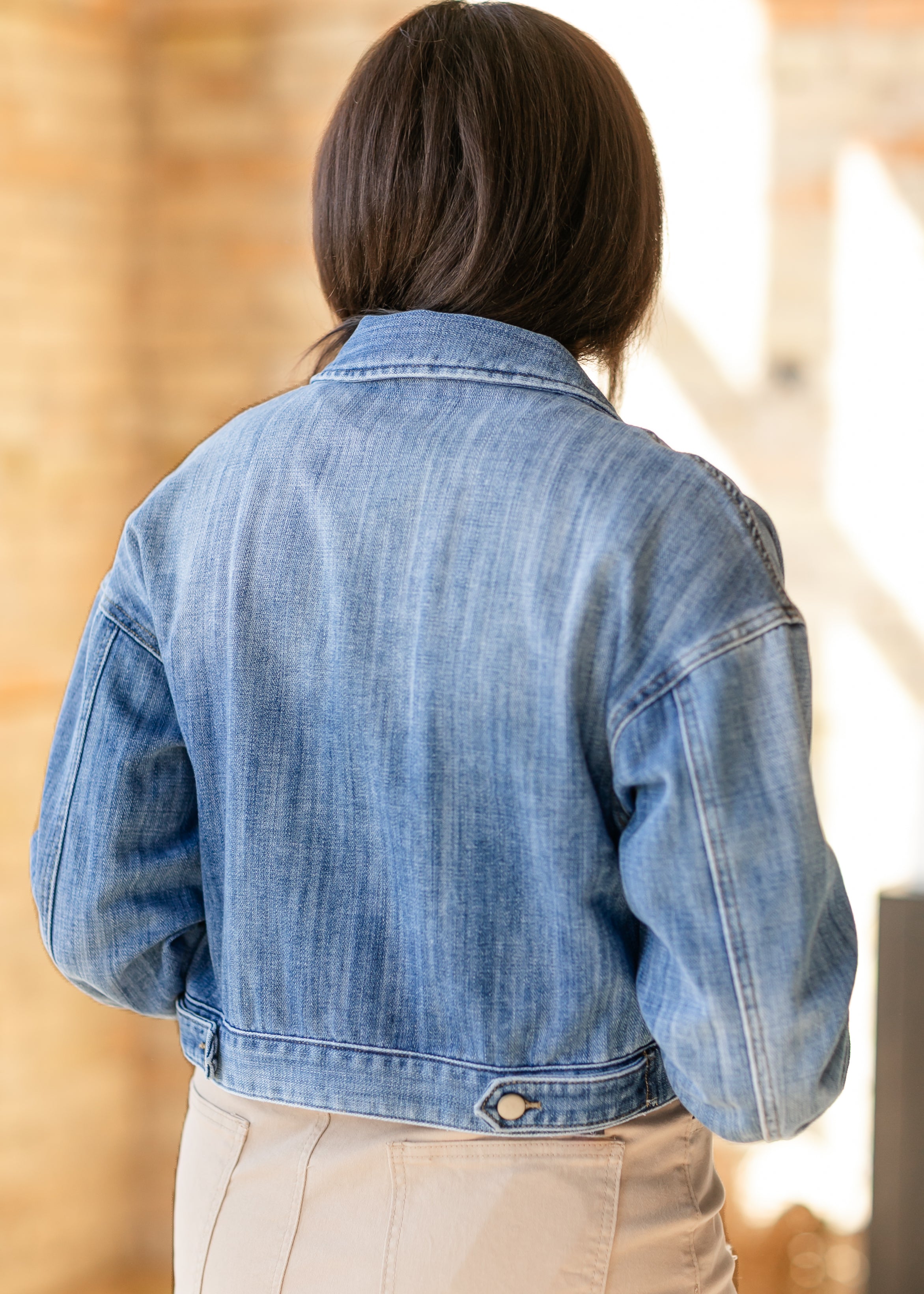 The KUT from the Kloth® Luna Oversized Crop Zip Front Jacket is the perfect blend of laid-back style and modern edge. Designed with an oversized fit and a cropped silhouette, this jacket offers a trendy, relaxed look that pairs effortlessly with everything from denim skirts to casual dresses. The front zipper closure adds a sleek, polished touch, while the functional front pockets provide convenience without compromising style. Crafted from high-quality denim, this jacket is a versatile layering piece that can be dressed up or down for any season. Whether you're running errands, heading out for a weekend brunch, or adding a touch of cool to your everyday outfit, the Luna jacket is a must-have staple in your wardrobe. The slightly distressed wash gives it a lived-in feel, making it the ideal companion for effortless, casual-chic dressing. Stay stylish and comfortable all day long with this go-to layering essential!
