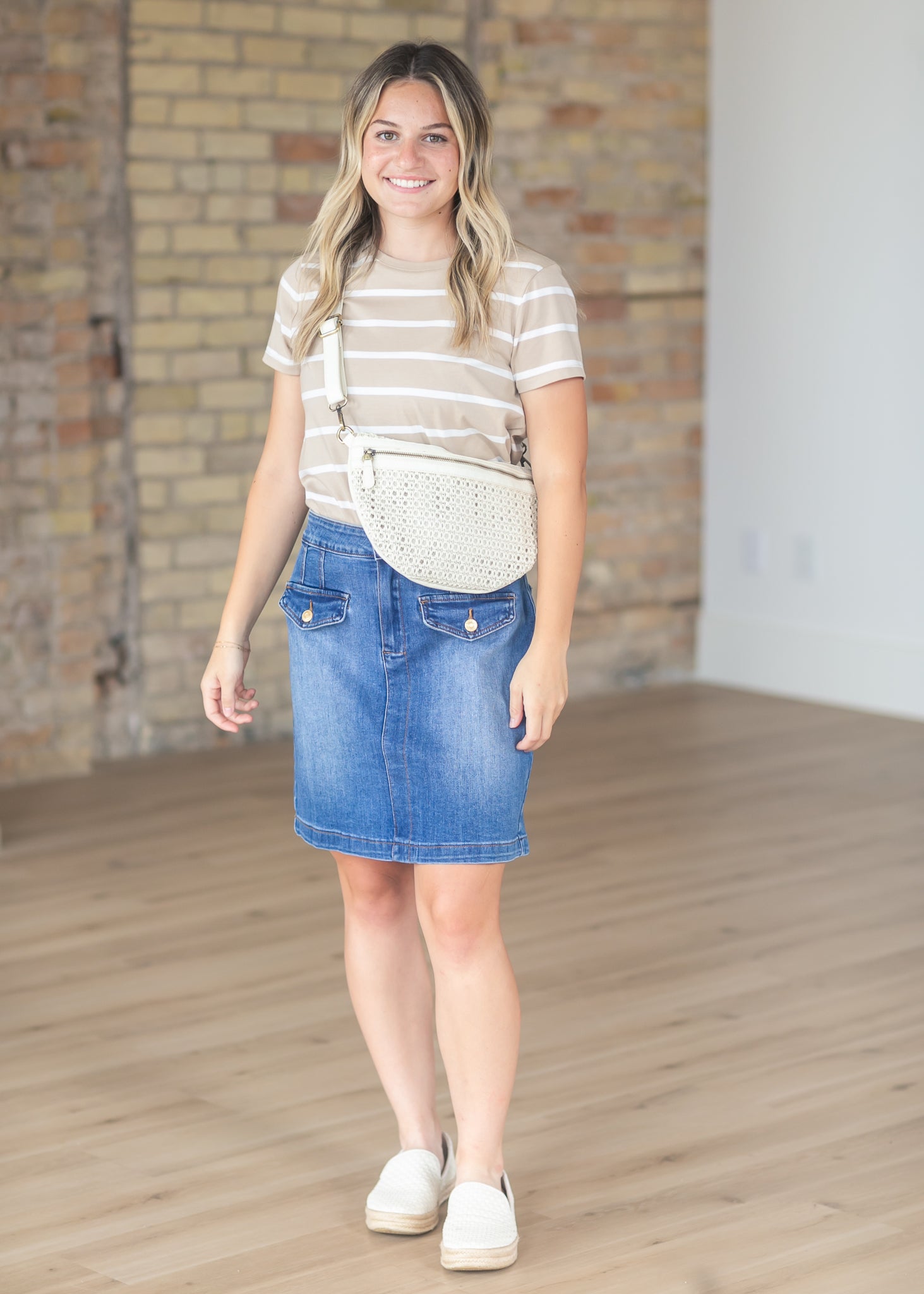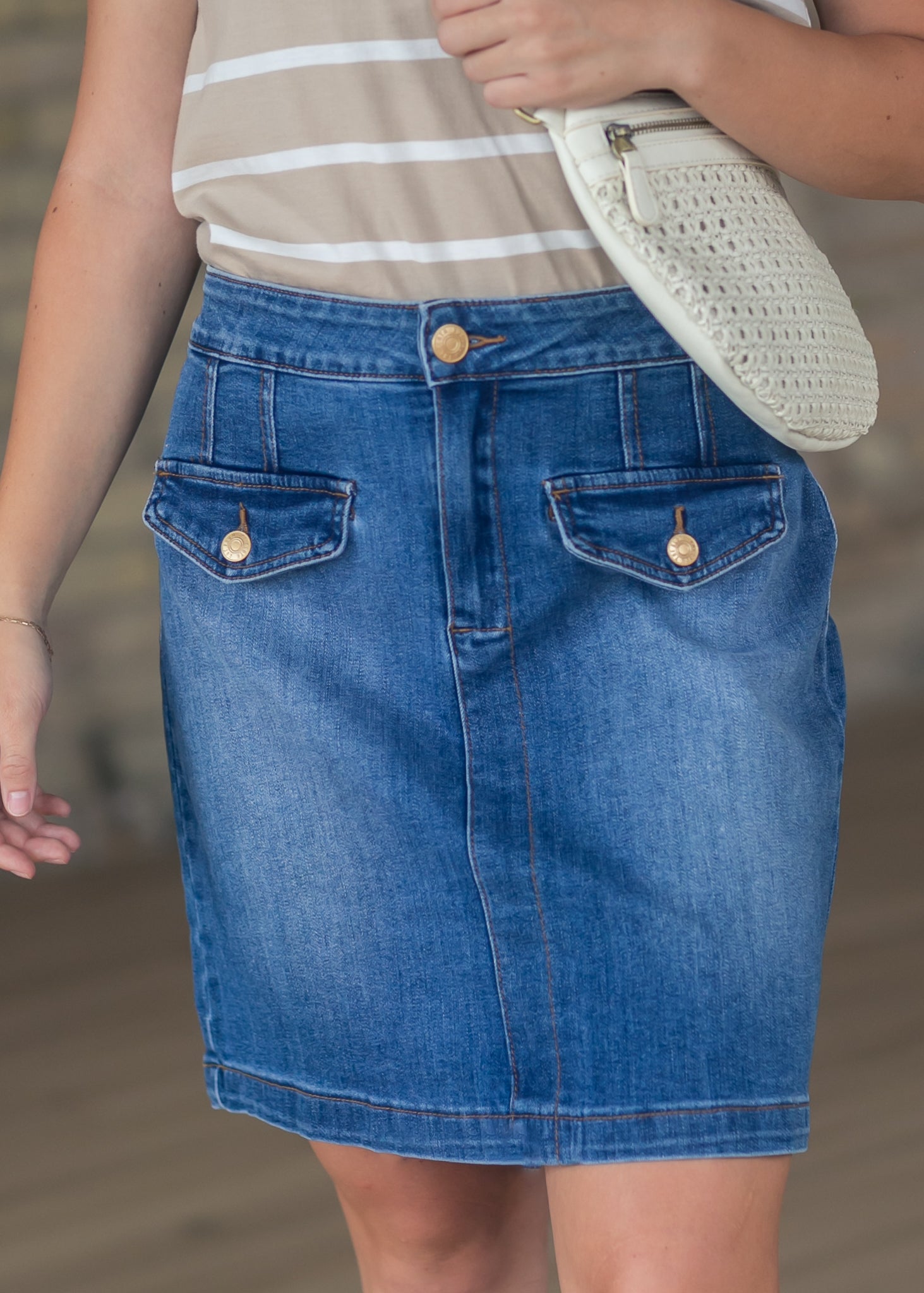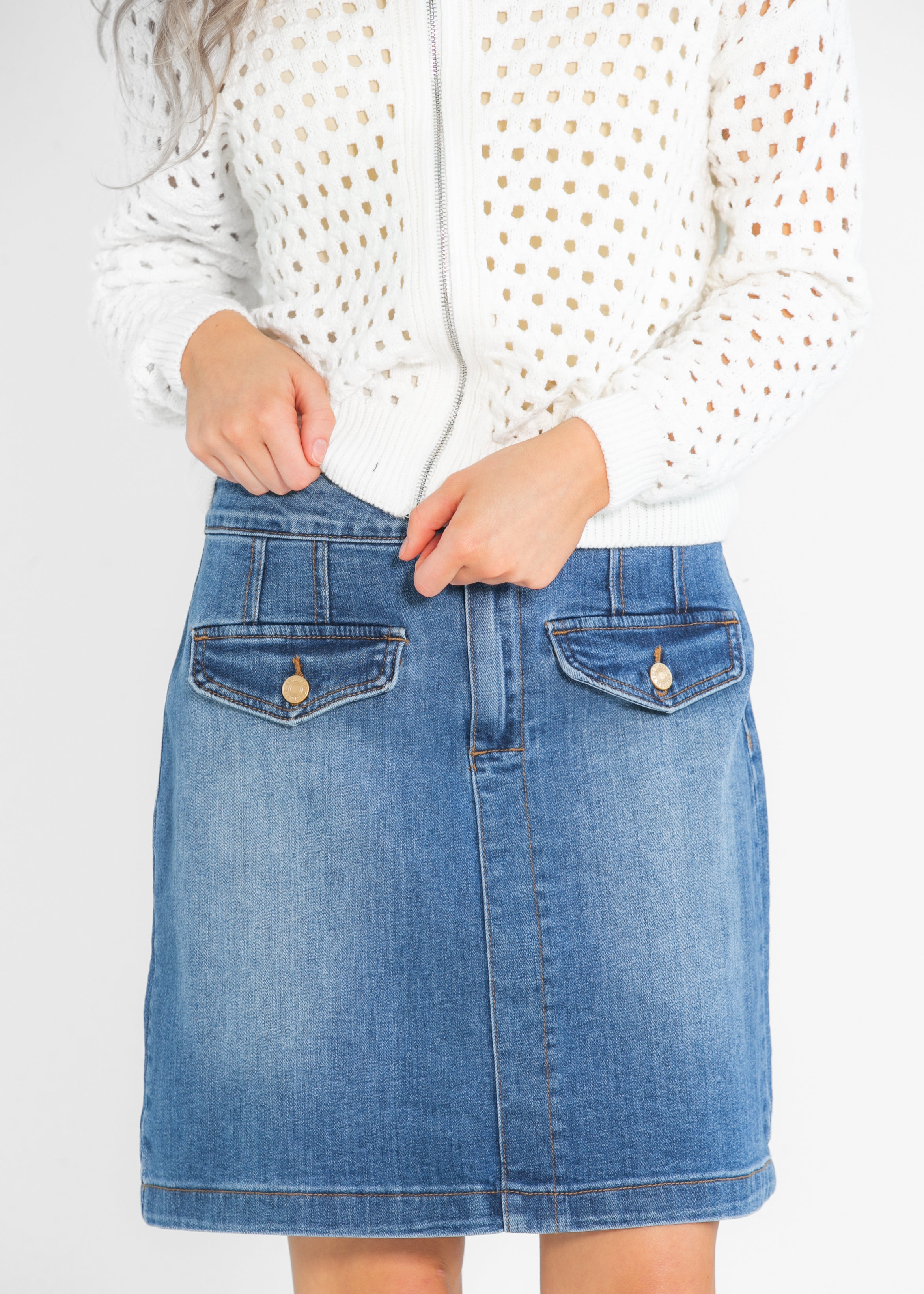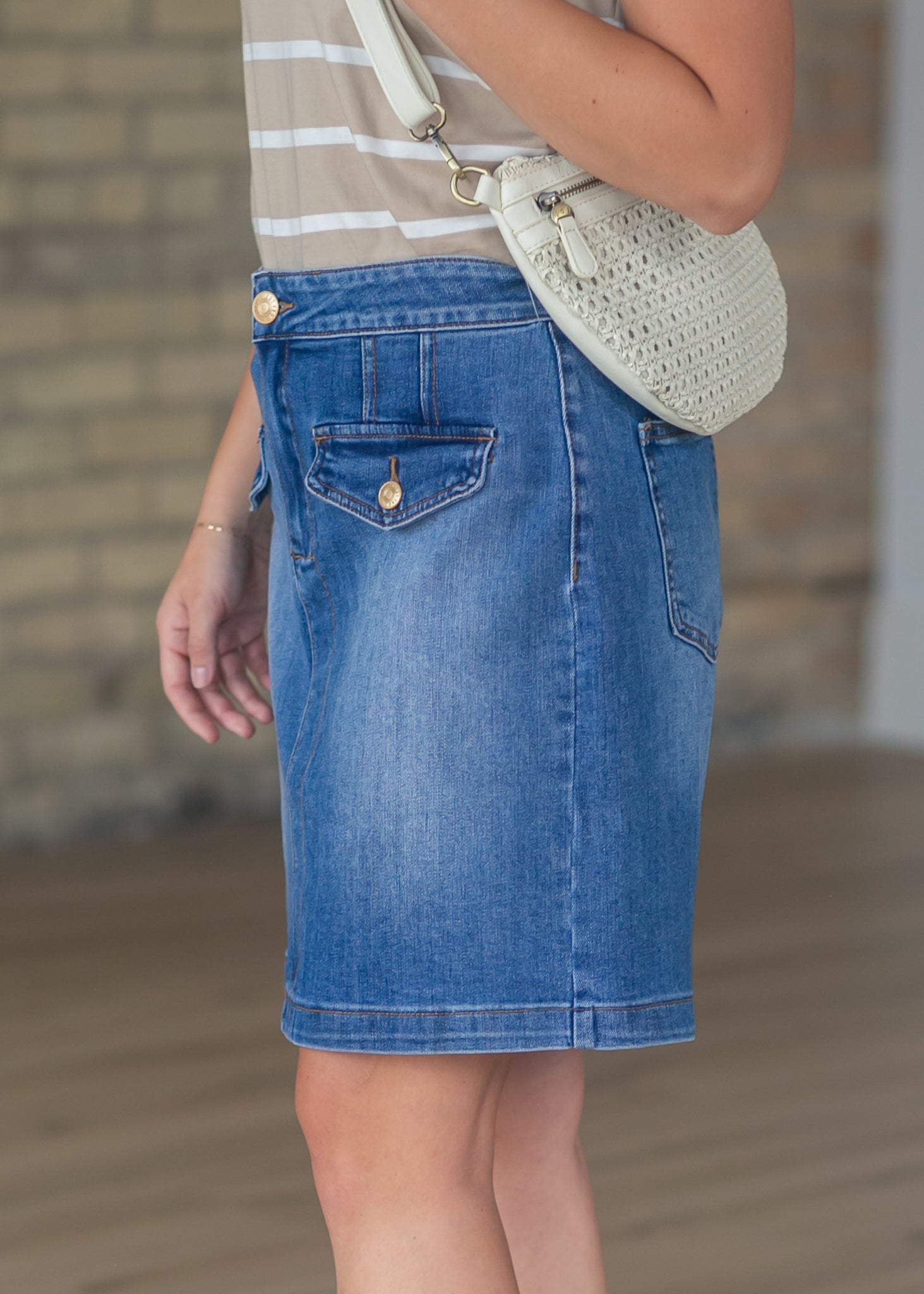 The KUT from the Kloth® Rosetta Denim Pencil Skirt is a versatile and modest essential designed for petite ladies who appreciate classic style with a tailored touch. Featuring faux welt front pockets with flap detailing, this sleek pencil skirt offers a refined yet functional design. Made from a high-quality denim blend with a slight stretch, it provides all-day comfort and effortless movement. Its timeless silhouette and structured fit make it a staple piece for any wardrobe, offering endless styling possibilities.