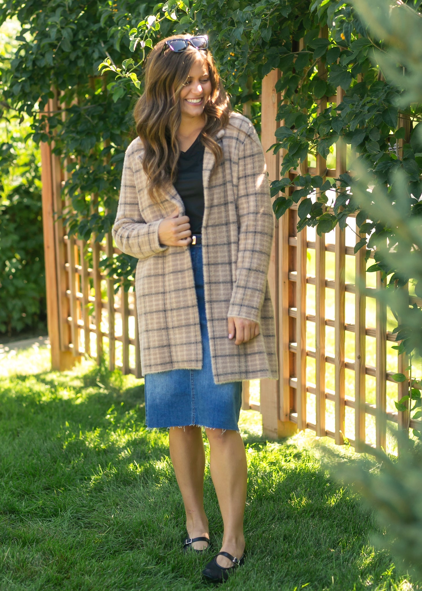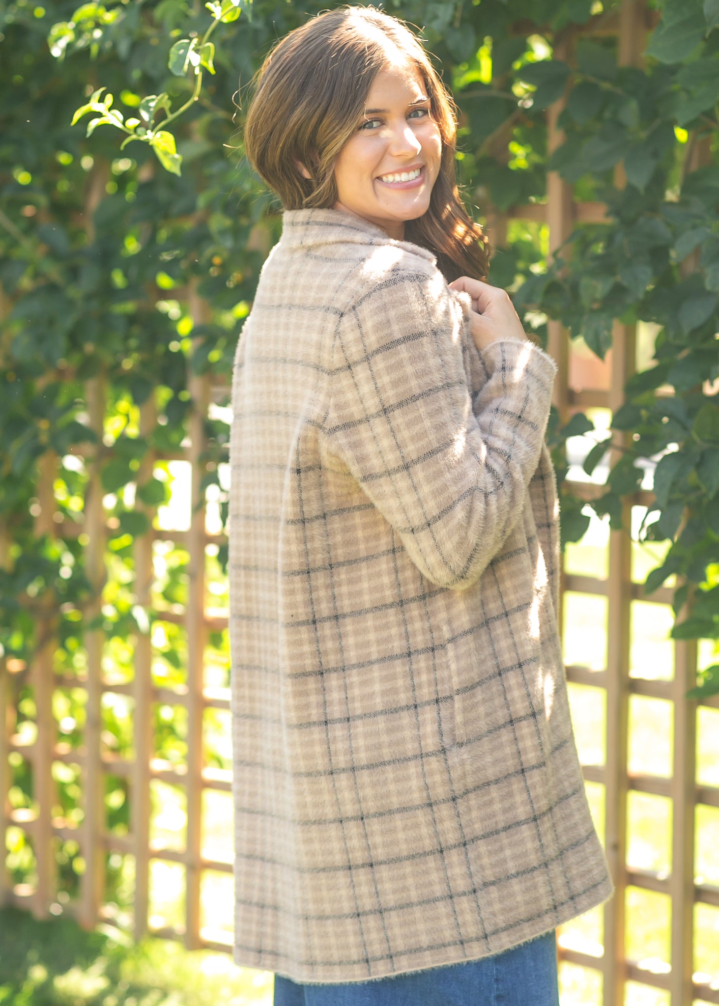The Liverpool Los Angeles® Plaid Open Front Sweater Coat is a timeless layering piece with a softly tailored feel. Its tan plaid pattern and longline silhouette offer warmth and sophistication for everyday wear. Effortlessly styled over denim for a relaxed outing or layered with a flowy skirt for Sunday gatherings, this coat brings polished comfort to cooler days while remaining endlessly versatile. This is fuzzy amazingness that is stretchy, classy and comfy all in one.
