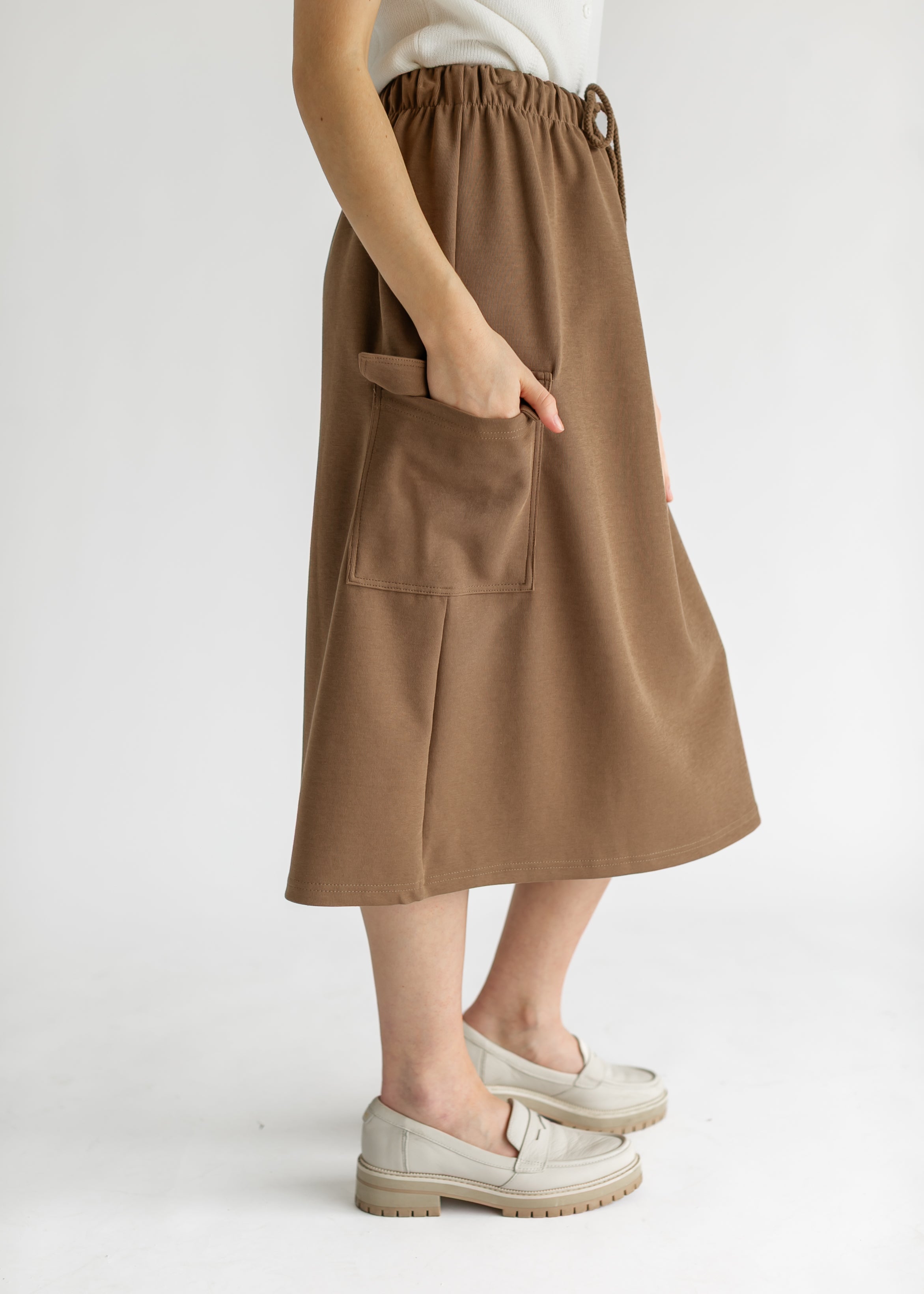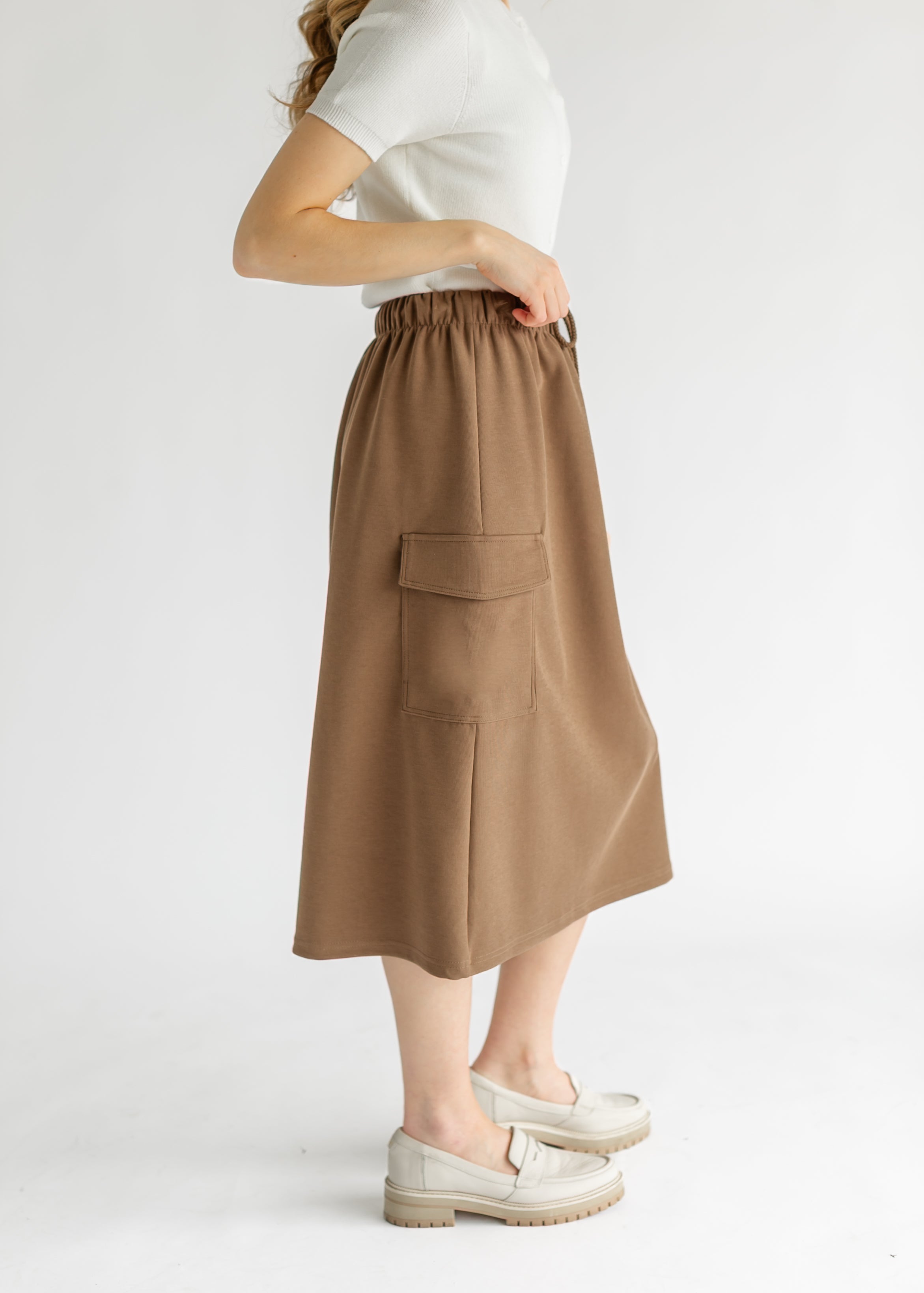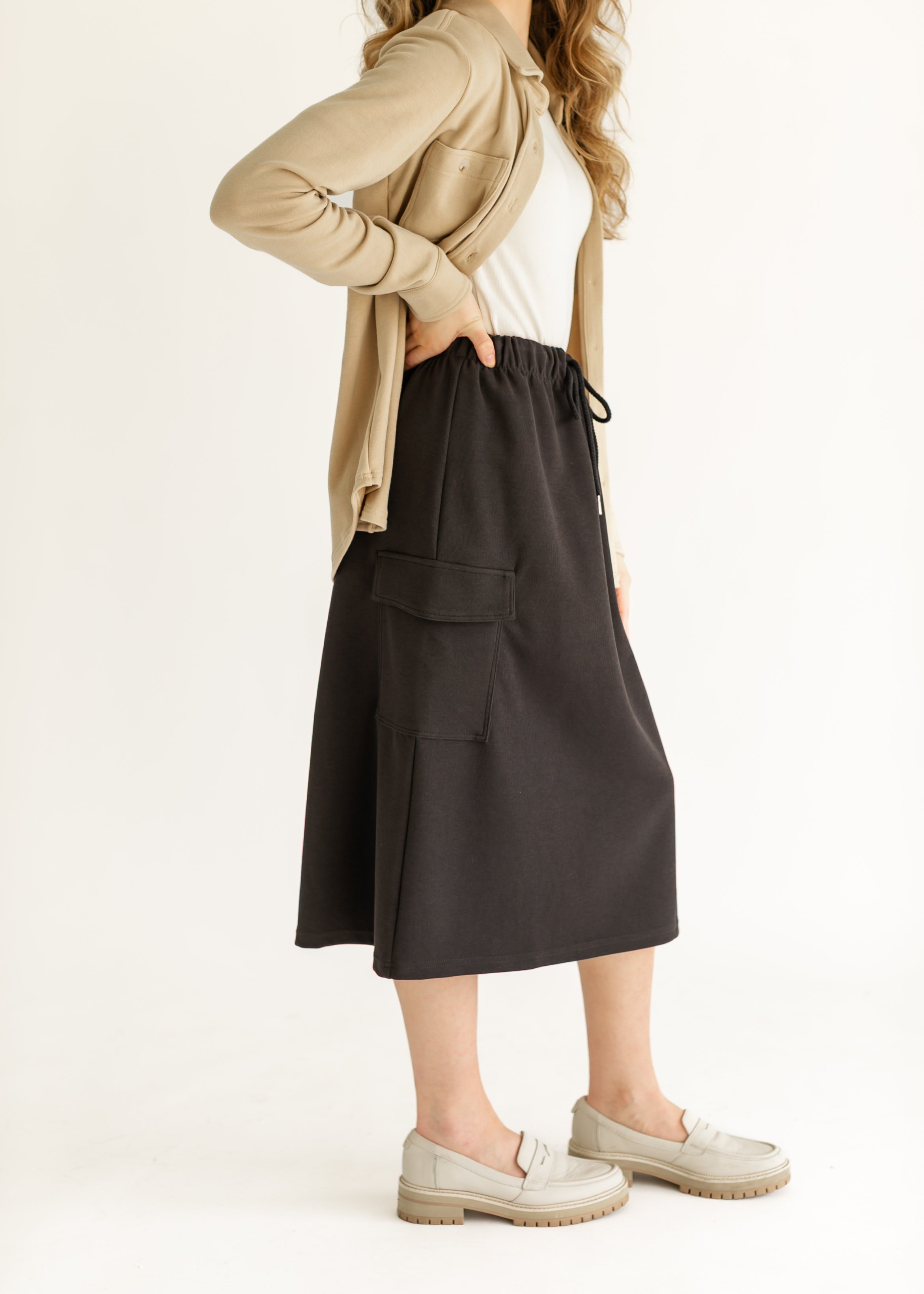The Mazie Midi A-line Cargo Skirt blends style and comfort for everyday wear. Featuring a flattering A-line silhouette, drawstring waist, and functional cargo pockets, it offers a custom fit and hands-free ease. Available in brown and charcoal, it pairs effortlessly with sweatshirts or casual tops for a modest, stylish look perfect for errands, outings, or relaxing at home.