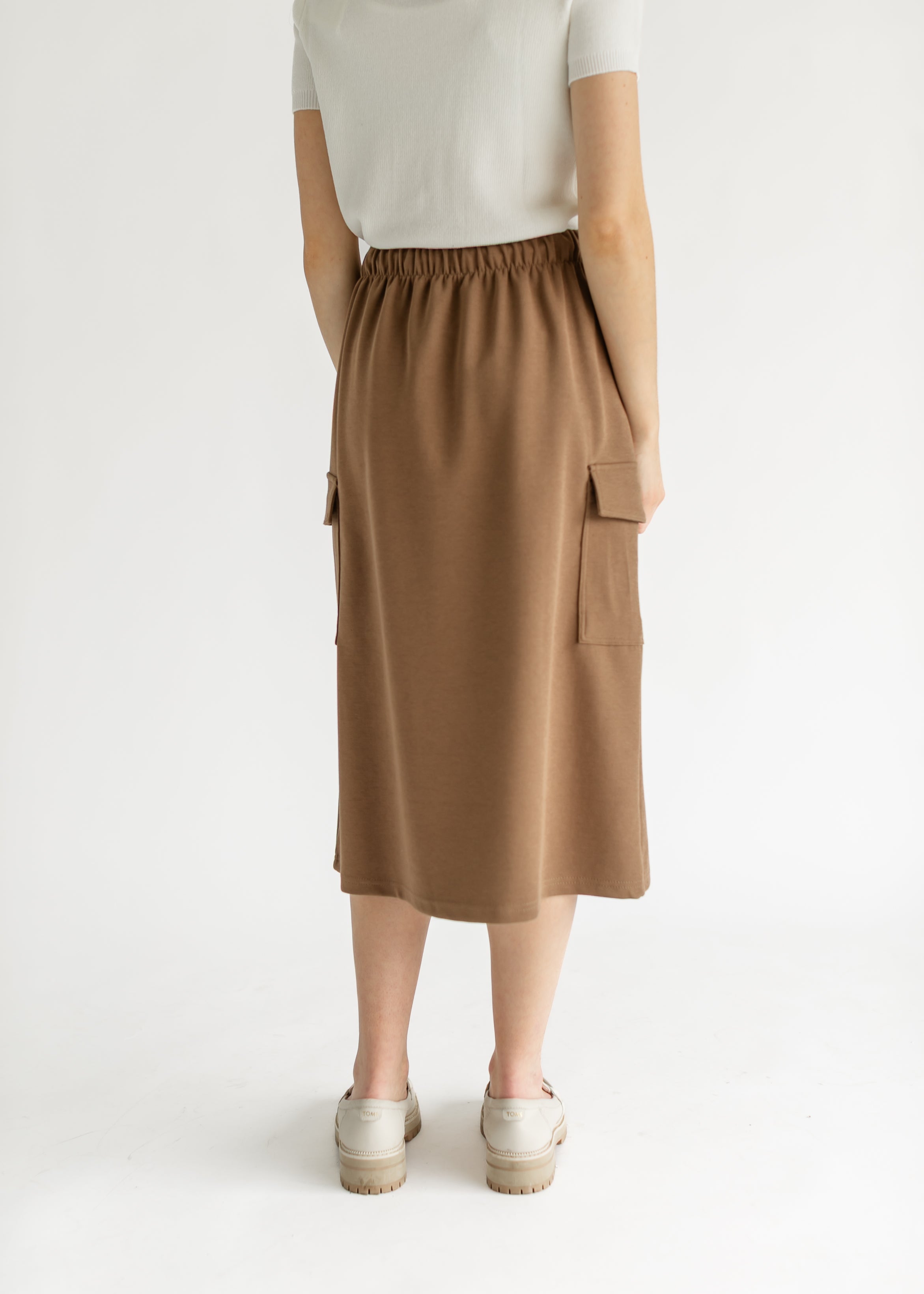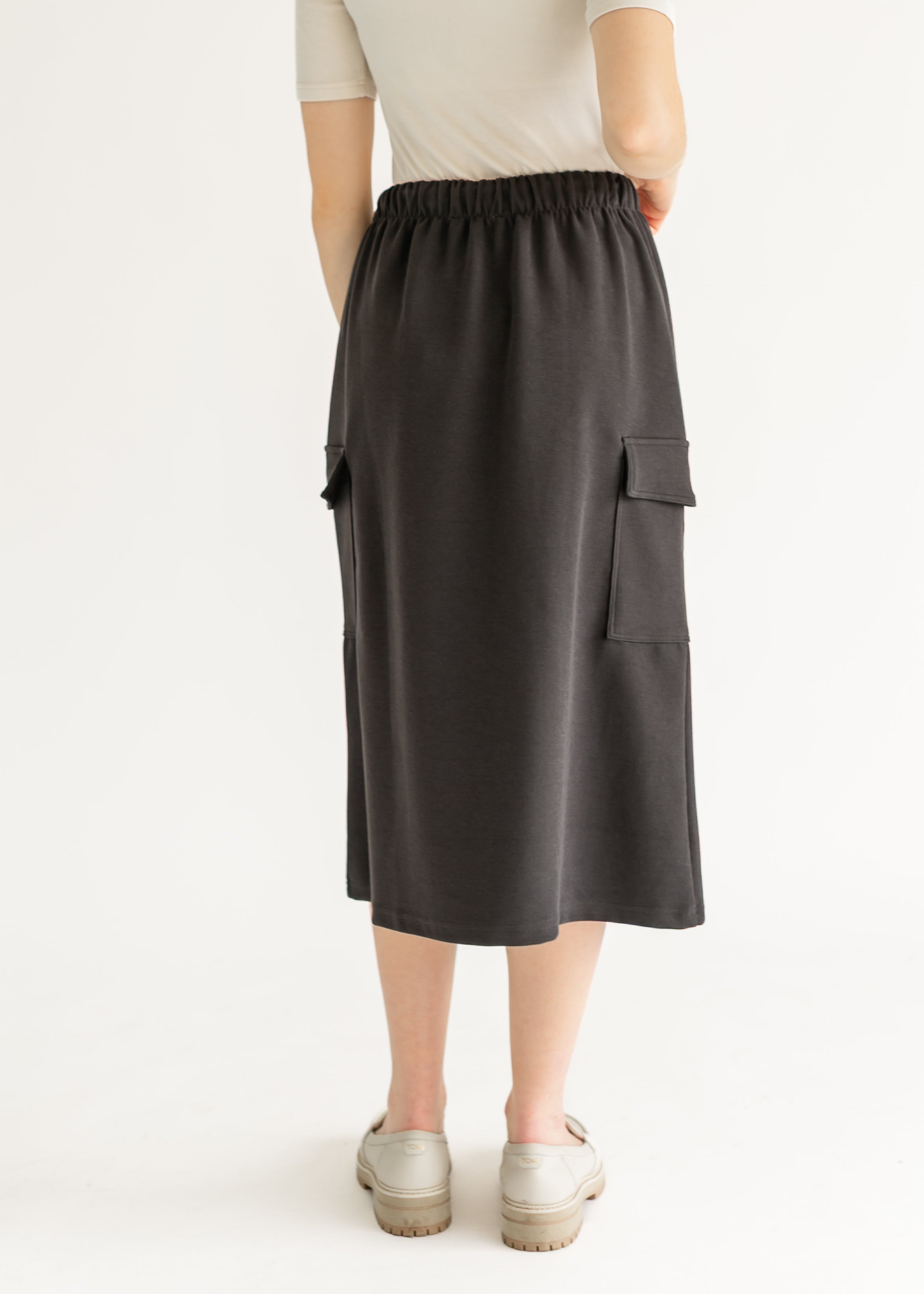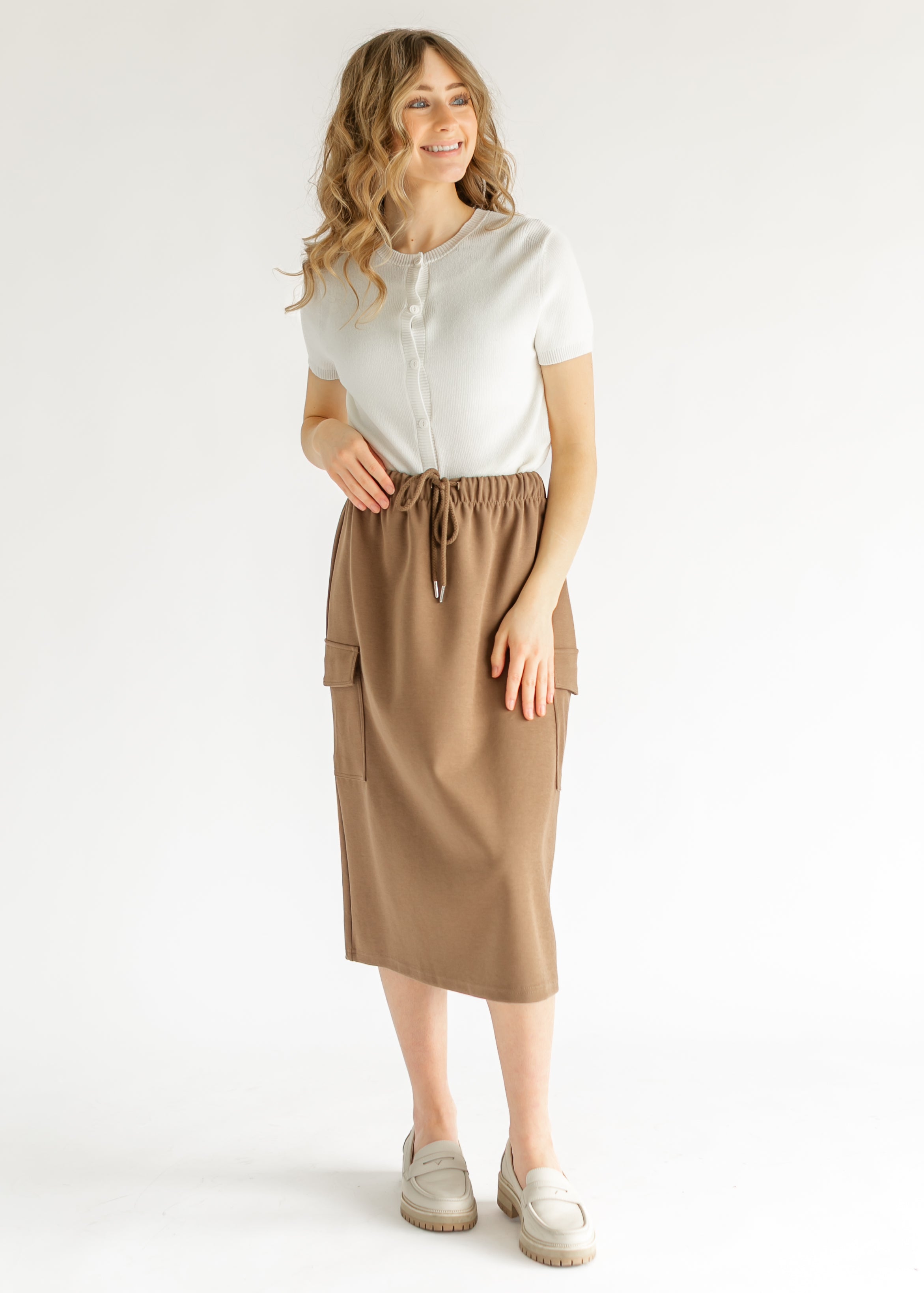 The Mazie Midi A-line Cargo Skirt blends style and comfort for everyday wear. Featuring a flattering A-line silhouette, drawstring waist, and functional cargo pockets, it offers a custom fit and hands-free ease. Available in brown and charcoal, it pairs effortlessly with sweatshirts or casual tops for a modest, stylish look perfect for errands, outings, or relaxing at home.