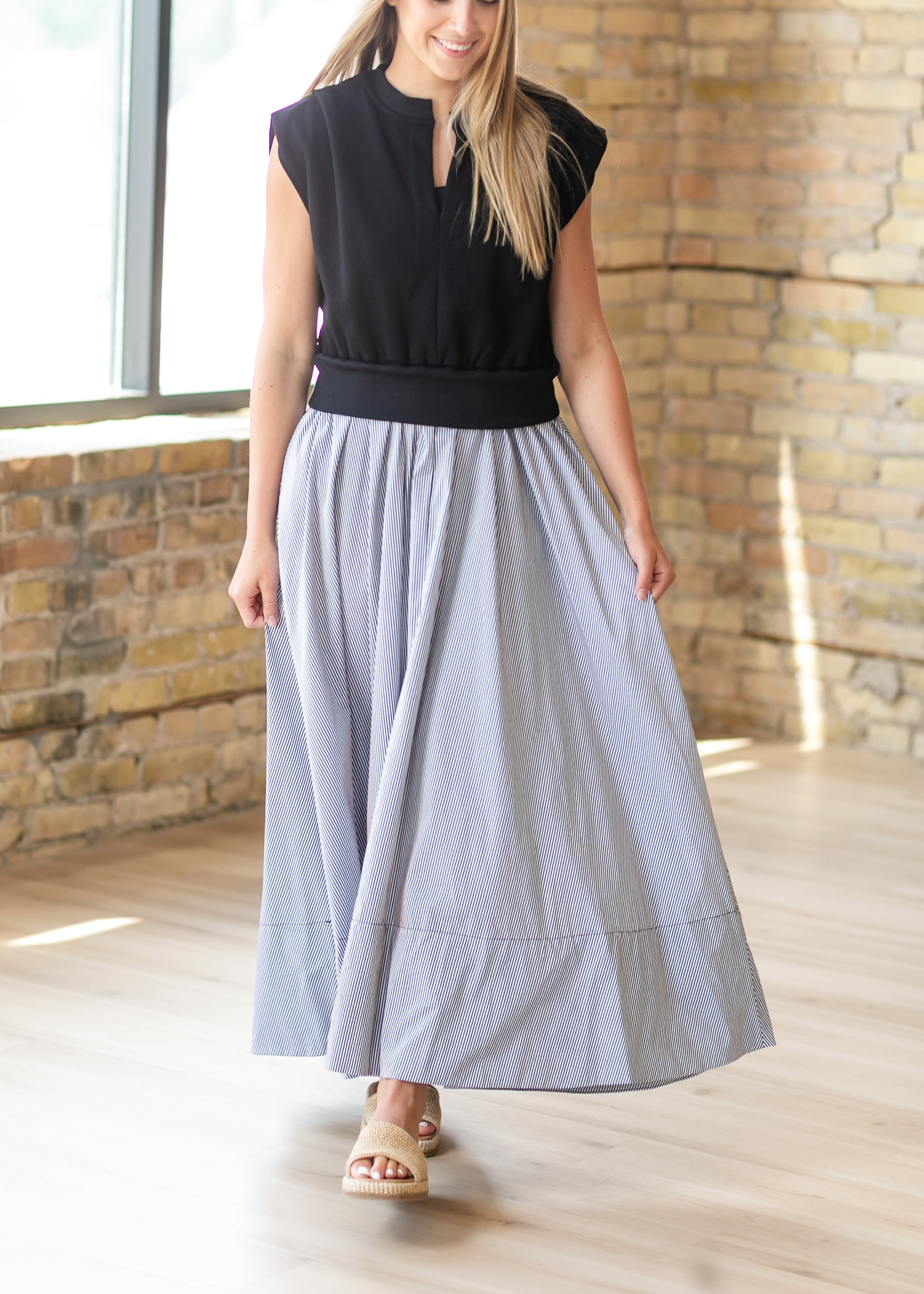 The Mixed Media Maxi Dress blends softness and structure for a modest, elevated everyday look. Featuring a knit top with a tailored waistband and a lightweight woven skirt, this Inherit original creates effortless contrast and flow. Hidden side pockets add practical ease, while the striped skirt brings subtle detail. A timeless silhouette designed for comfort, confidence, and all-day wear.