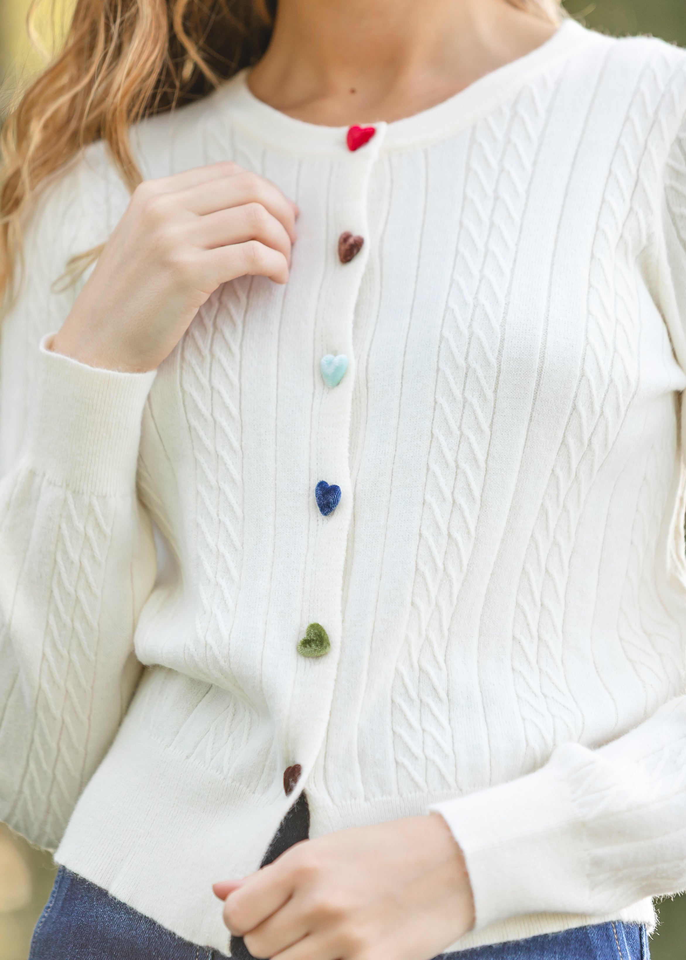 Soft and sweet, the Mochi Heart Button Cardigan adds a touch of whimsy to everyday wear. Its ivory knit is detailed with colorful heart-shaped buttons that bring a playful finish to a timeless silhouette. Style it buttoned with a denim skirt for a polished look, or layer over a flowy dress for a cozy, feminine touch!