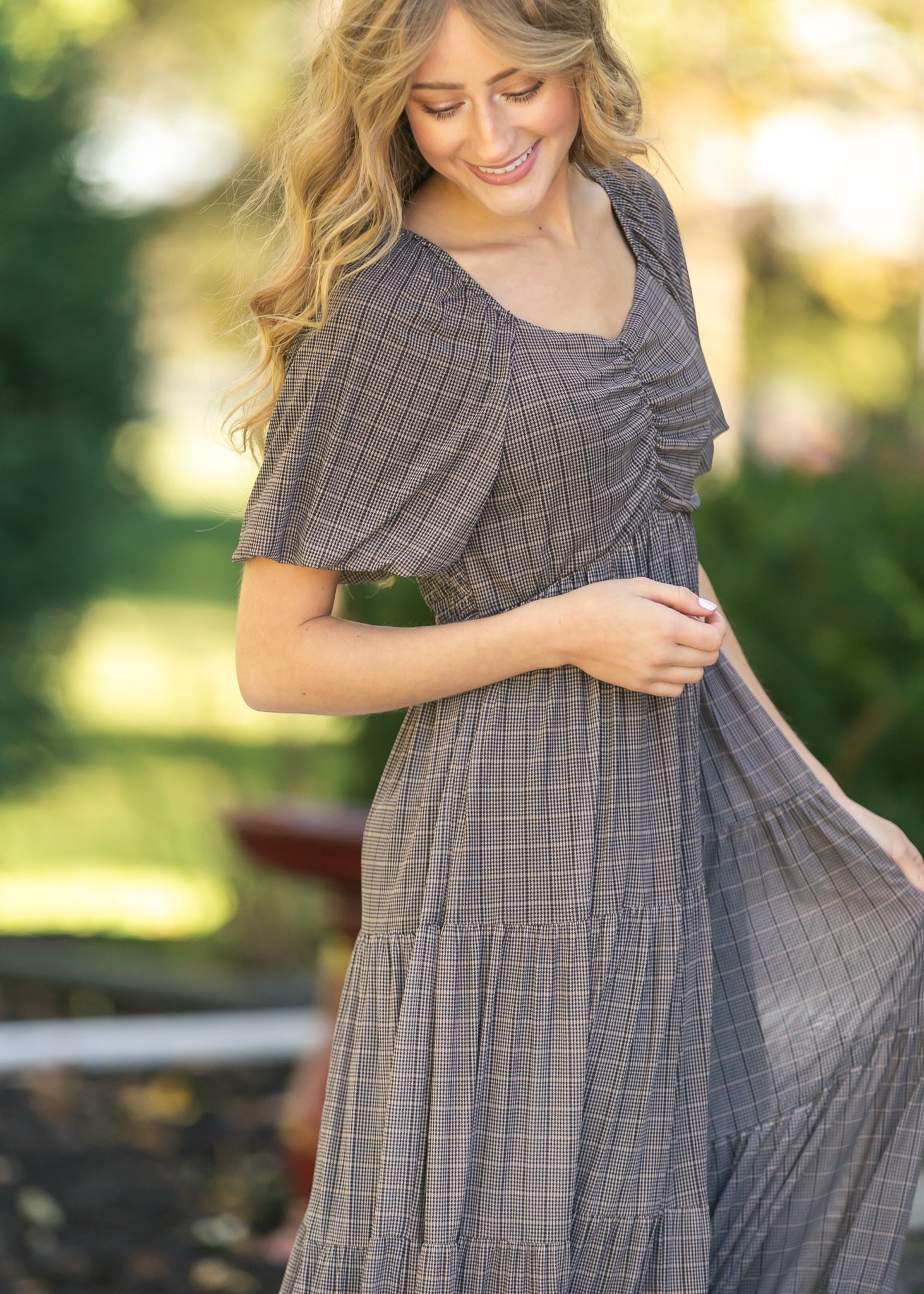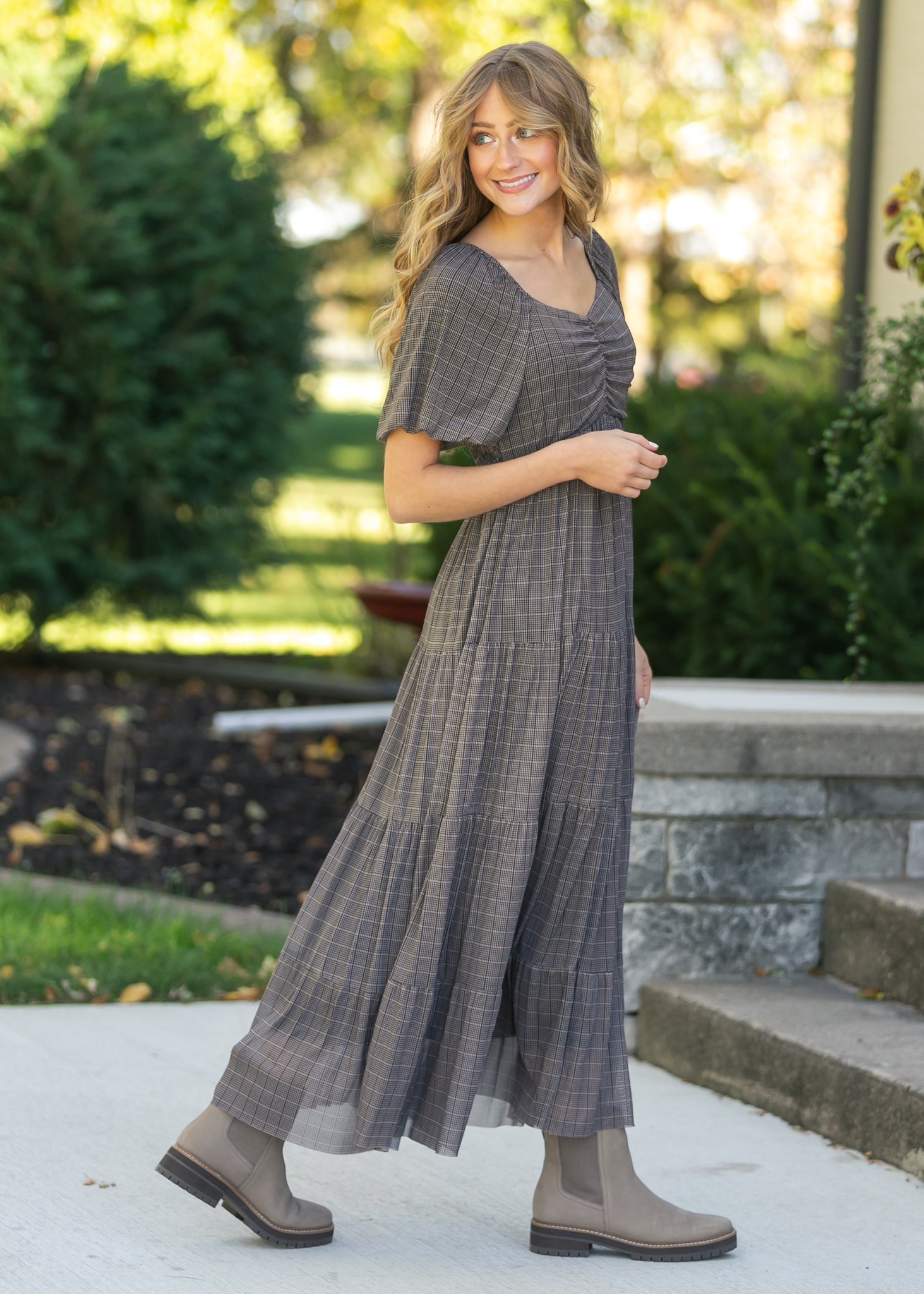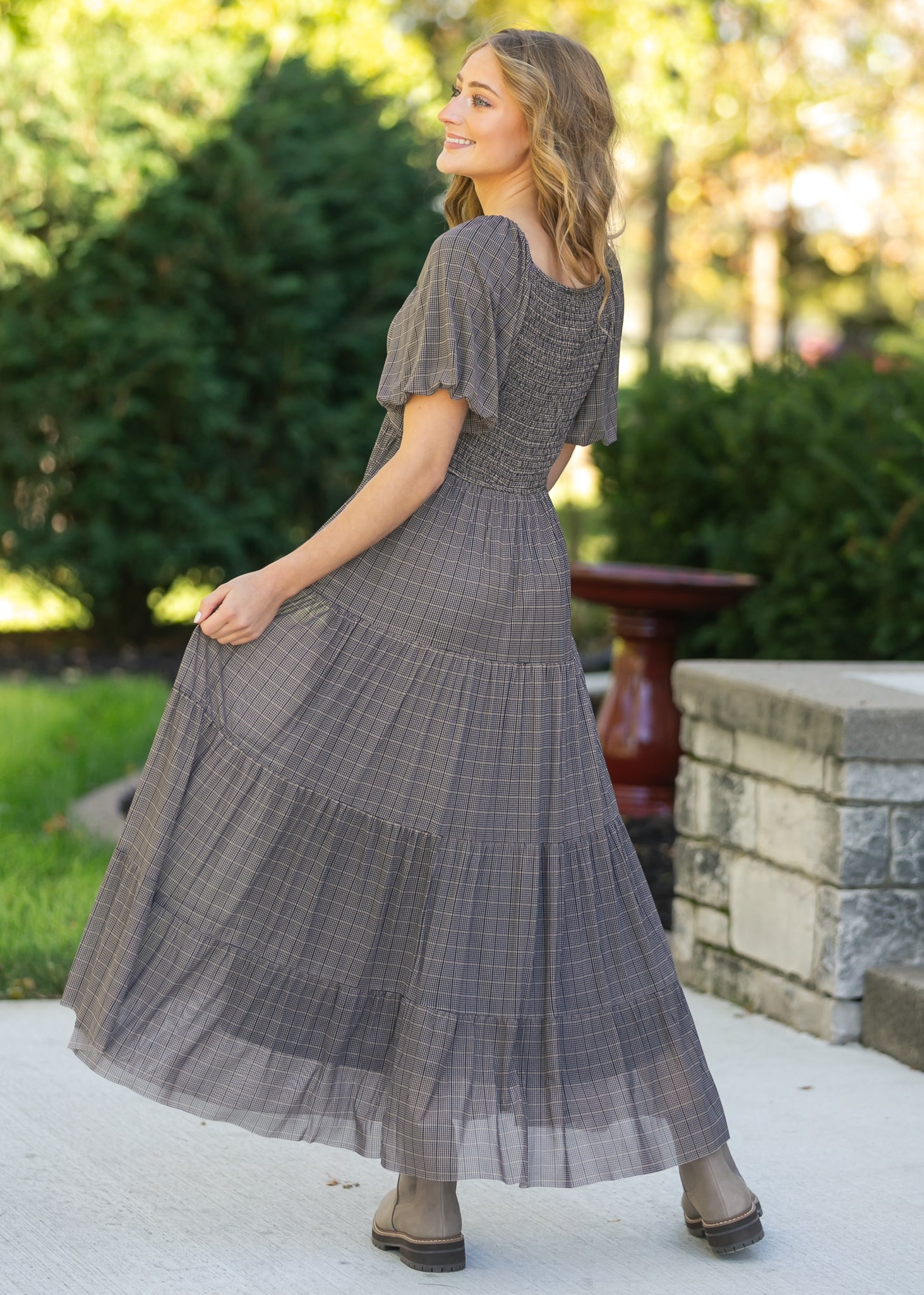 The Plaid Mesh Tiered Maxi Dress is a picture of grace in motion. Designed with delicate plaid mesh, gathered tiers, and a soft lining for modest coverage, it flows beautifully with each step. The ruched bodice and flutter sleeves add a feminine touch, making it perfect for church, gatherings, or a peaceful autumn walk paired with ankle boots.