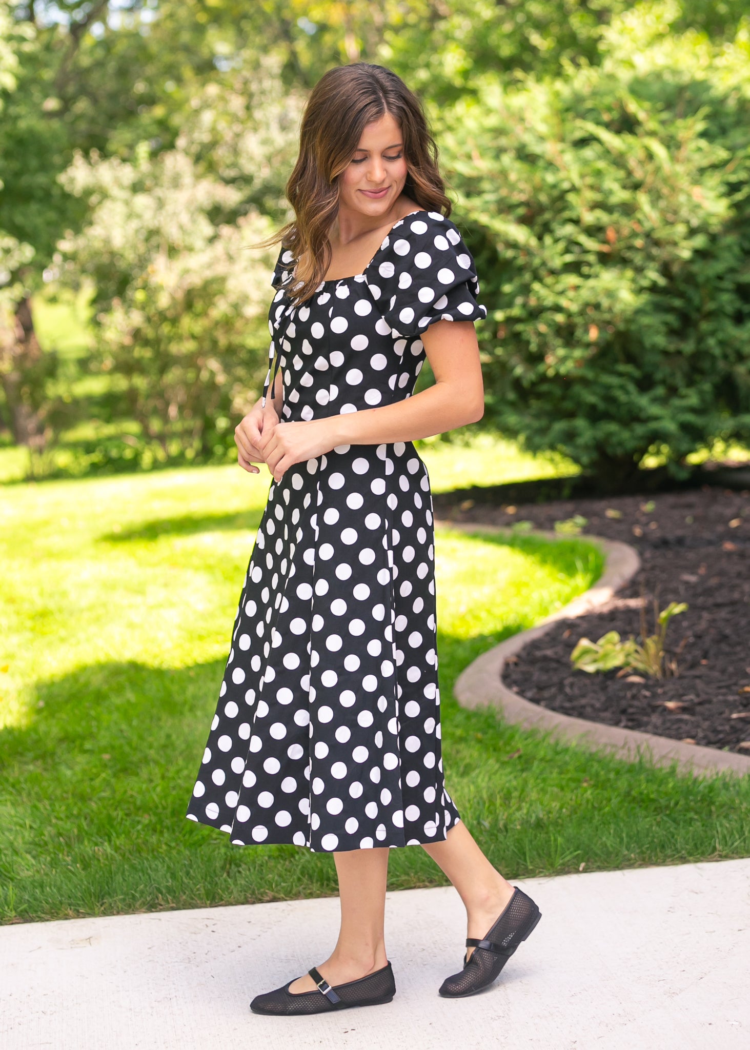 The Polka Dot Flare Midi Dress is a timeless favorite with its bold print and graceful silhouette. Designed with a smocked back for a comfortable fit, puff sleeves, and a modest square neckline, it balances playfulness with refinement. The flowing skirt moves beautifully, making it perfect for gatherings, Sunday wear, or everyday moments where you want to feel both feminine and effortless.