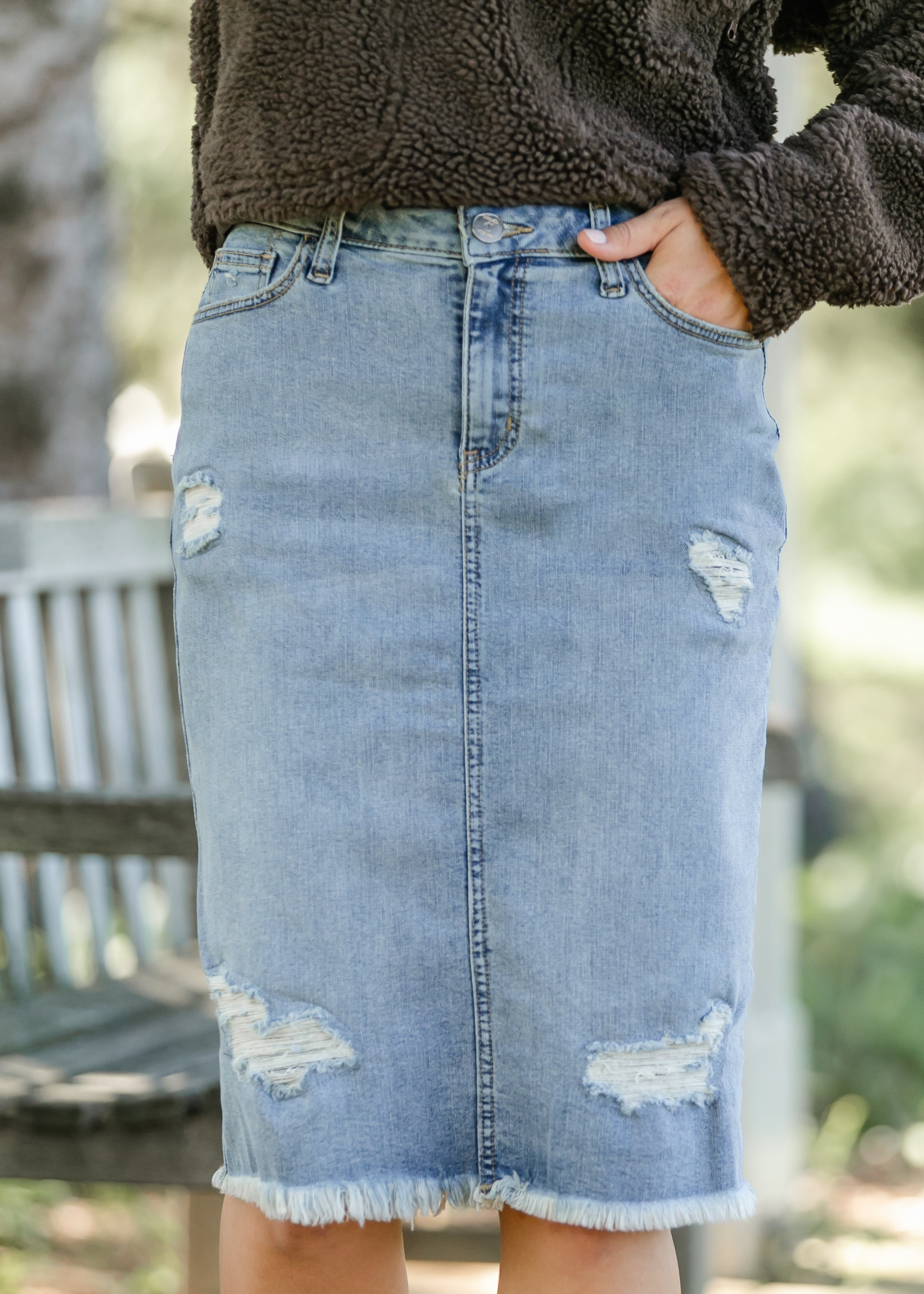 The Presley Distressed Denim Midi Skirt is crafted in a beautiful medium wash and finished with light distressing for a modern, modest look. Designed with a straight fit and functional front and back pockets, it’s as practical as it is stylish. This purposeful piece pairs effortlessly with your favorite tops and sneakers.