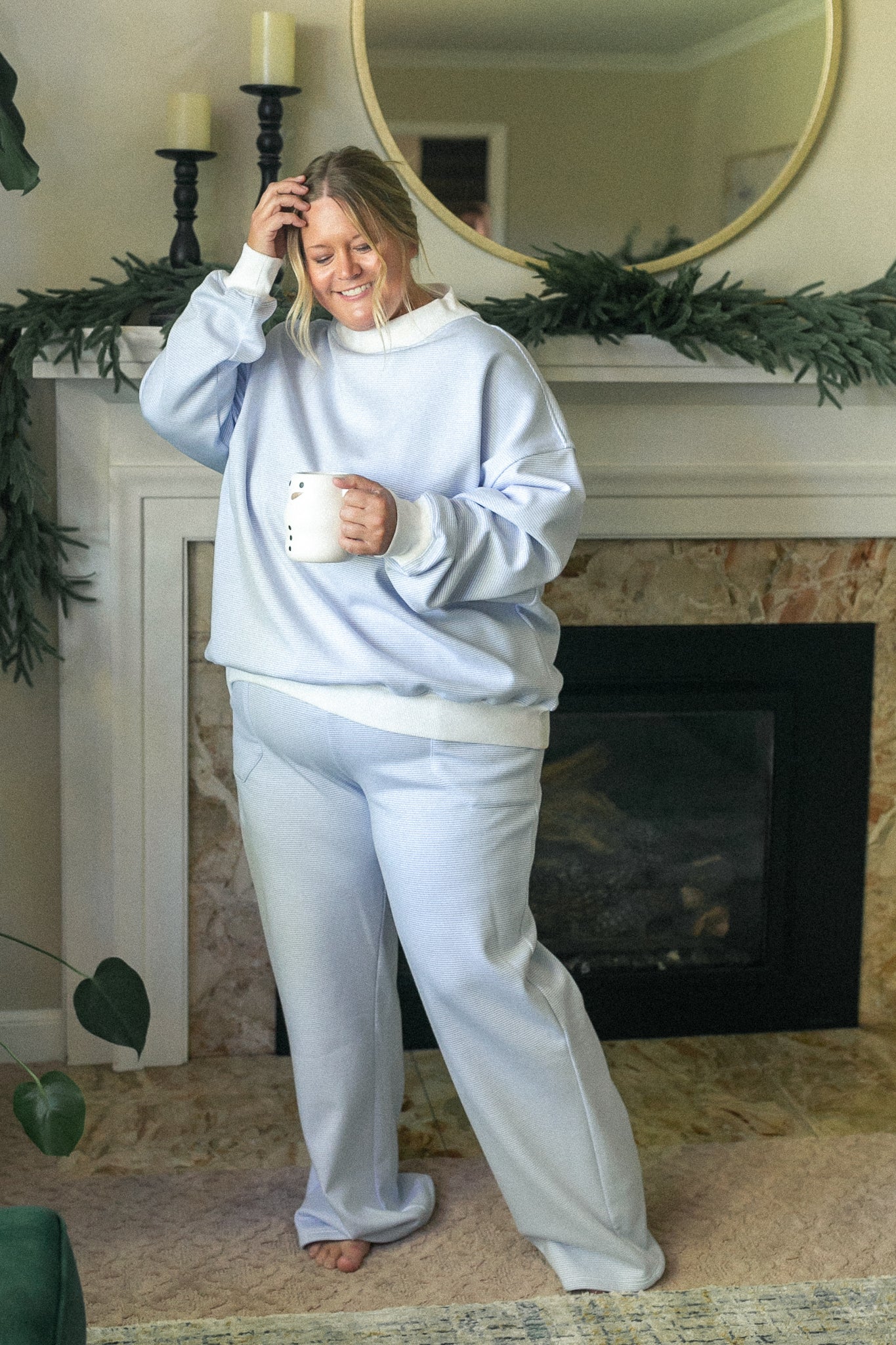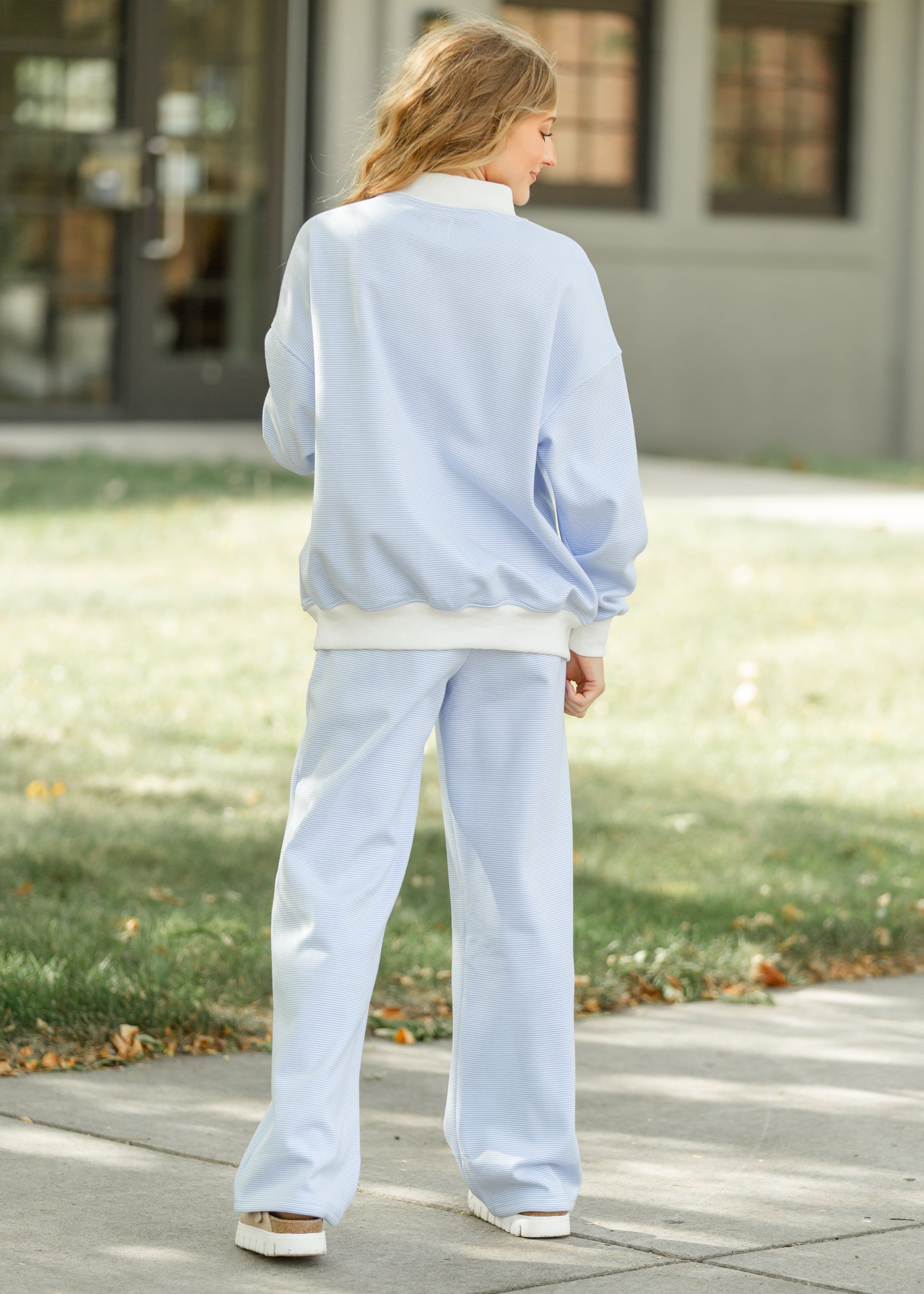 The Relaxed Stripe Sweatpants bring cozy elegance to your everyday moments. Made with soft, lightly textured fabric in gentle sky blue stripes, these modest pants offer a relaxed fit with wide legs and a comfortable elastic waistband. Effortlessly pair them with the matching Stripe Mock Neck Sweatshirt for a laid-back, feminine look that carries you gracefully from morning devotion to evening rest.