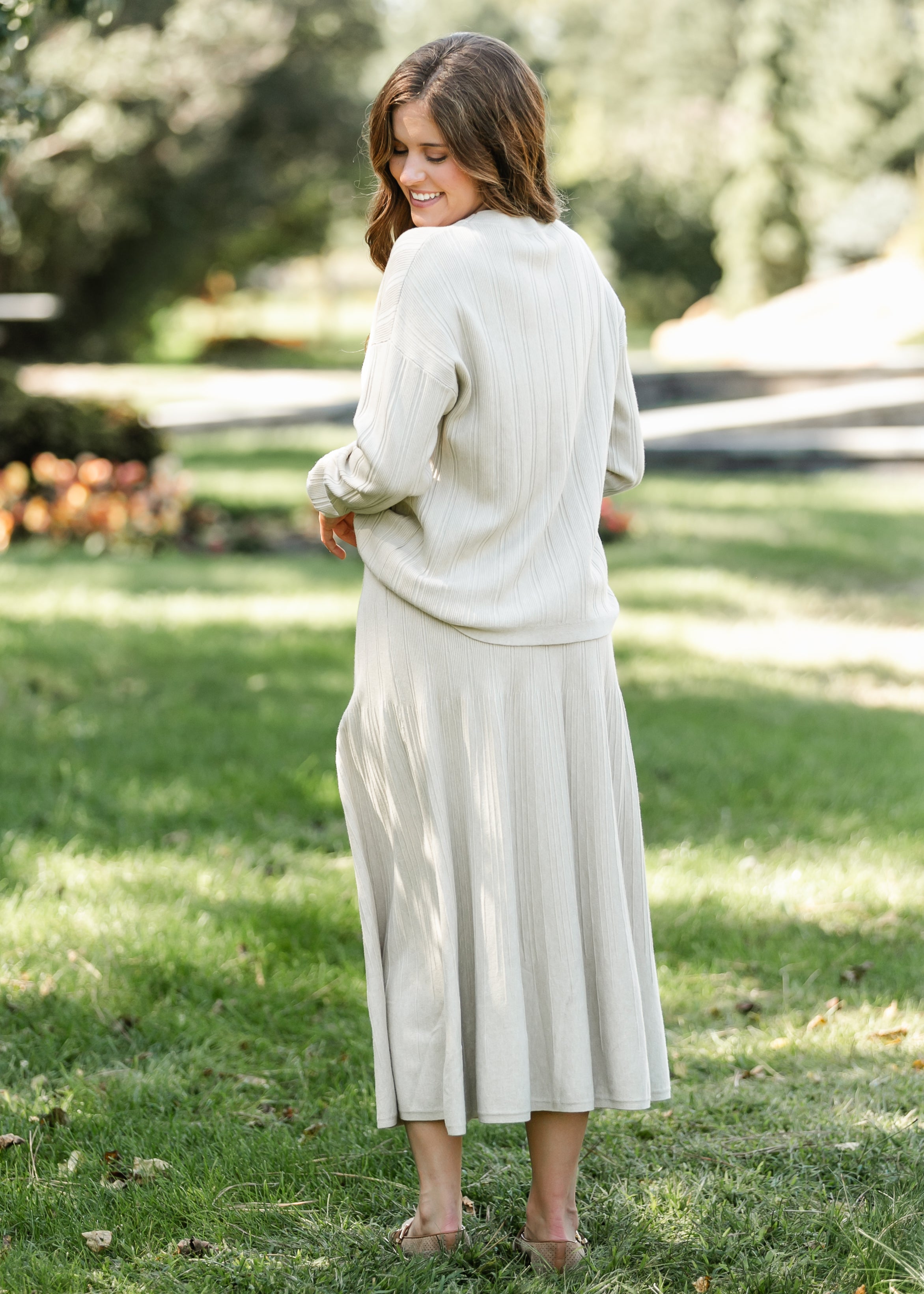The Ribbed Sweater A-line Skirt is made with a soft knit featuring vertical ribbing that flatters and elongates the silhouette. Its wide waistband offers a comfortable fit while the A-line cut flows with graceful ease. Falling at a modest midi length, this versatile skirt pairs beautifully with its or a tucked-in blouse for a refined, timeless look.