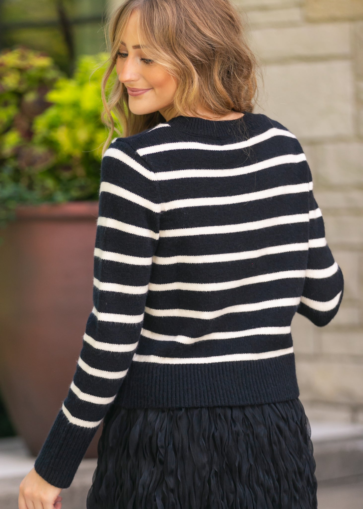 The Sheri Striped Sweater is a timeless knit that blends comfort with classic design. Featuring a black base with cream stripes, it offers a versatile look that layers beautifully with skirts or denim. The ribbed hem and cuffs provide a cozy fit, while its soft knit makes it a perfect choice for crisp mornings and layering through the cooler seasons.