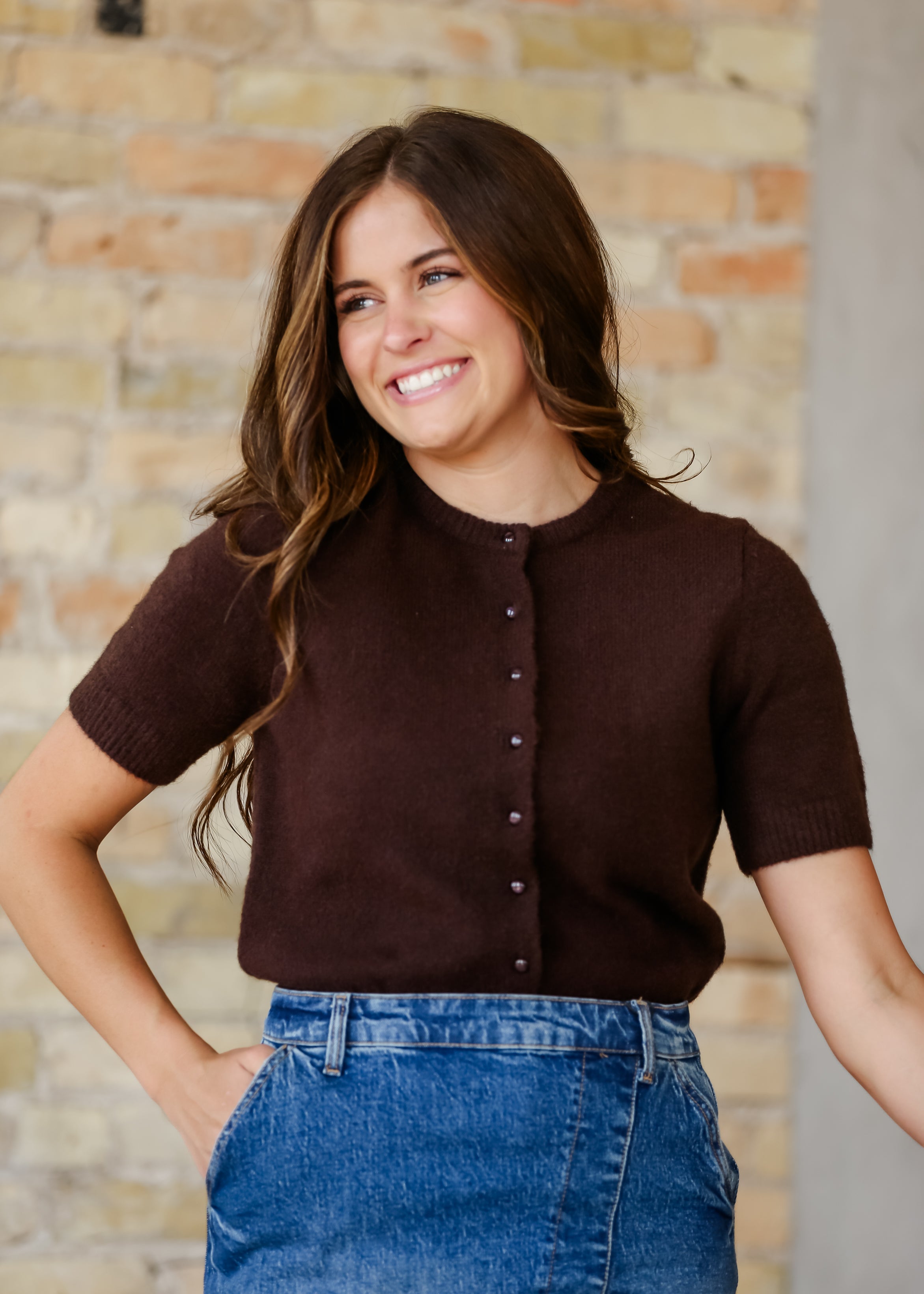 Soft, cozy, and timeless, this Short Sleeve Button Cardigan is a layering essential you’ll reach for season after season. Made from a lightweight knit with a flattering silhouette, this button-front cardigan features a modest crew neckline and ribbed sleeves for a polished finish. It’s the perfect blend of elevated comfort and versatile styling for everyday wear.