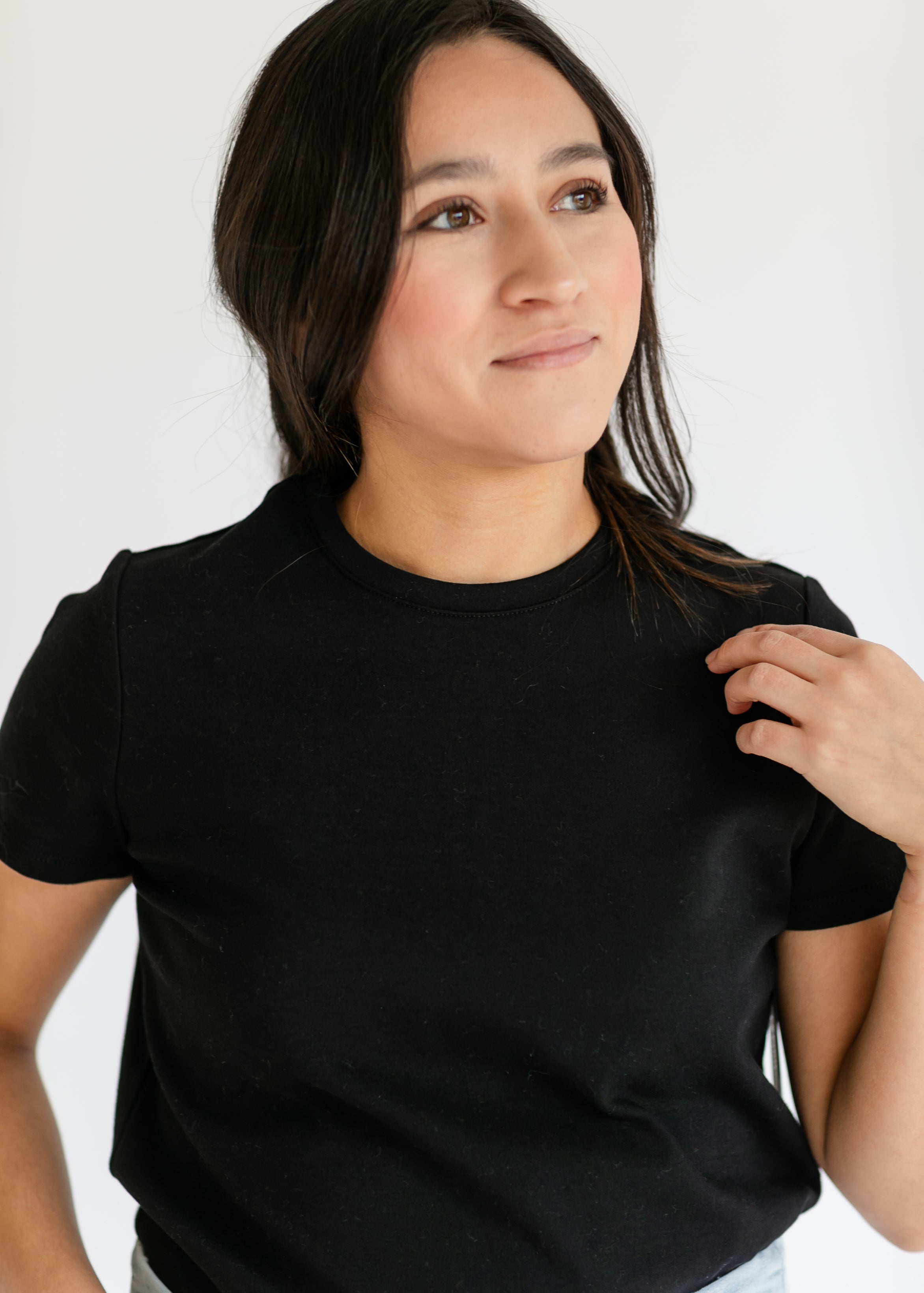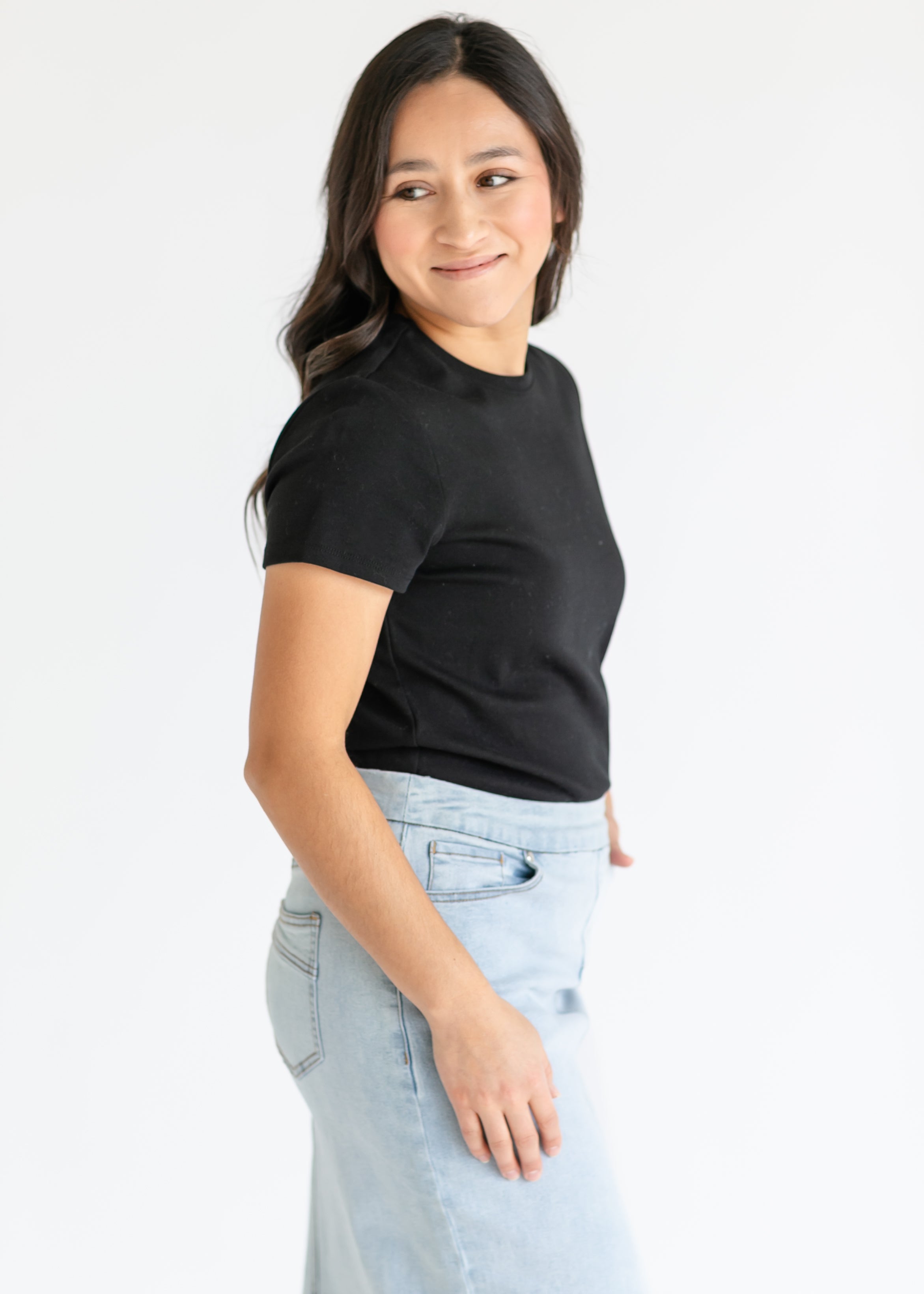 The Short Sleeve Crewneck Knit Tee by Liverpool Los Angeles is the ultimate everyday essential, designed with both comfort and versatility in mind. Crafted from a soft cotton blend, this tee offers a breathable, lightweight stretchy feel while ensuring a no-see-through finish for effortless confidence. The classic crew neckline and relaxed fit make it perfect for layering under jackets, blazers, or cardigans, yet stylish enough to wear on its own. Whether dressed up with a flowy skirt or kept casual with denim, this timeless piece is the go-to foundation for any wardrobe!