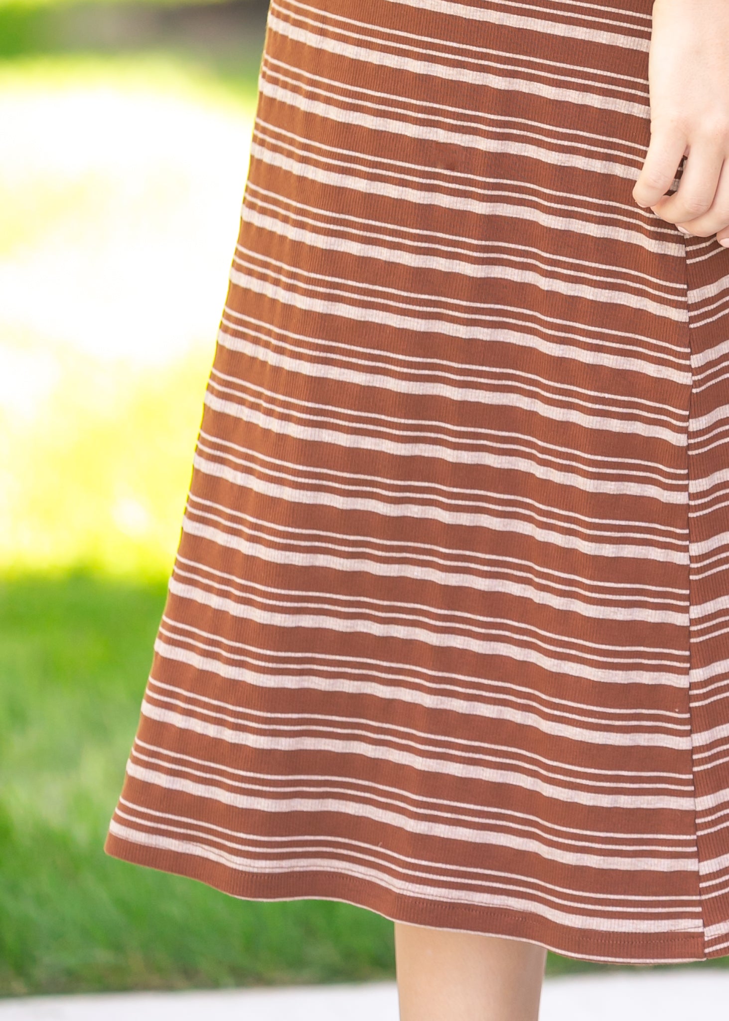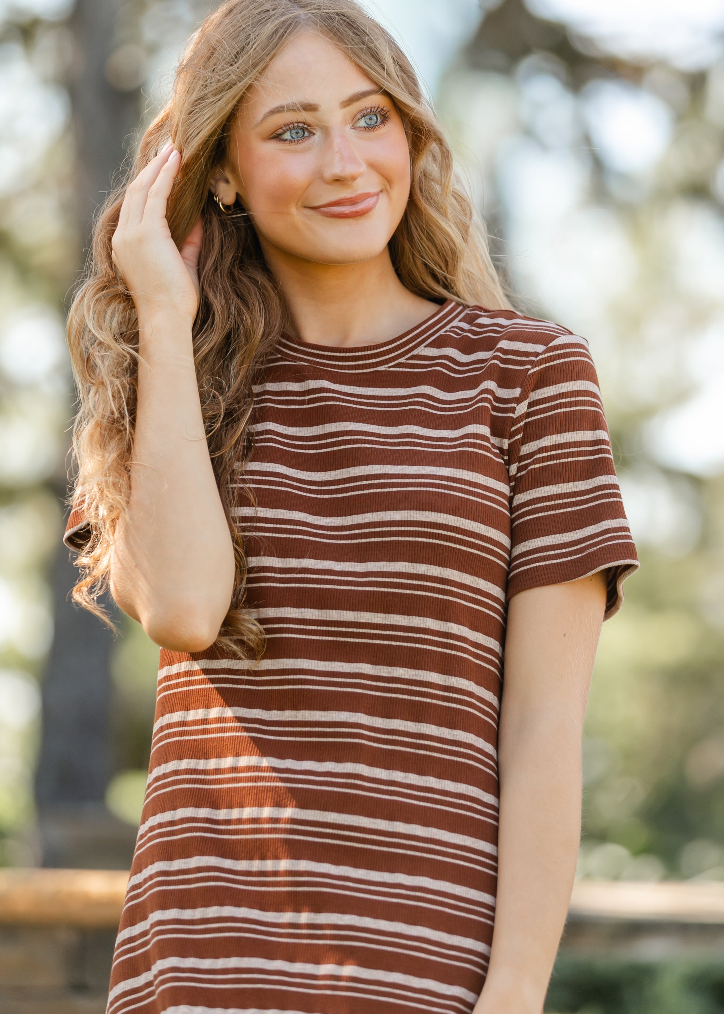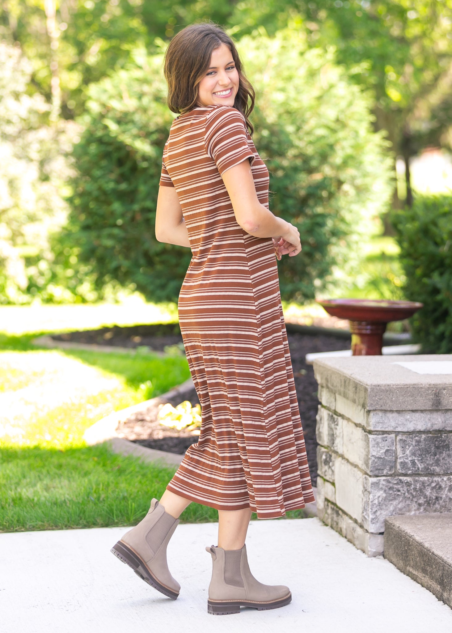 The Short Sleeve Striped Knit Dress features a soft ribbed knit with earthy brown and cream stripes that give effortless texture and movement. Designed with a crew neckline, short sleeves, and a flowy midi length, it offers breathable comfort with a flattering drape. Pair it with sandals in warm weather or layer under a cardigan for year-round wear.