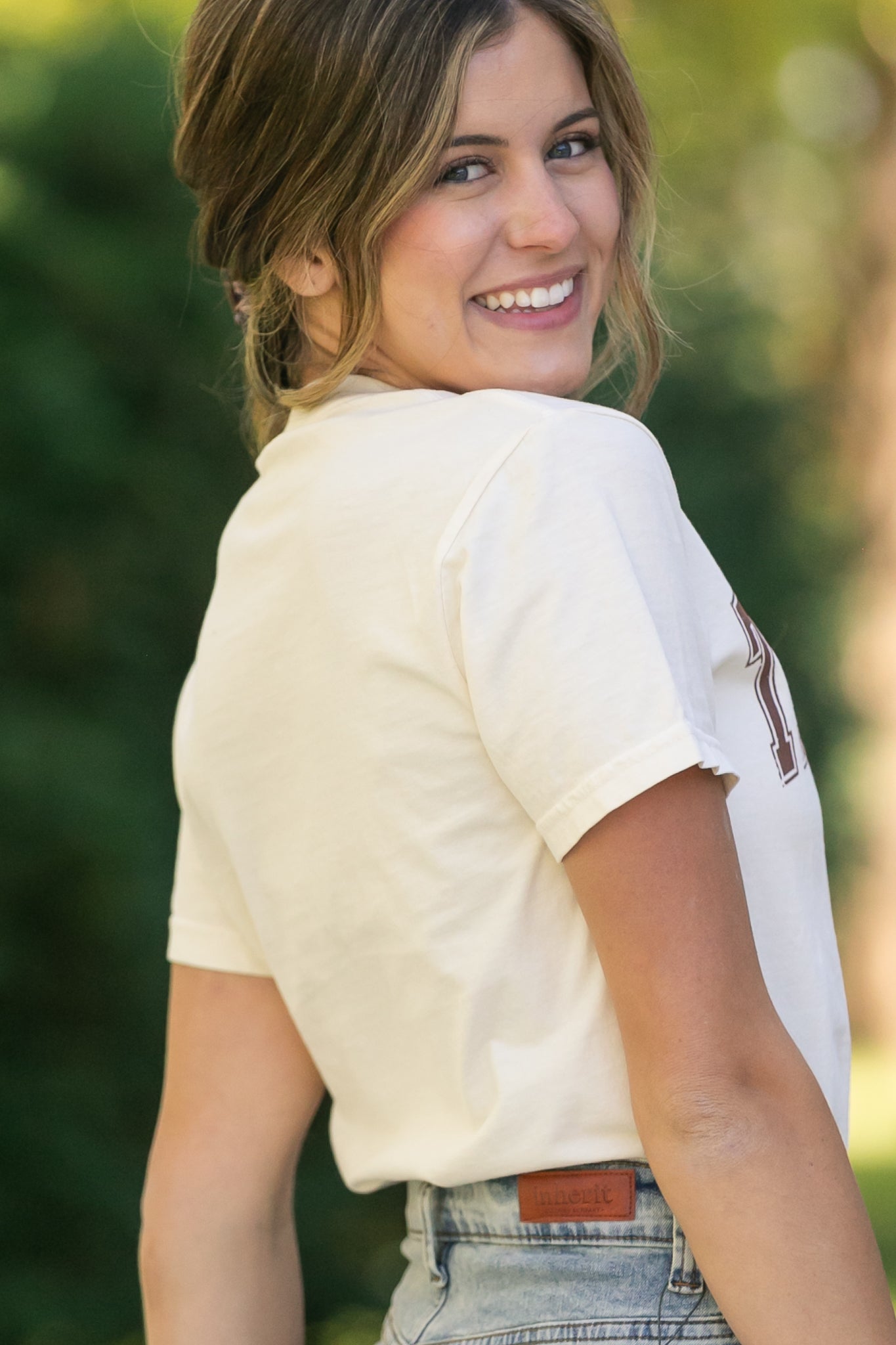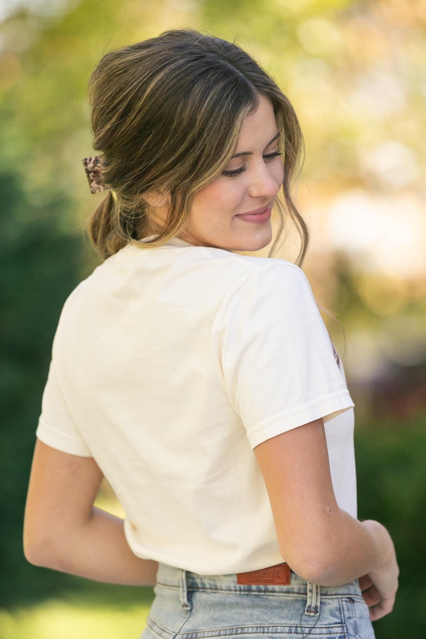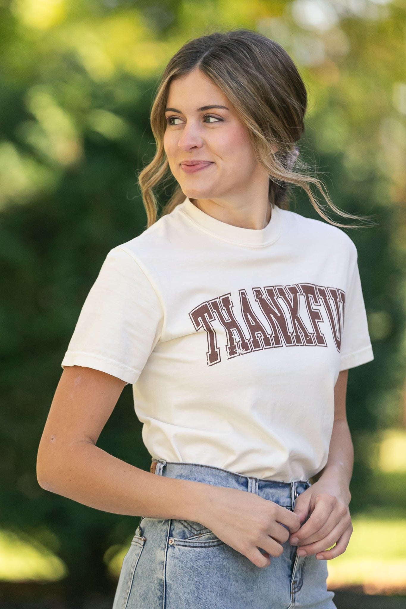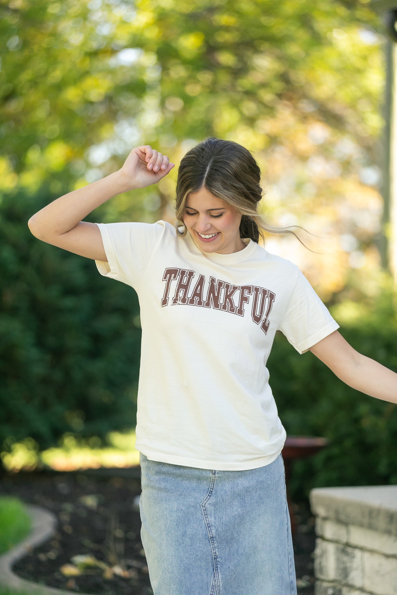 The Short Sleeve Thankful Graphic Tee is a gentle reminder to embrace gratitude in every season. Made from soft, breathable cotton, this cream tee features a vintage-inspired “THANKFUL” design in warm brown tones. Its modest fit and classic crew neckline make it perfect for layering under cardigans or pairing with a flowy denim skirt for a simple, faith-filled look.