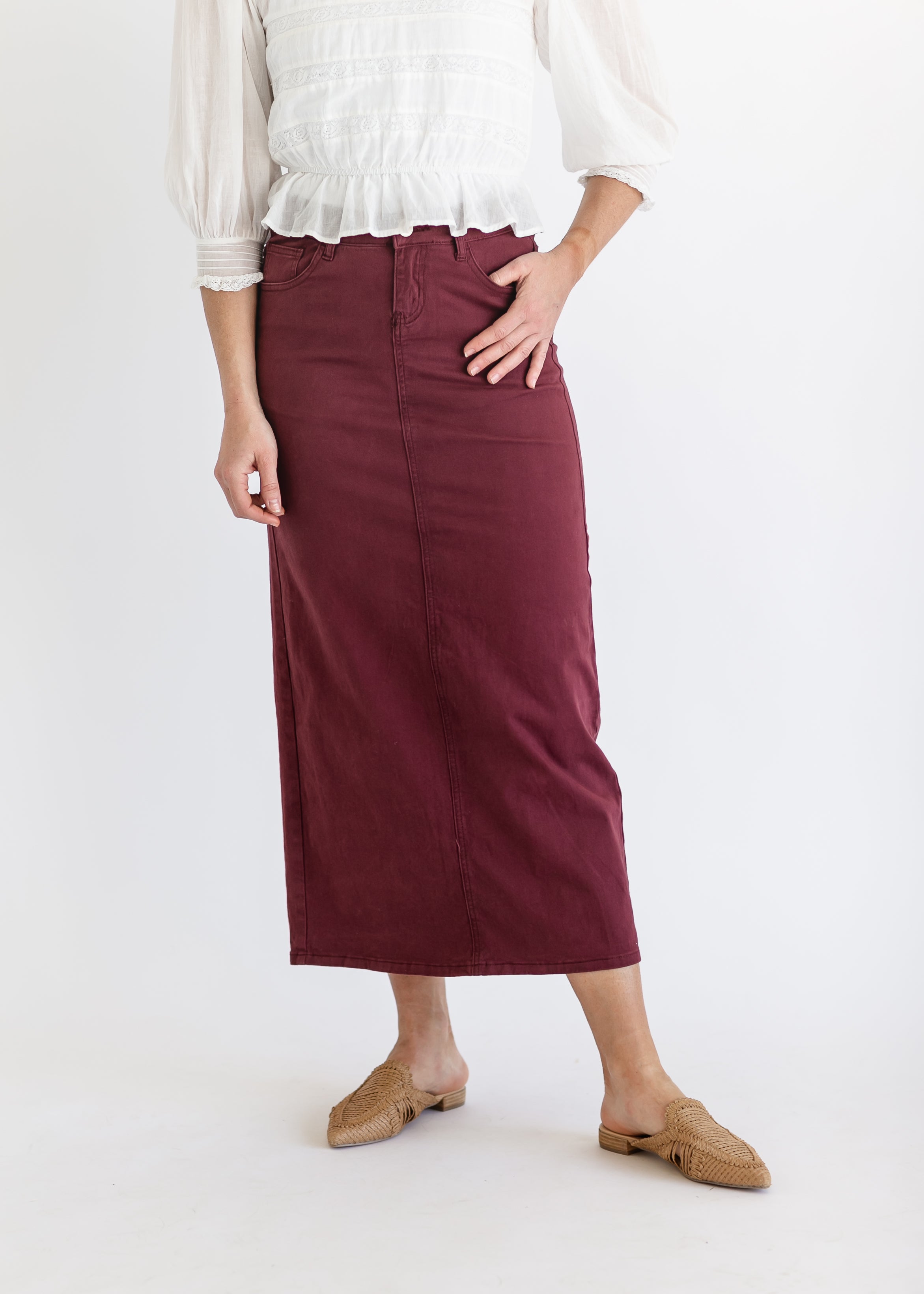 An Inherit Design, the Stella Burgundy Denim Maxi Skirt is a customer favorite we know you'll love. Now available in this beautiful warm mauve hue, this skirt is a wardrobe staple and one of our best sellers! The long denim is accented by a silver button with the Inherit Badge Logo and is tailored in a straight fit. There is a 14" back slit to make walking a breeze! No details were missed with this skirt!
