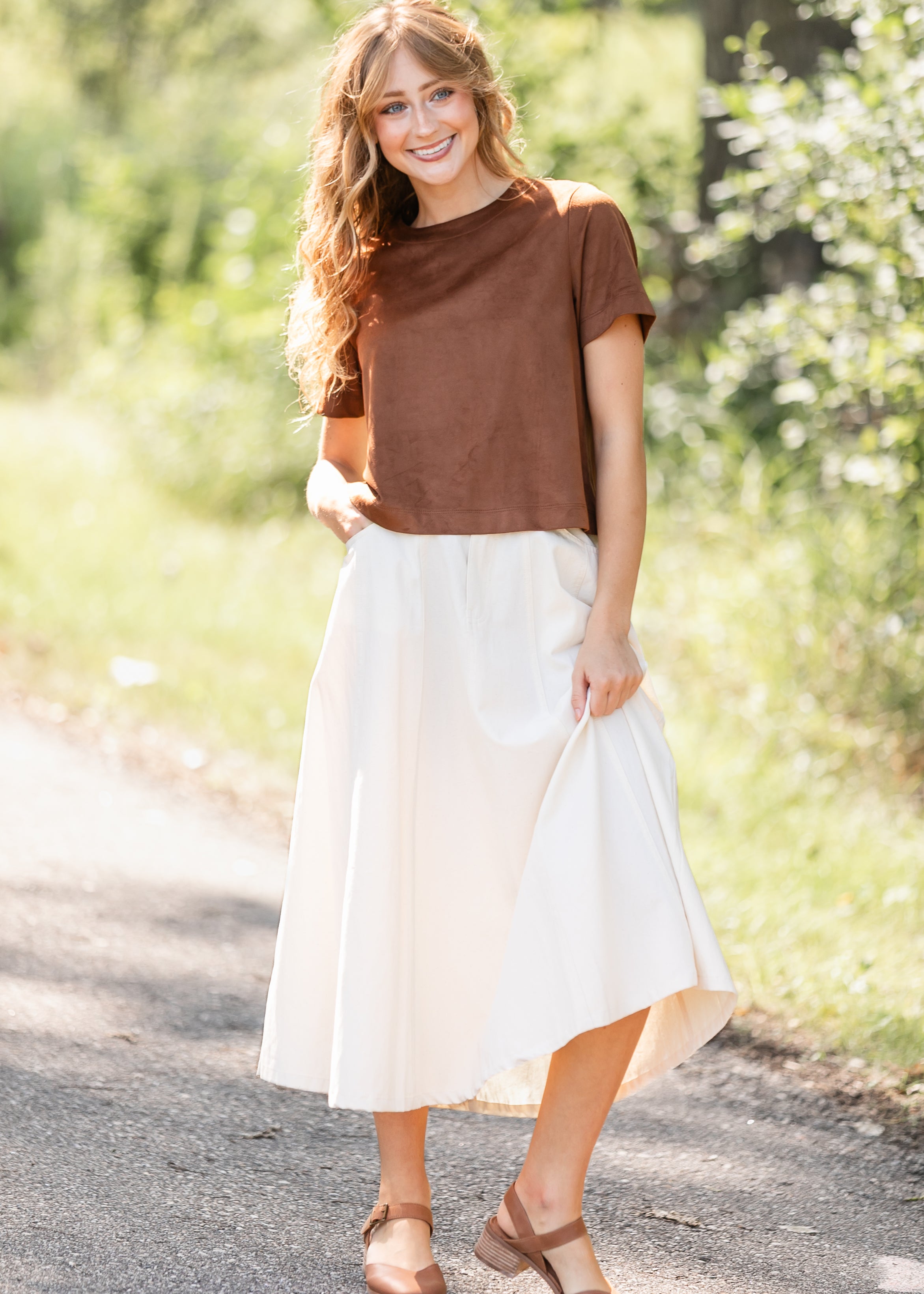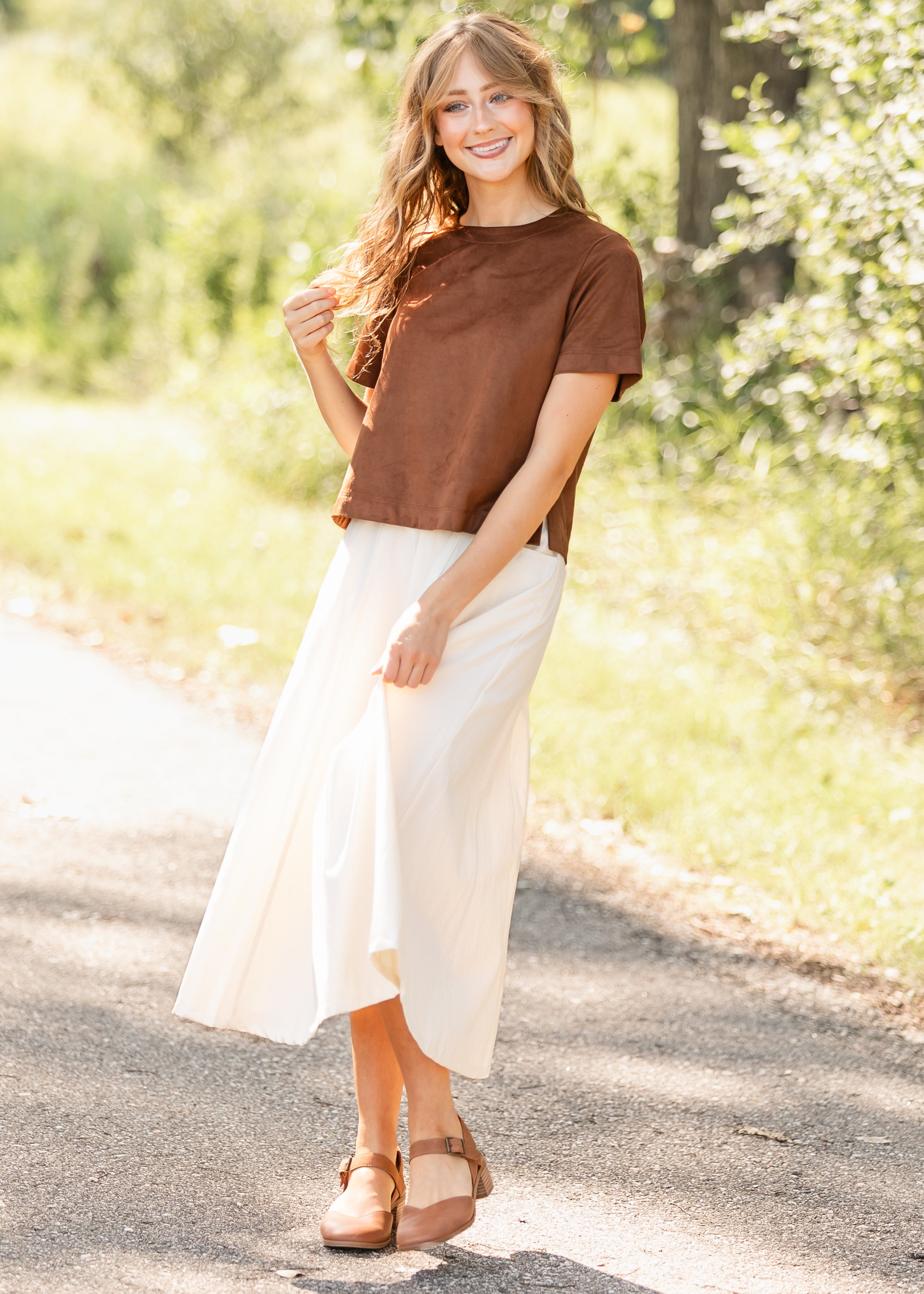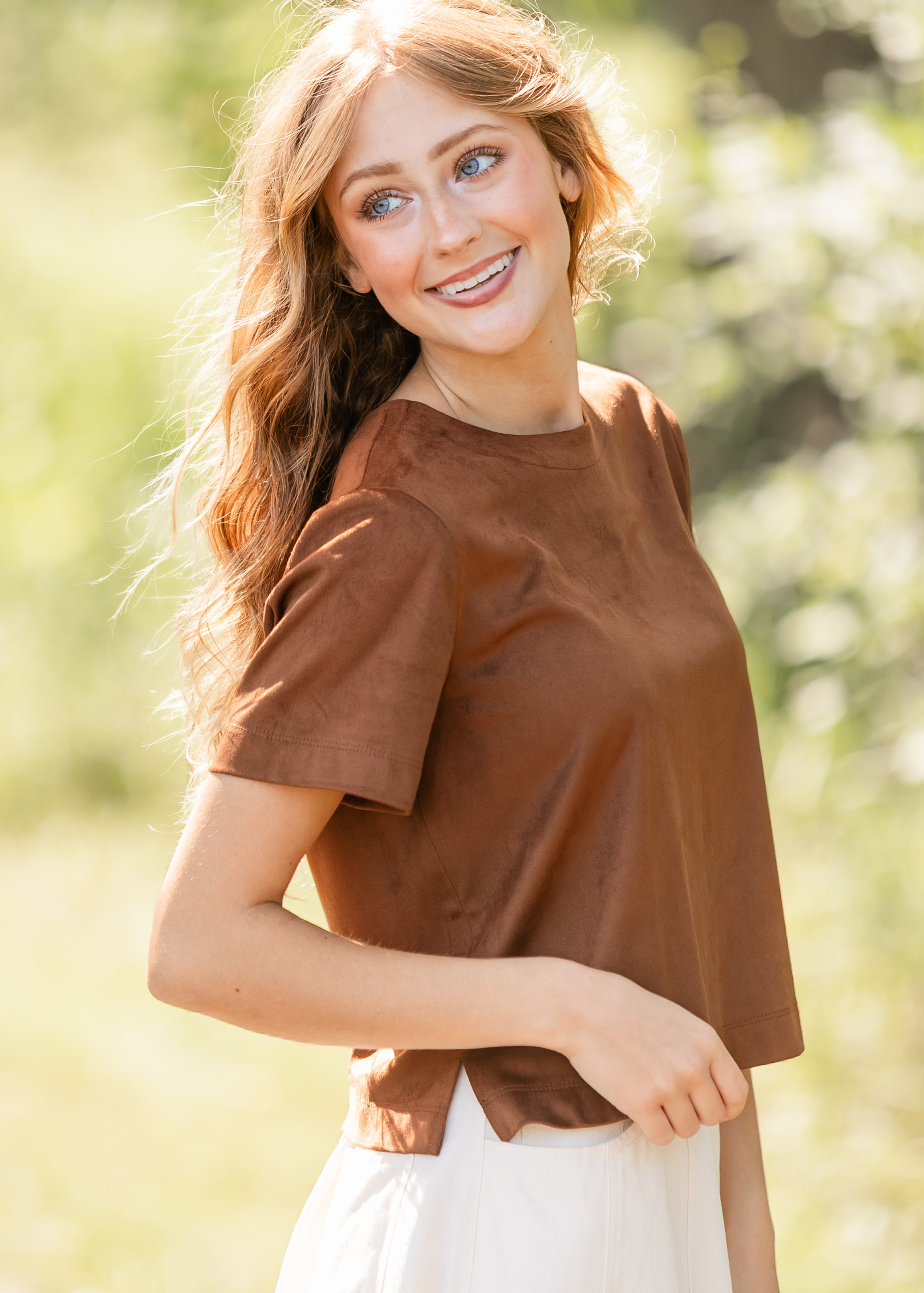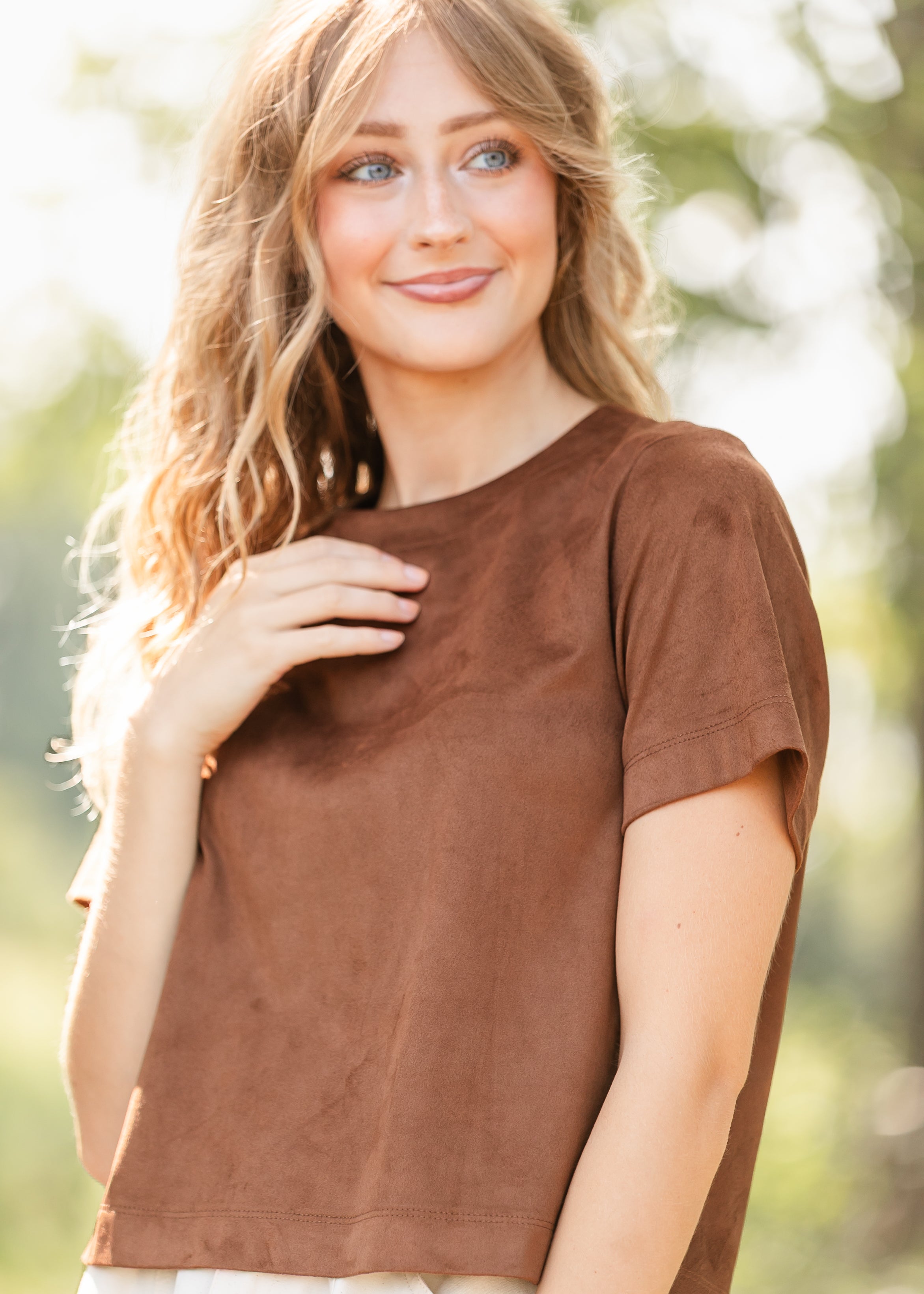 The Steve Madden® Ezra Faux Leather Top brings effortless edge with its soft, suede-like finish and classic crew neckline. Designed in a warm brown hue, this short-sleeve piece pairs beautifully with flowy skirts or denim for a refined yet relaxed style. A versatile staple, it carries you seamlessly from casual afternoons to elevated evenings with understated confidence!