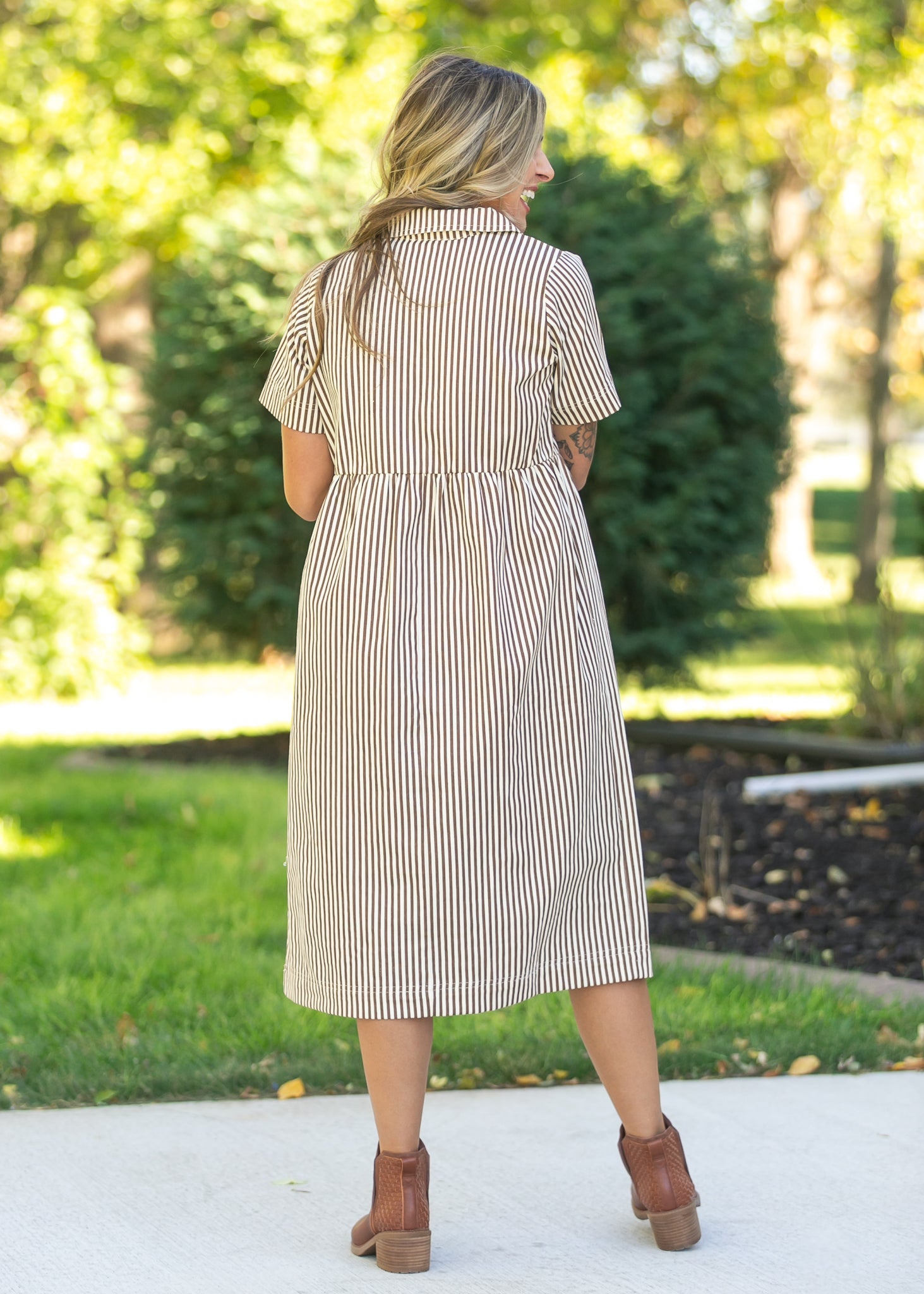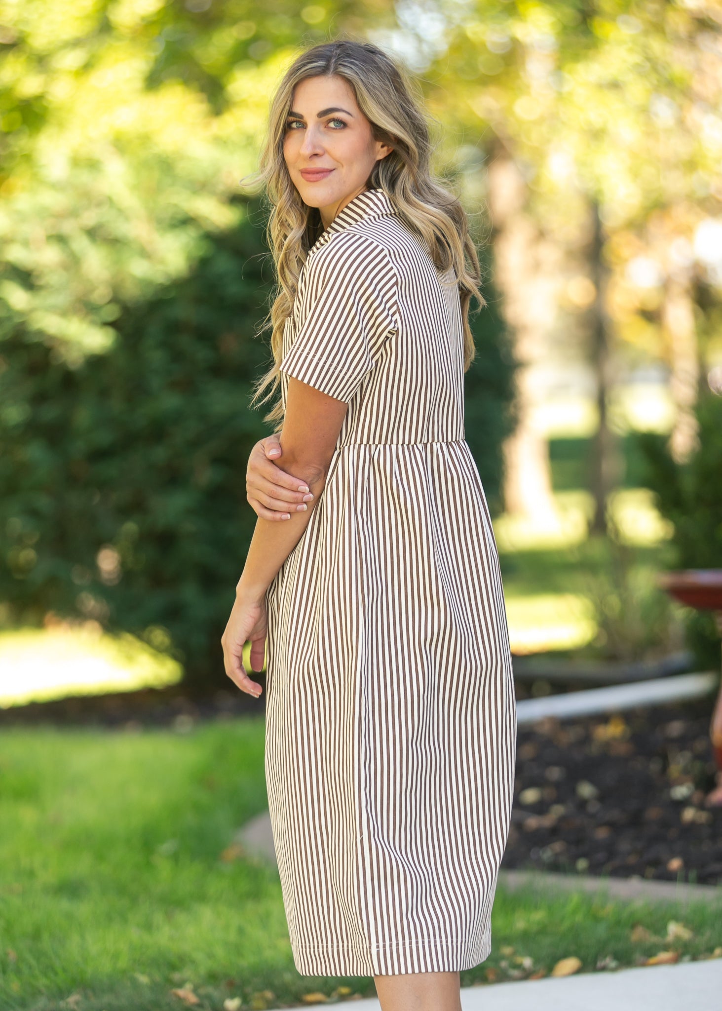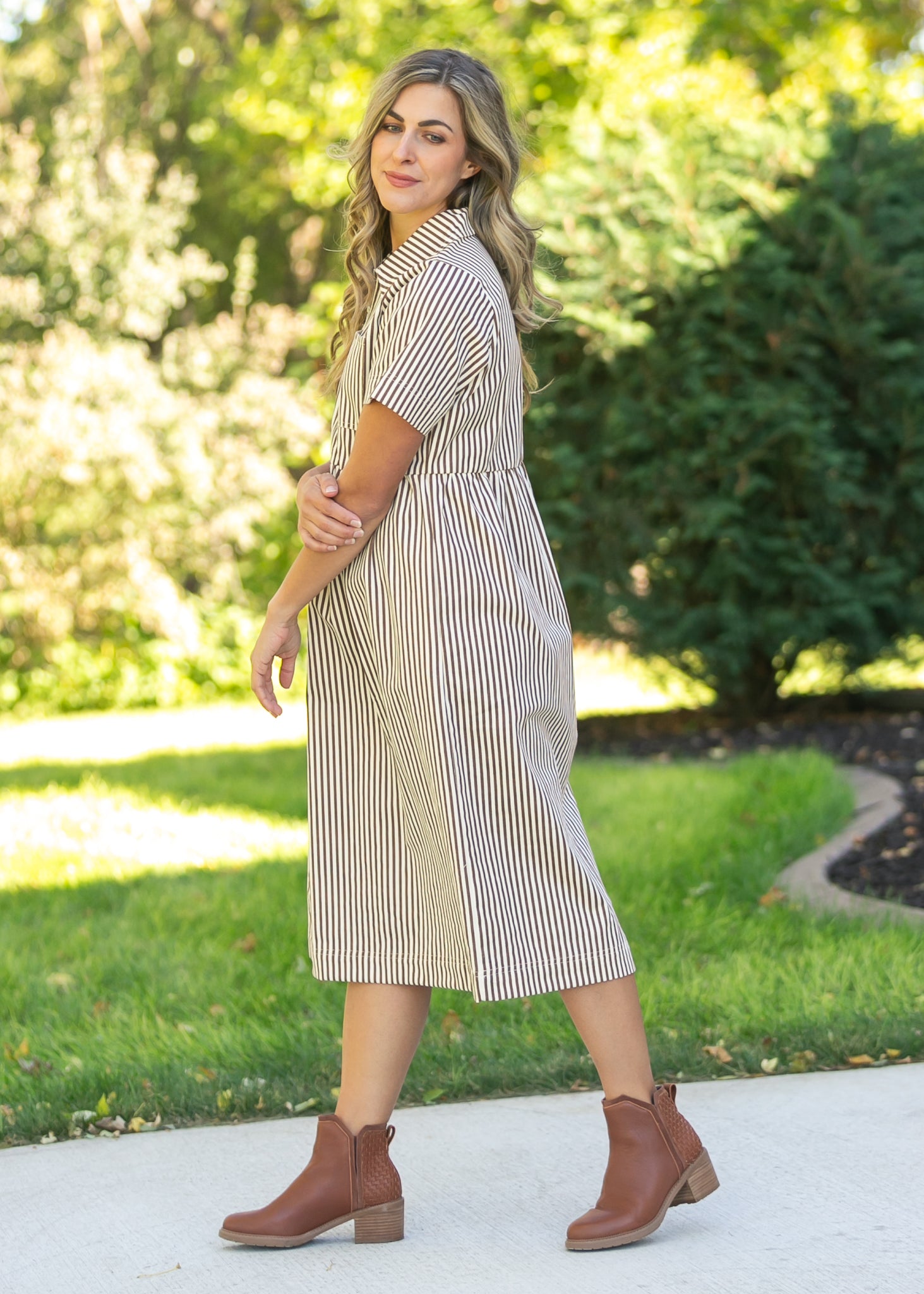 The Stripe Half Zip Midi Dress blends effortless grace with everyday comfort. Crafted with a modest silhouette, it features vertical brown and cream stripes, a functional half zip front, and handy side pockets. The gathered waist adds soft shape, while the collared neckline gives timeless polish. Style it with a cozy cardigan and brown boots for an easy, faith-filled look that feels beautifully you.