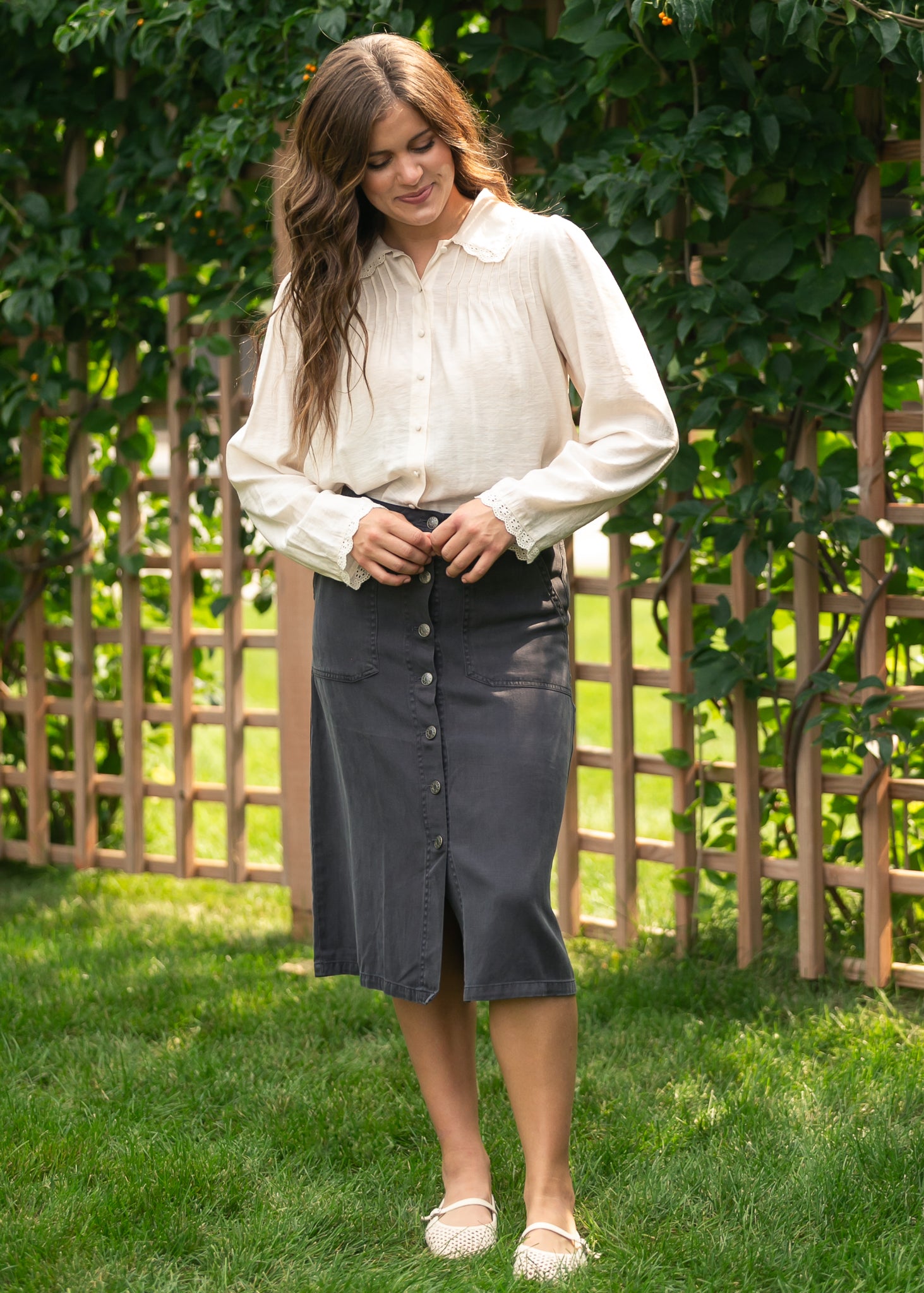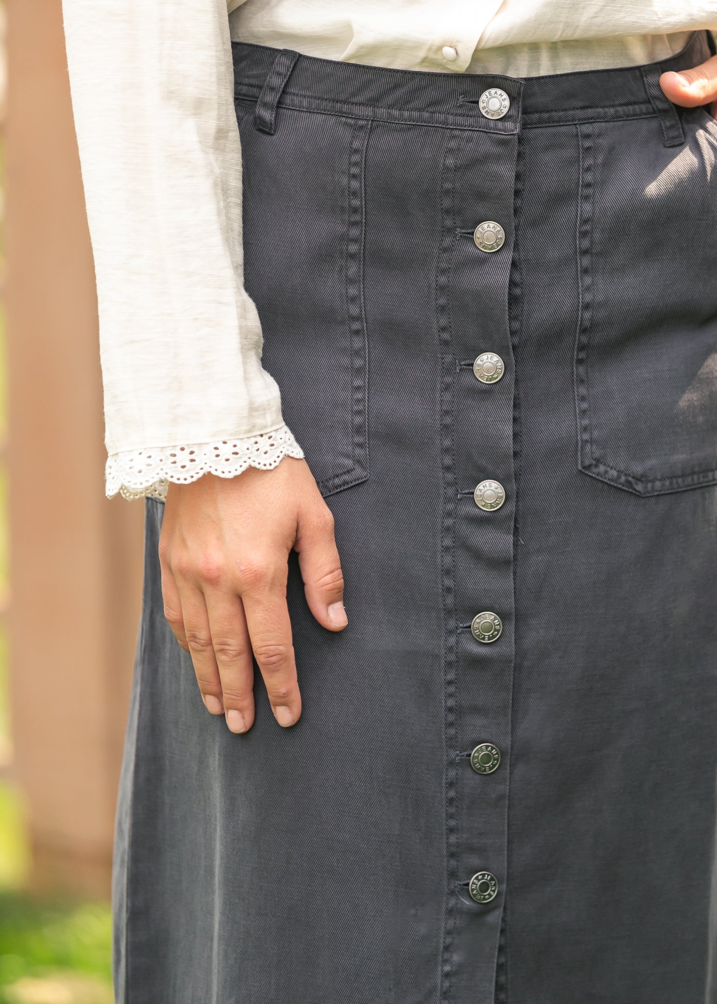 The Tencel Button Up Skirt is a timeless staple made with breathable softness and graceful movement. Featuring a flattering A-line silhouette, functional front buttons, and practical pockets, it balances everyday ease with elevated style. Pair it with a tucked blouse for Sunday best or a simple knit top for casual outings, offering modest versatility you’ll love season after season.