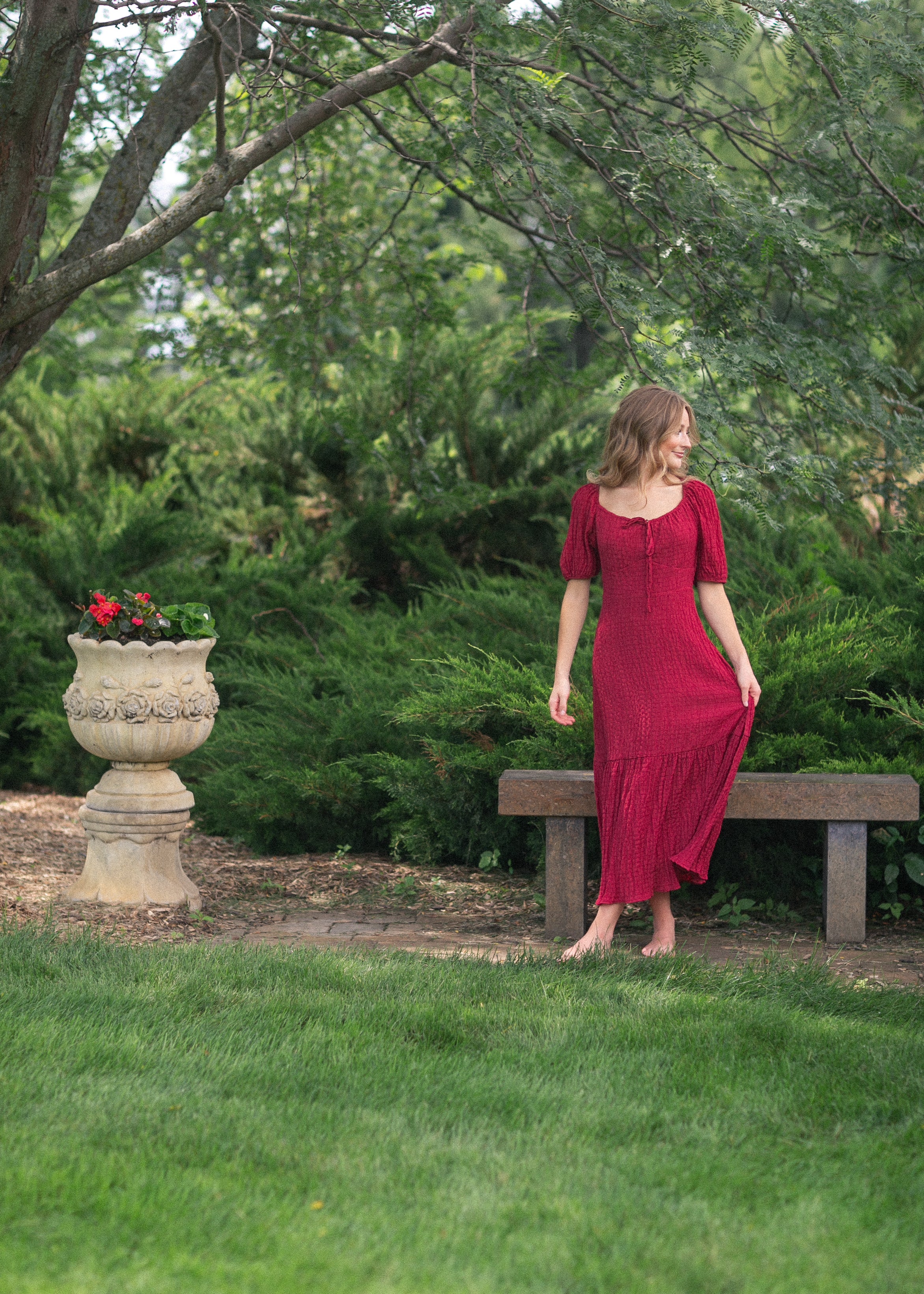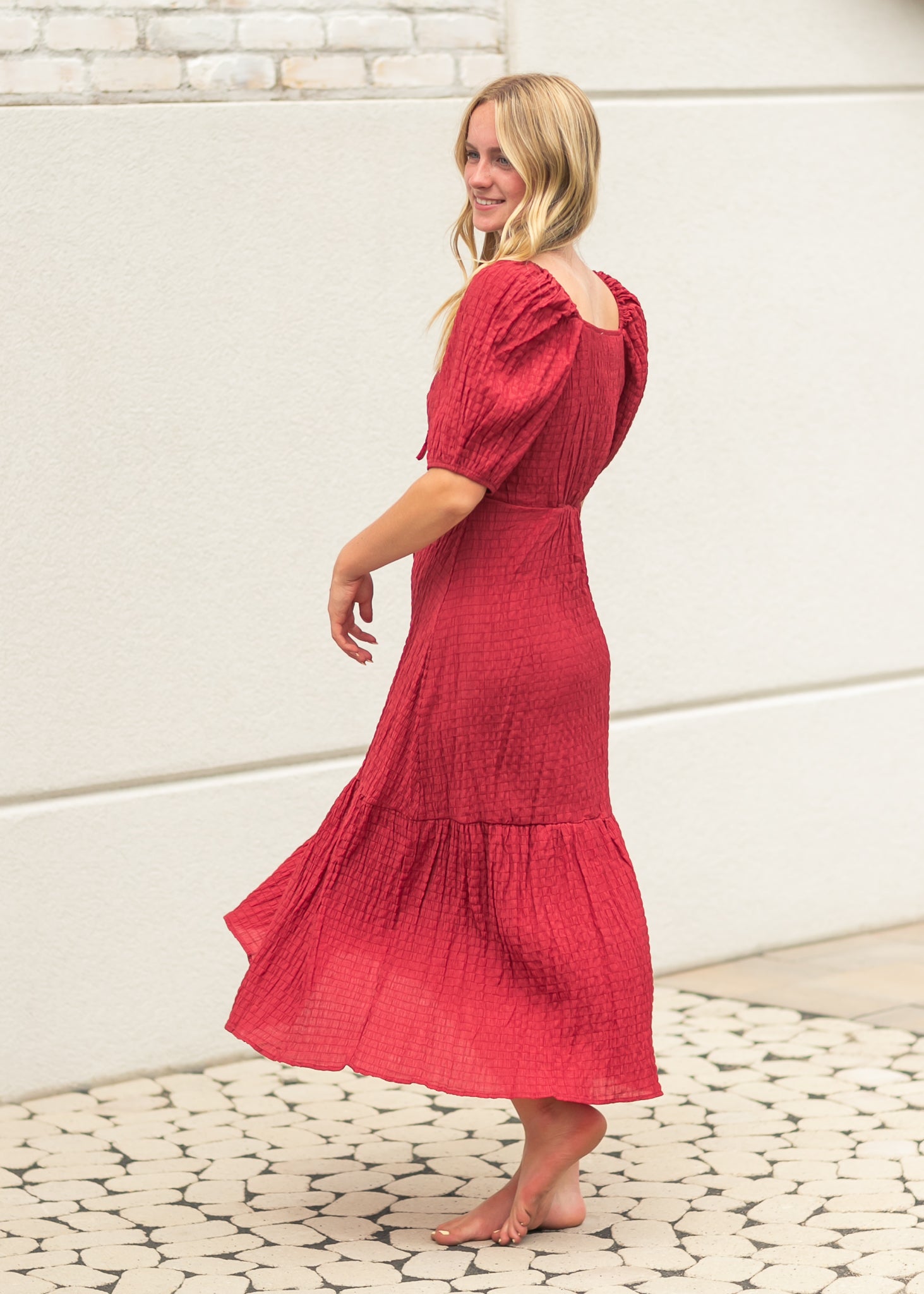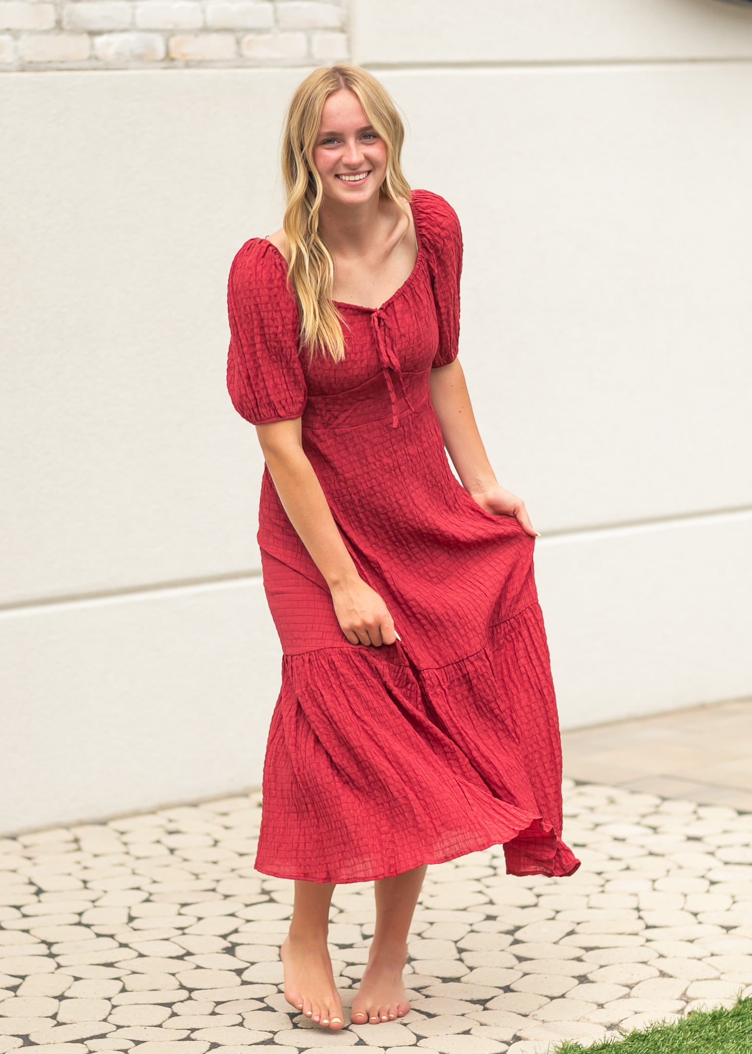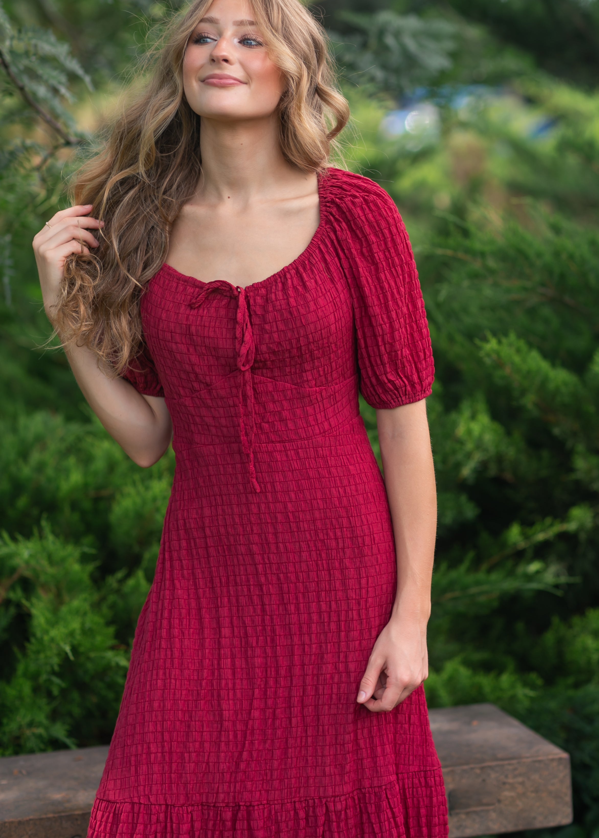 This Textured Woven Midi Dress brings vintage romance to life with its feminine tie-front detail, gathered puff sleeves, and tiered hemline. The rich berry hue and softly crinkled fabric create dimension while offering a graceful silhouette that flatters without clinging. Lightweight and breathable, this modest dress is ideal for fall events, Sunday service, or everyday elegance.